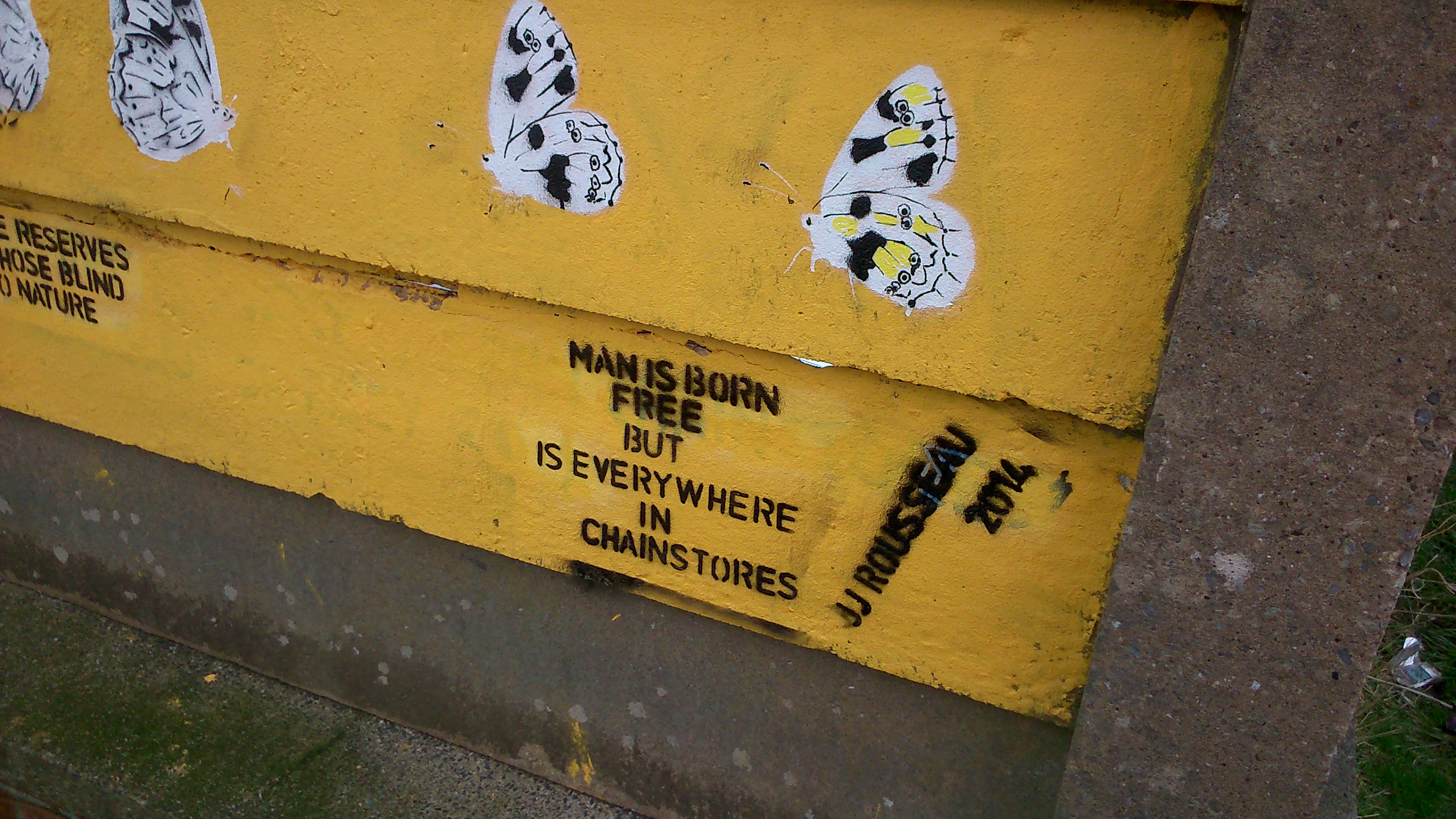 DSC_0108Meanwhile… this graffiti patch on the wall beside the canal, on the approach to Junction Bridge and Dockfields, has become a bit of a local battlefield. You can see from the paintwork that the more political statements have been painted over — presumably by the Council (?) — and then RE-stencilled again by the activists. What’s interesting here is that nobody attempted to just erase the whole thing… It’s a nice patch of colour on a nasty grey wall, after all, with pretty butterfly pictures on it… So if we just take away the complaints about capitalism, maybe it’ll all be OK? The yellow has of course been chosen, though, because of it’s connection to the yellow livery of Bradford-based retail chain Morrisons… who are planning to build a big old supermarket next to Bradford Beck only a couple of hundred yards from this spot…