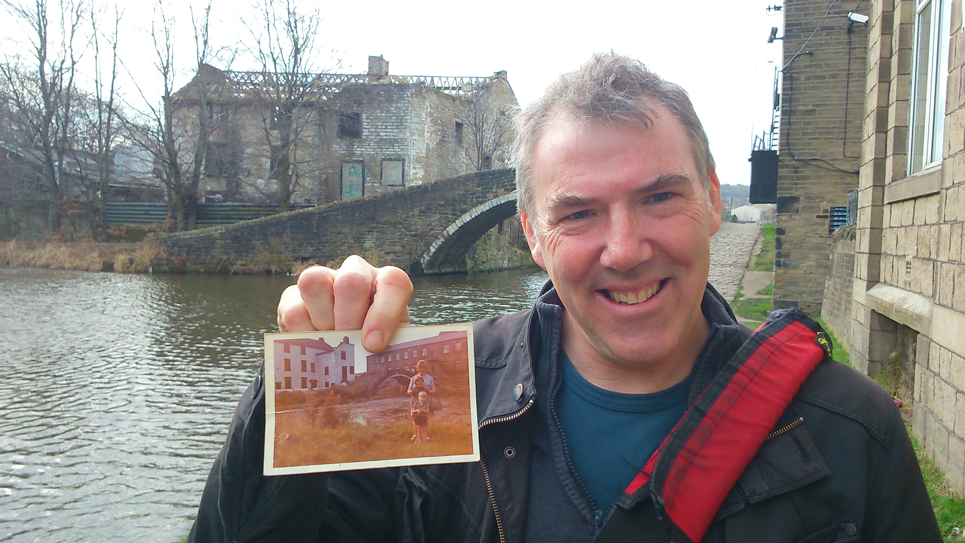 This is Chris Uttley, who grew up on Dockfield Road. He’s holding up a 1970s photo showing himself (the little one), his brother, and his grandmother, standing in front of Junction Bridge on the Leeds-Liverpool canal — where it intersects with the now filled-in Bradford Canal. This photo is taken from the opposite bank to the one Chris is holding, since there are new-build flats occupying the space in that photo now. But you can still clearly see the bridge, and Junction House to its left, in both pictures. It’s disheartening to realise that the sorry state of disrepair into which Junction House has fallen has been within Chris’s lifetime. (And those trees now in front of it are clearly younger than him.)