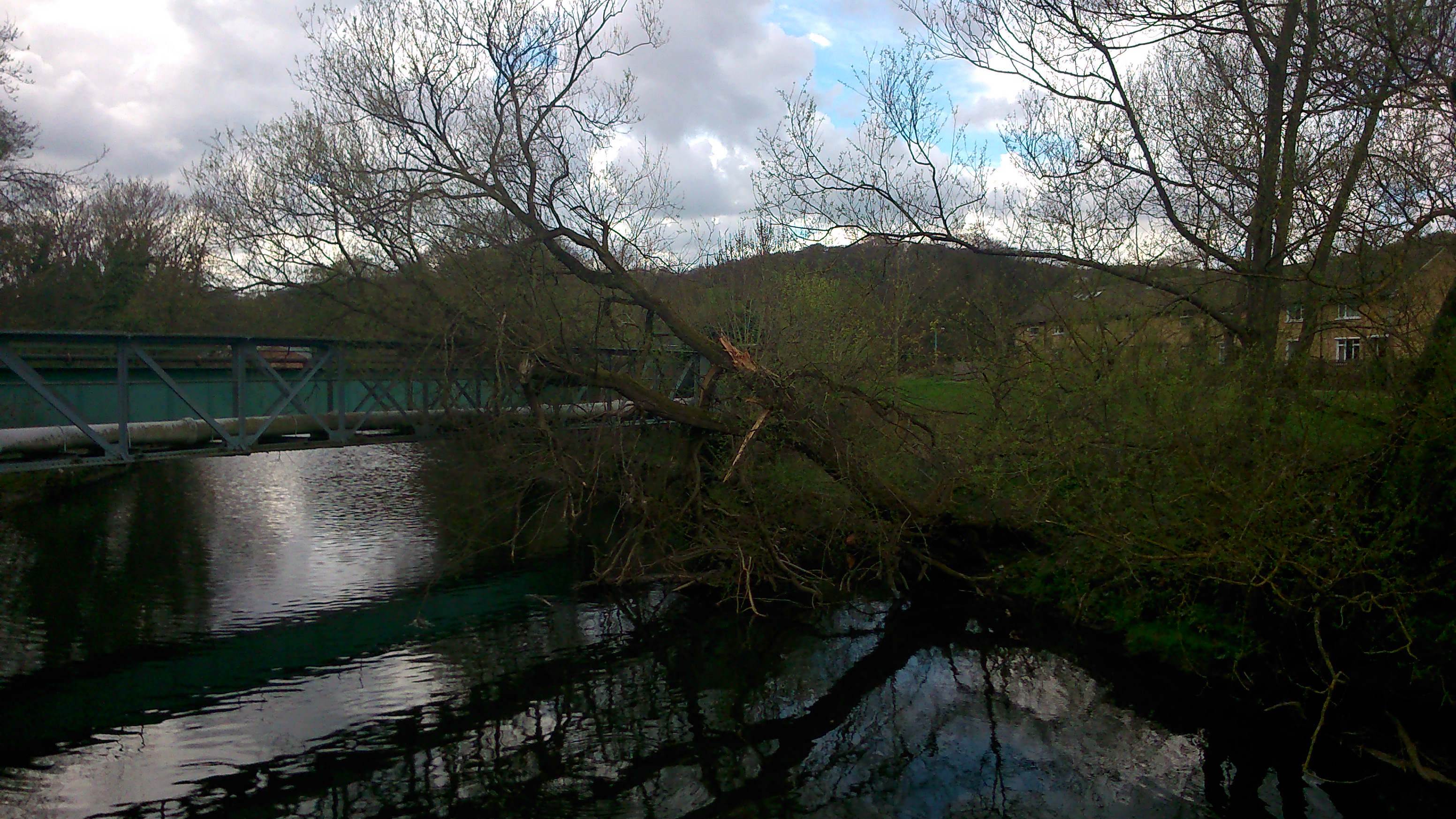 DSC_0227This tree came down, Pat says, in just the last week or so, given the high winds and rain we’ve been having. It has fallen across the pipe bridge of the Graincliffe Acqeduct (which carries Shipley’s water supply down from the moor and across the Aire at the end of the estate). If this large tree ends up in the river — as seems inevitable — it could end up causing a serious obstacle in the water … it might catching on Saltaire weir, where another tree has also lodged recently… If it got downstream as far as Baildon Bridge, it could create a serious damming hazard there (a recurring problem there, which has caused flooding in the past). The question is, though, who is responsible for clearing the tree? If it was actually in the river, it would be the Environment Agency’s job to clear it — but placed where it is, suspended on the acqueduct, it may be Bradford Council’s… One of those tricky jurisdictional issues that often don’t get solved easily. All the more important, maybe, that local community members take the initiative sometimes?
