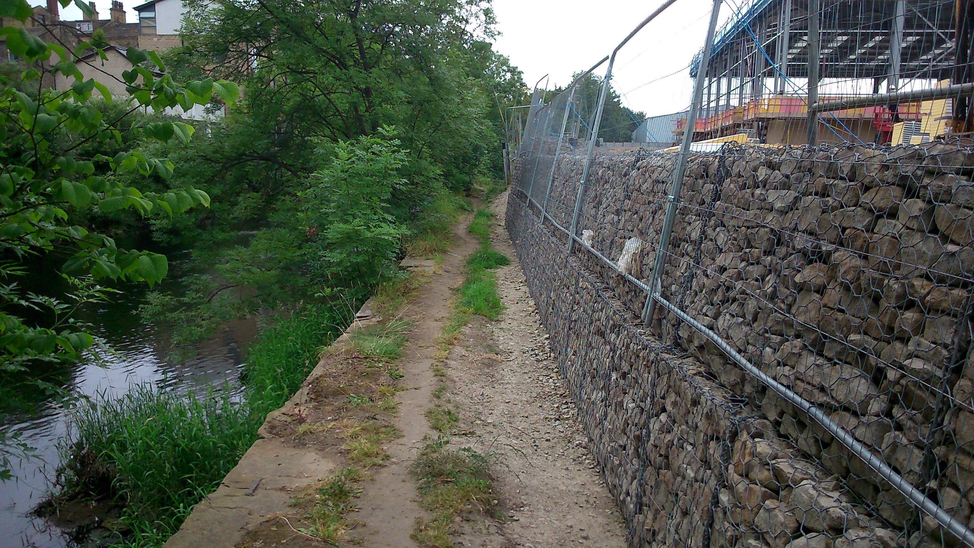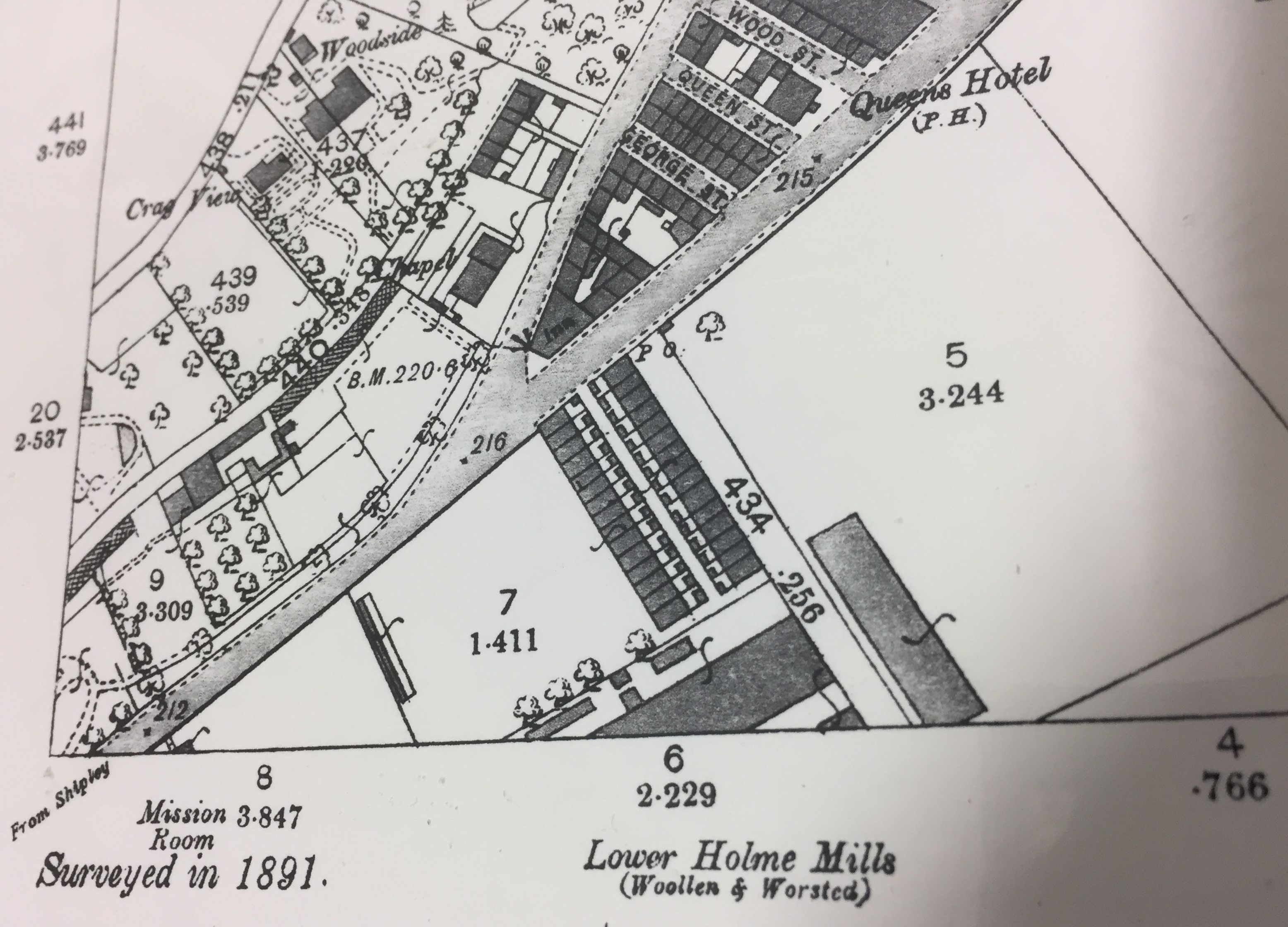 Notice, though, how the riverside worsted mill has now been dwarfed by the erection of the Lower Holme mill, directly across the river. This Baildon site, bought up by Titus Salt in 1850 (apparently before he decided where to site Saltaire), was sold on to C.F. Taylor in 1862, and it was Taylor who then built the large mill building next to the river (again, water supply…). He must also have been responsible for building the bridge across the river, in order to connect to Dock Lane and, thus, the canal dock. Although the present, 1960s bridge structure is just a footbridge, it must originally have been wide enough for wagons — which also explains why the road running down to it has always been full road-width (at least until the arrival of the controversial “landscaping” — aka a long row of dumped earth — that was left along the edge of the Wickes overspill car park when the site was redeveloped in 2014… still a sore point with residents!).