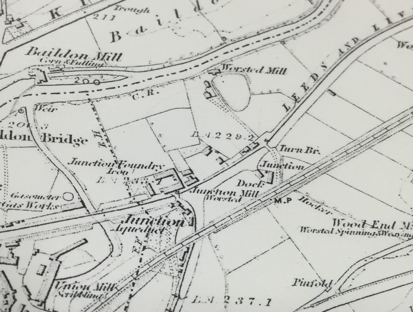 Neither of these two new mills would have had water wheels (or their attendant weirs). This was now the age of steam engines. But still, you need water to make steam. Junction Mill appears to have been getting its supply from the river via the “Junction Aqueduct” (Salts Mill had a similar pipeline set-up), but the smaller worsted mill had clearly opted to site itself right next to the river. This meant that it didn’t face onto the canal, as Junction Mill did, so to get access to this vital transport and haulage route, a road of sorts has been constructed between the mill and a small “Dock” on the southern edge of the canal. And a swing bridge (or “Turn Bridge”) has been installed to provide access across the canal itself. Notice that, at this stage, Dock Lane does not appear to extend any further: it is literally just a lane linking the riverside mill to the canal dock.