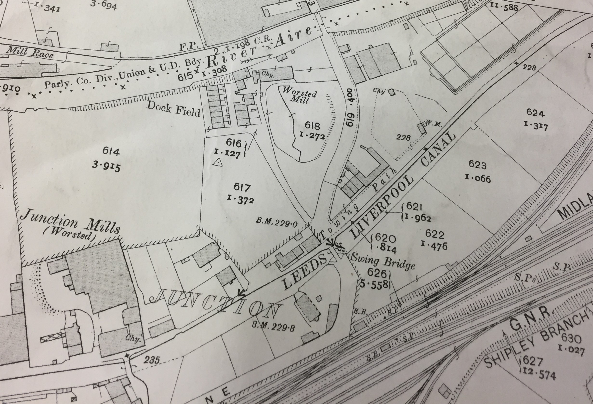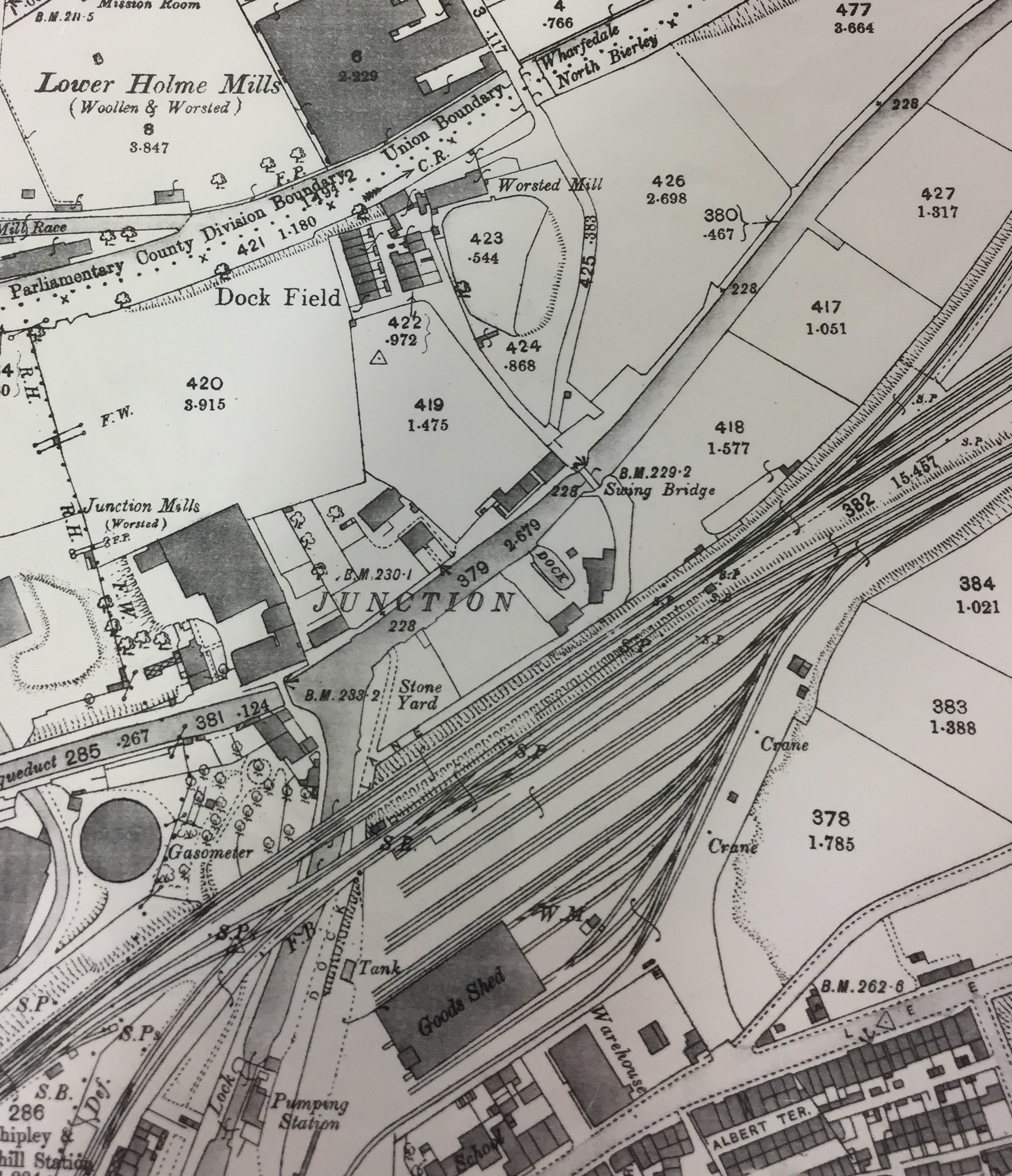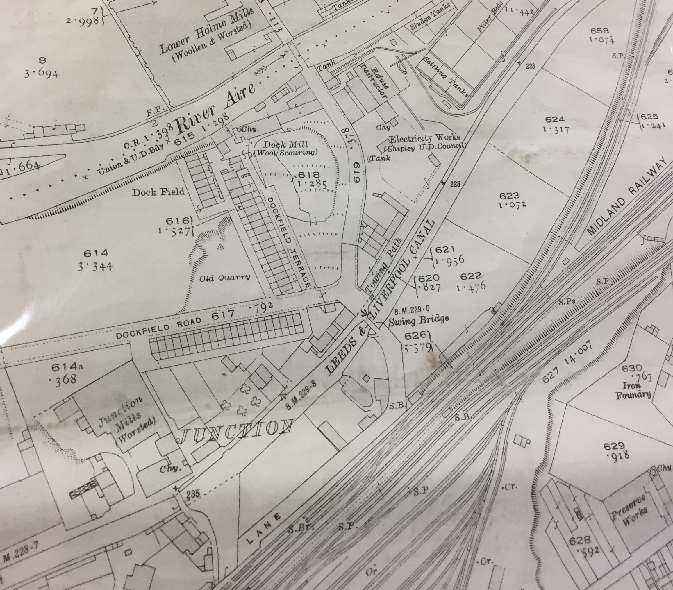 This time last year, I was trying to keep this blog updated with the crisis that was the Boxing Day flood of 2015. Thankfully, things have been a lot quieter this Christmas, so I’ve been able to devote a bit of ‘down time’ to some more historical water stories. Specifically, I’ve been puzzling over old maps, trying to figure out the history of how homes and industry developed in the Dockfield area of Shipley (and the Lower Holme area of Baildon, just across the river footbridge). It’s more fun than a jigsaw puzzle…
