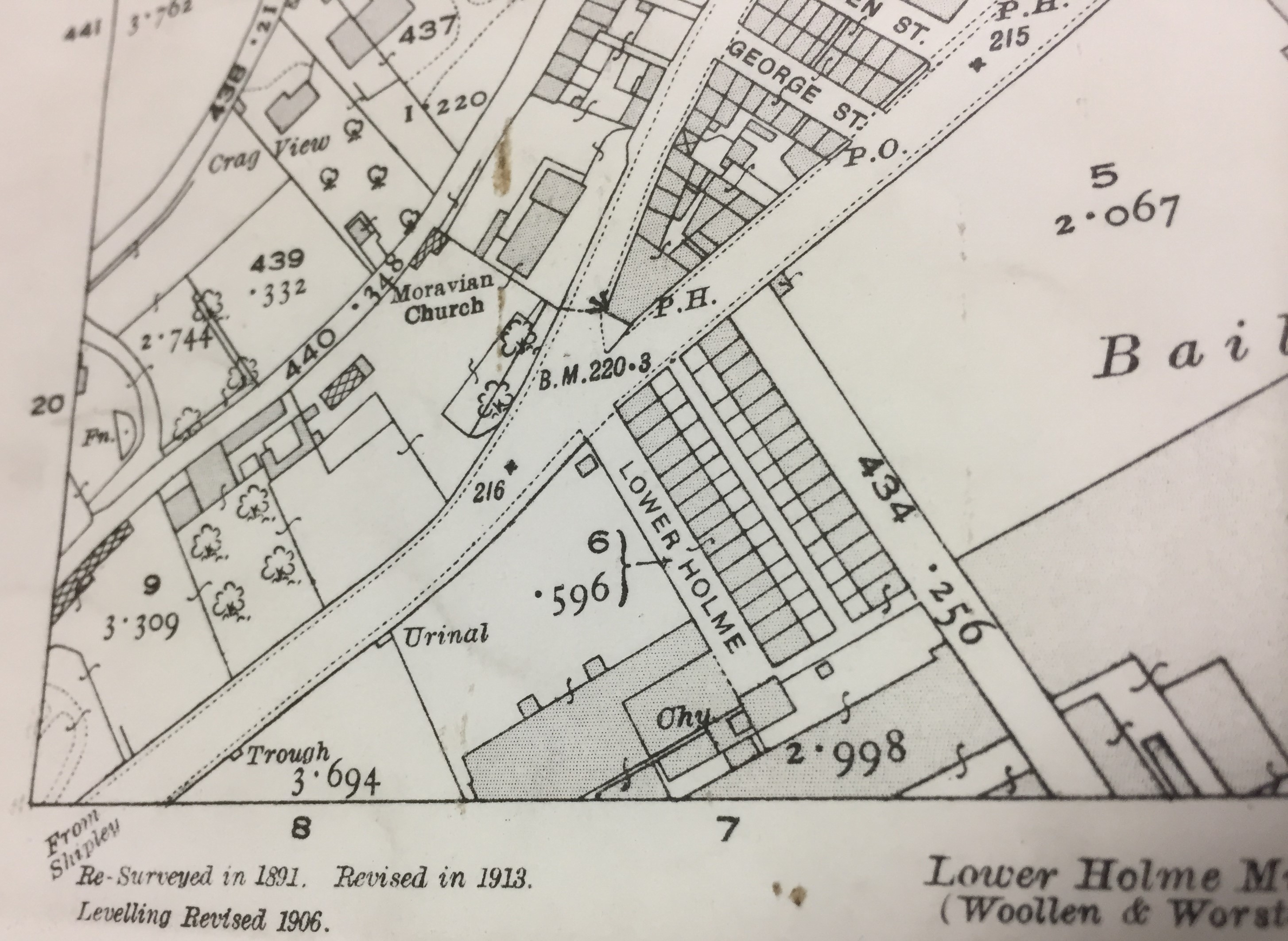 Jump forward to the 1913 revision (above), and the Lower Holme mill works are starting to encroach on the land west of the houses. There’s also been more development on the site to the east (also originally part of Taylor’s operation). And along the main road, notice the apperance of “Urinal” and “Trough” — all part of the public sanitation drive being pursued by Baildon Urban District Council at this time, in parallel with Shipley’s.
