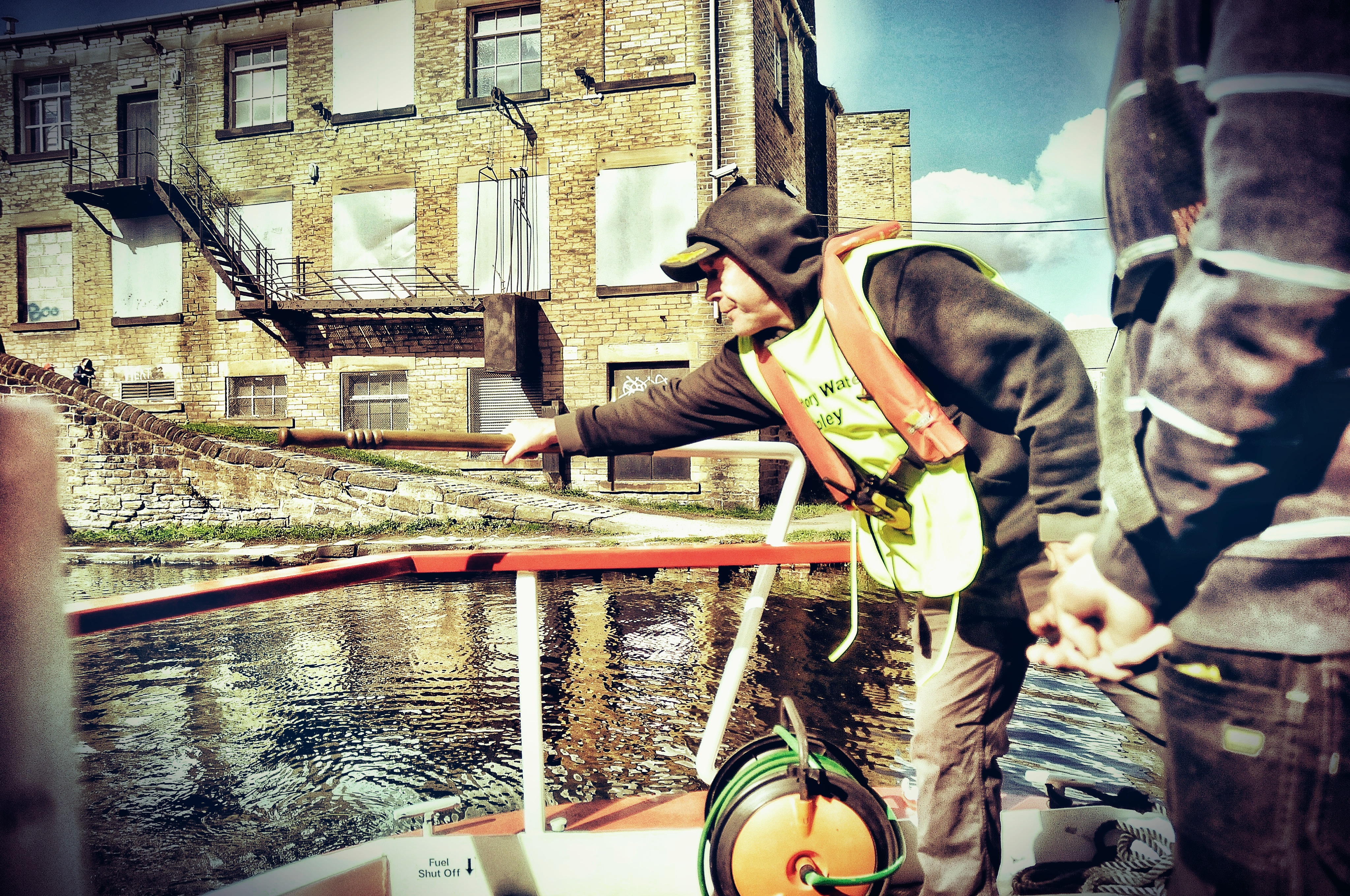 Your guide and narrator is Steve Bottoms, and our boat is the Angus Ferguson, a community barge based at nearby Apperley Bridge and skippered by Graham Thorpe.