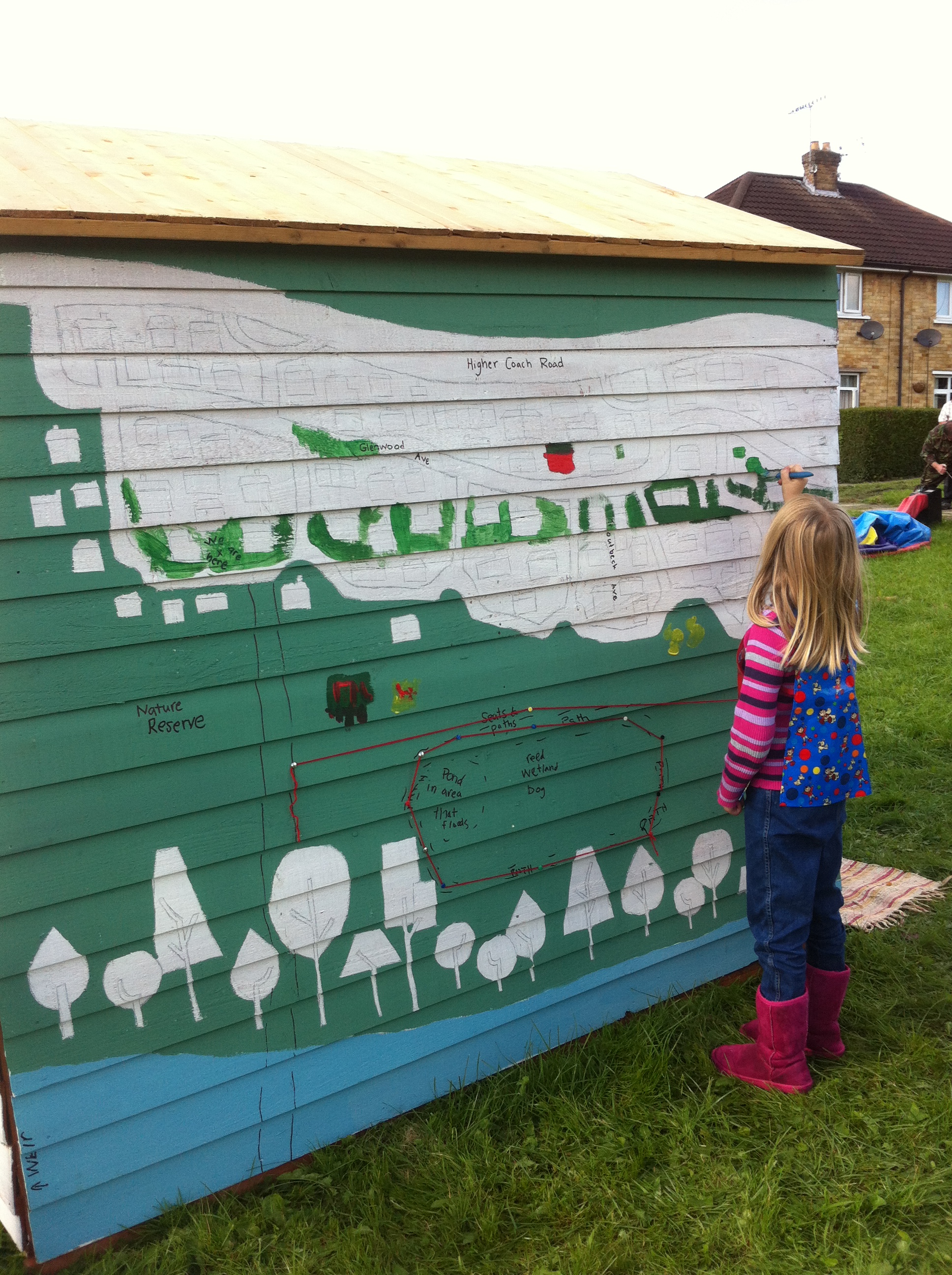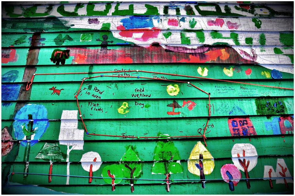 A number of residents wanted to argue for a “Denso’s”-style wetland nature reserve being established on the habitually boggy green space between the river and houses. This might be a good idea both from a ‘biodiversity’ point of view (there’d be still more wildlife for residents to appreciate) and a ‘flood storage’ point of view (wetlands hold water better rather than allowing it simply to run off towards the already over-full river in high water conditions). On the other hand, though, some residents were concerned that making a wet area still wetter, in close proximity to housing, might be a safety concern for families with children etc. This debate about possible futures was lively and (as you can see) well-illustrated!