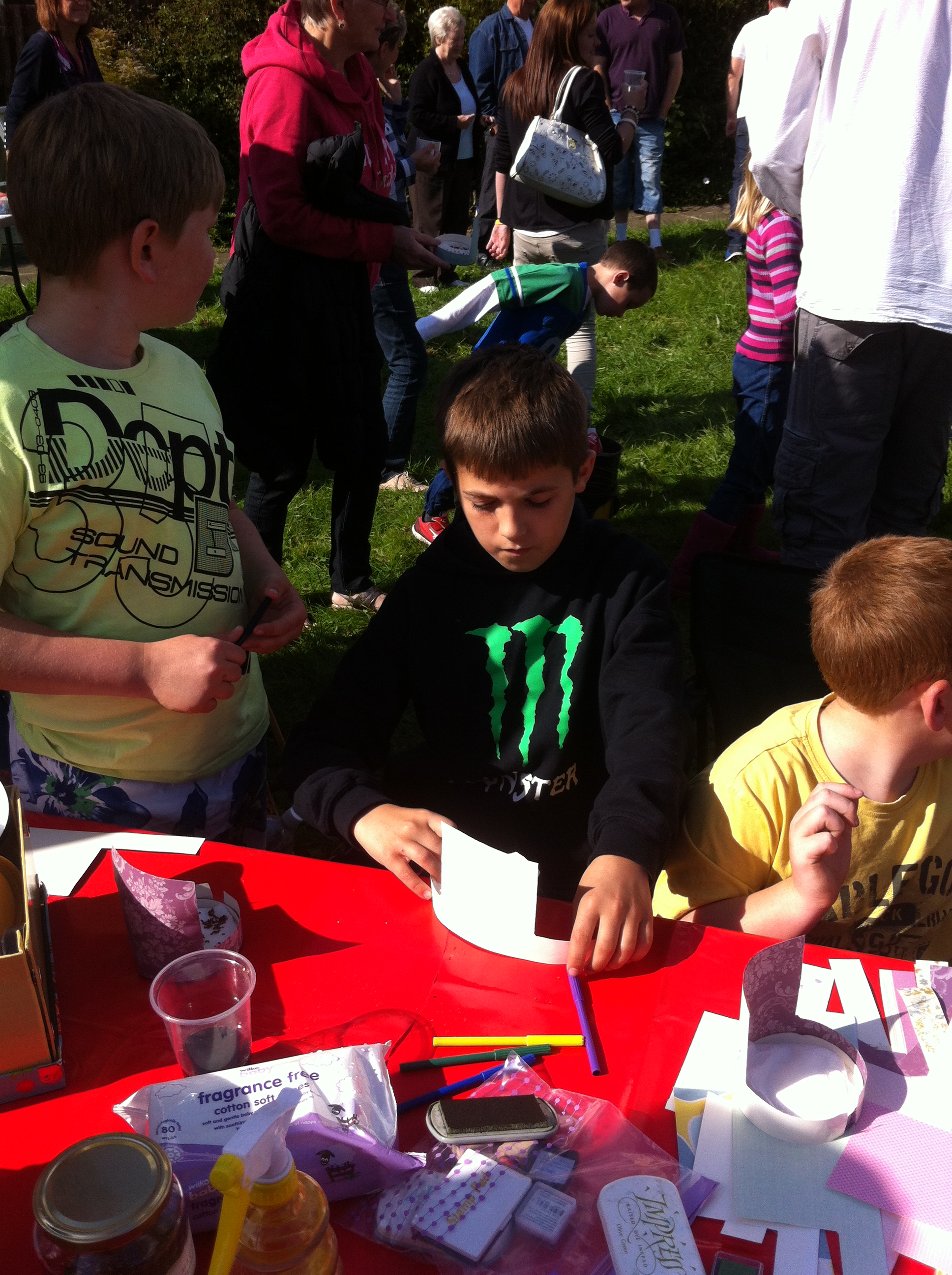 A small collection of “beach huts” was erected at the bottom of Bowland Avenue, facing the river (we wanted to put them on the green flood plain area, but it was a bit too boggy that day), and representatives from Bradford Council, the Environment Agency, and the Aire Rivers Trust were on hand in the huts to answer residents’ questions and register their concerns. There were also kids’ activities (including a bouncy castle, craft activities, etc.), a fish-and-chip stall, and a community mapper working with residents to explore how they see the area and what they might like to see in future…