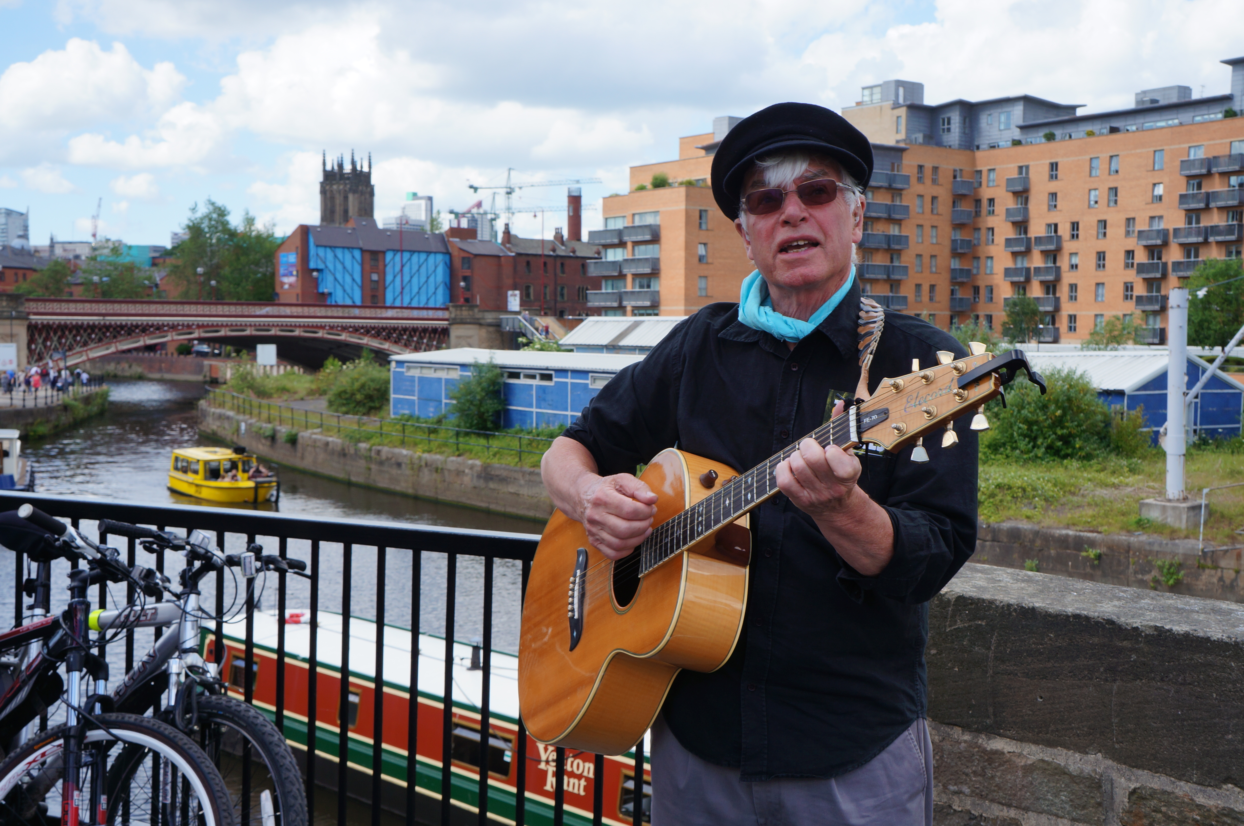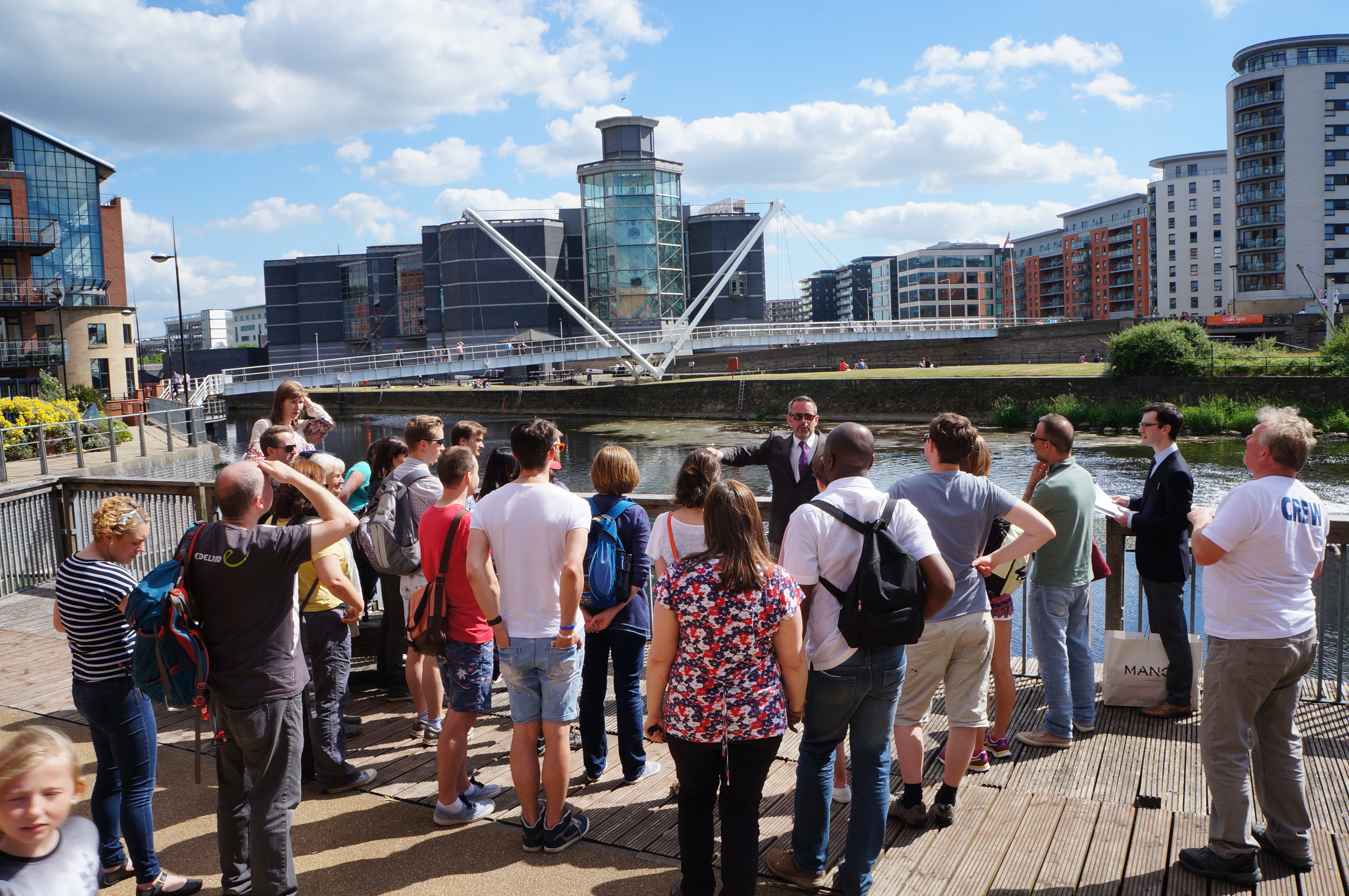 There’s more pictures and documentation of Seven Bridges (Shipley) if you look under the “Performances” tab on our menu bar… But for now, let’s turn our attention to its partner piece, Seven Bridges (Leeds), which we presented on the same dates at the Leeds Waterfront Festival. The idea was to “bridge” the two festival locations, upstream and downstream, if only conceptually… Obviously the Leeds version was on a bigger scale, with bigger bridges, and this one took the form of a guided tour rather than a self-led journey… Here’s musician Eddie Lawler (on a day out from his home in Saltaire) kicking the piece off at Clarence Dock (with Crown Point Bridge in the background) with an old canal song about the founding of the Aire and Calder Navigation, which turned Leeds into a “seaport town” in 1700…