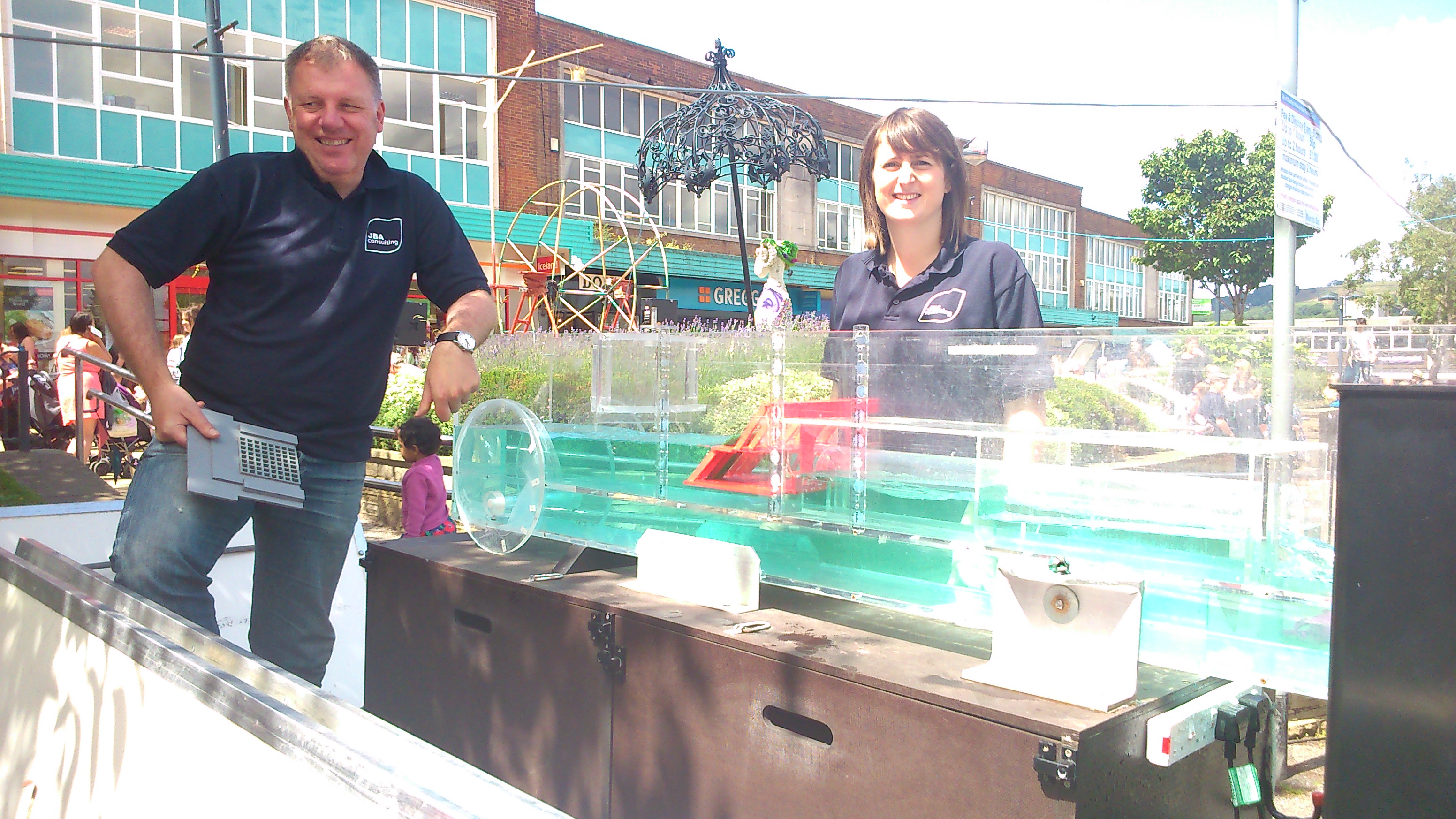 Multi-Story Water was involved in various aspects of the festival — for example, there was a successful screening of our short film Wading to Shipley at the Ibis on the Sunday, and we’d also arranged with JBA Trust (based at Salts Mill) to display their water flume in the town square… It demonstrates different forms of water flow, when you place different kinds of constructions or obstacles in a channel. On one level quite technical, it’s actually really interesting to watch, and there was a lot of curiuos interest from passers-by…
