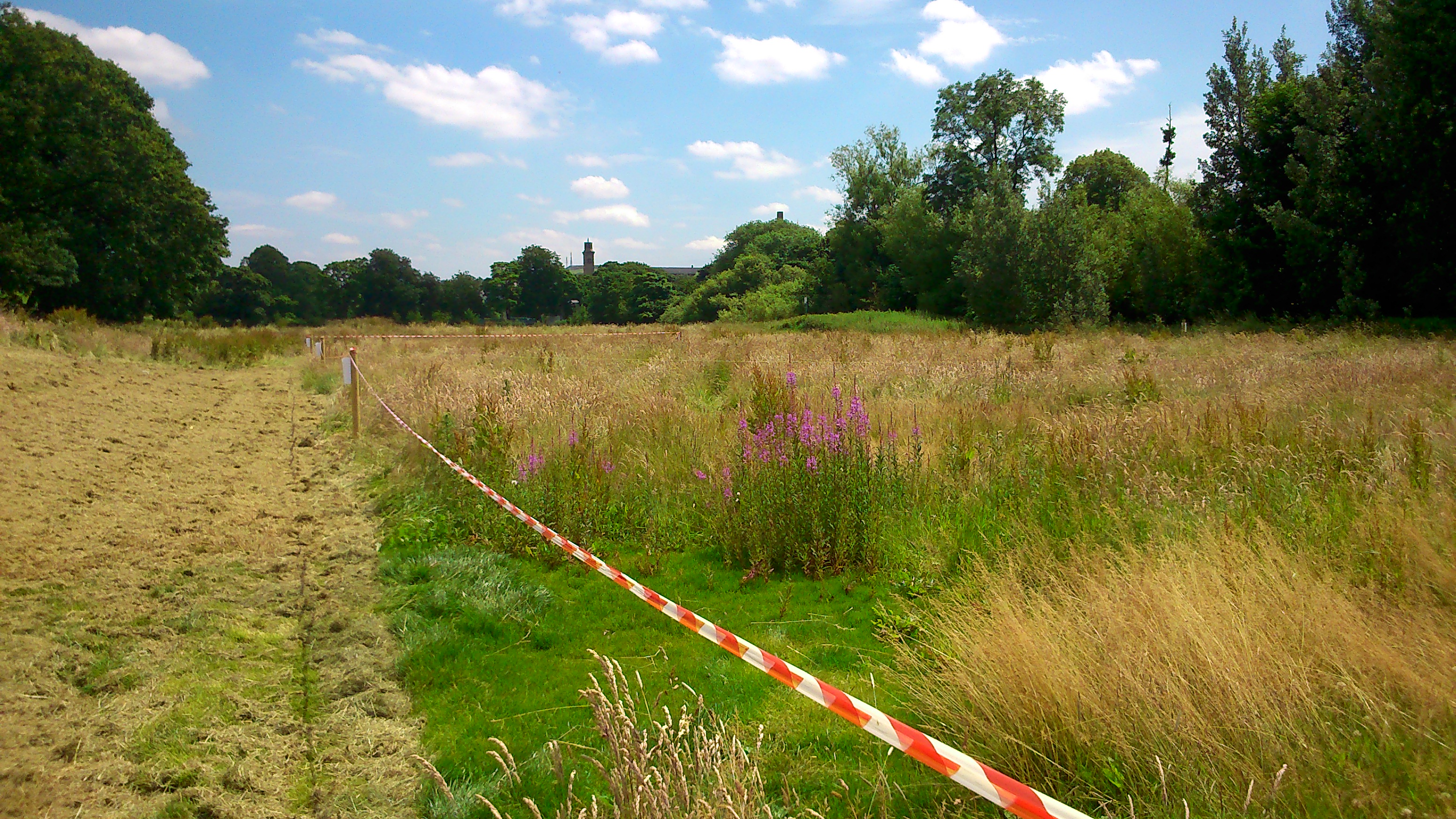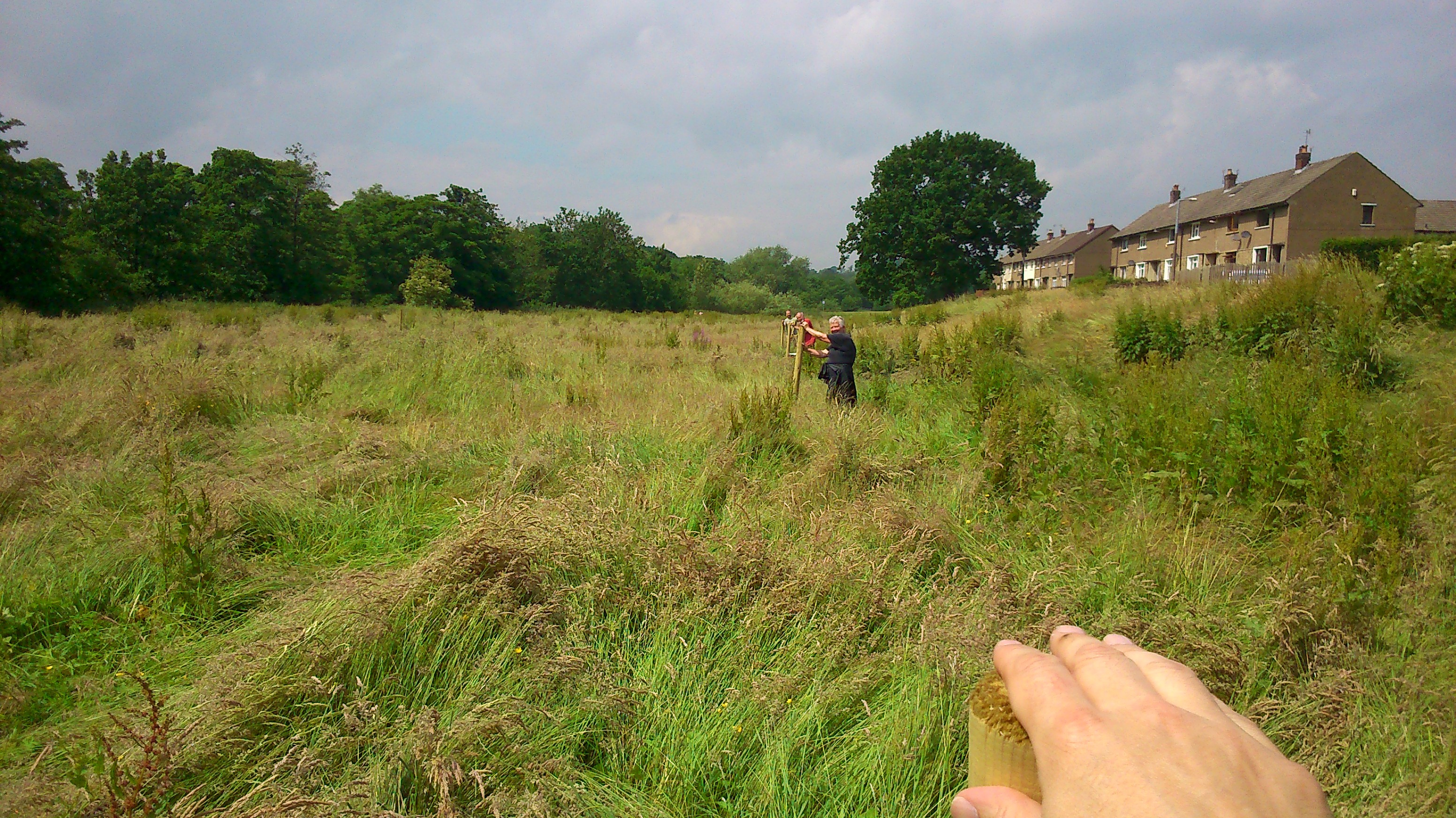 Notice how much longer the grass is than even last month (see previous post, “Meadow Madness”, where it’s much shorter and greener, with more buttercups visible). Basically Bradford Council have said that – with austerity cuts and the resulting loss of manpower and mowers – they will not cut the grass in this field as often as they used to. They did, however, oblige us by at least sparing the time to cut a swathe around our staked-out rectangle, so that by this last weekend, it looked like this: