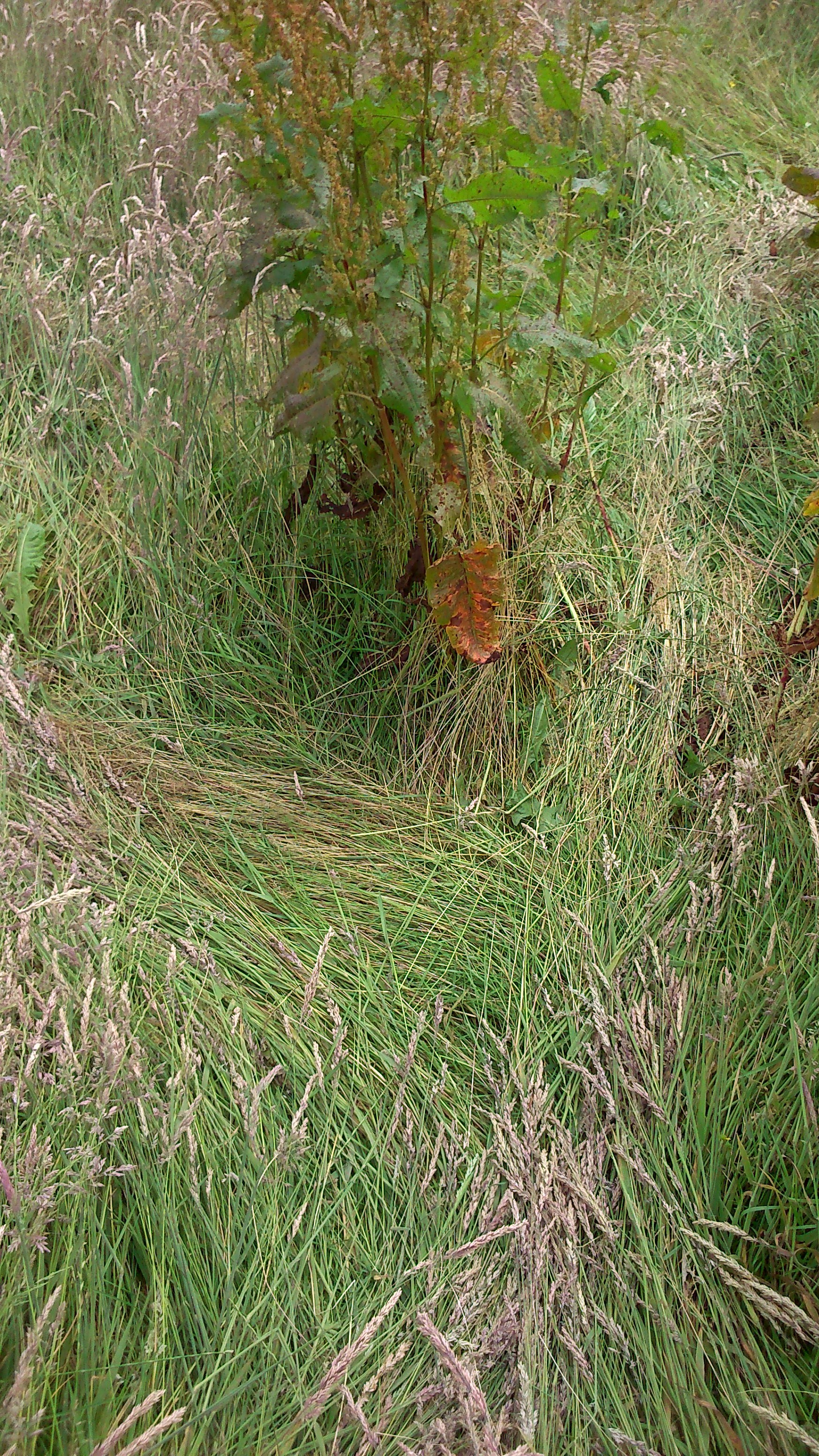 In an attempt to help focus this discussion, by drawing attention to what long grass is actually composed of up close, we created “A Meadow Meander” within the fenced off area. This is a mazy walk created by treading the grass down into a carefully planned set of looping pathways… So for example, in the picture below, you can make out a “Y” junction, where the “lie” of the grass could take you in one of two directions.