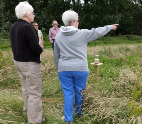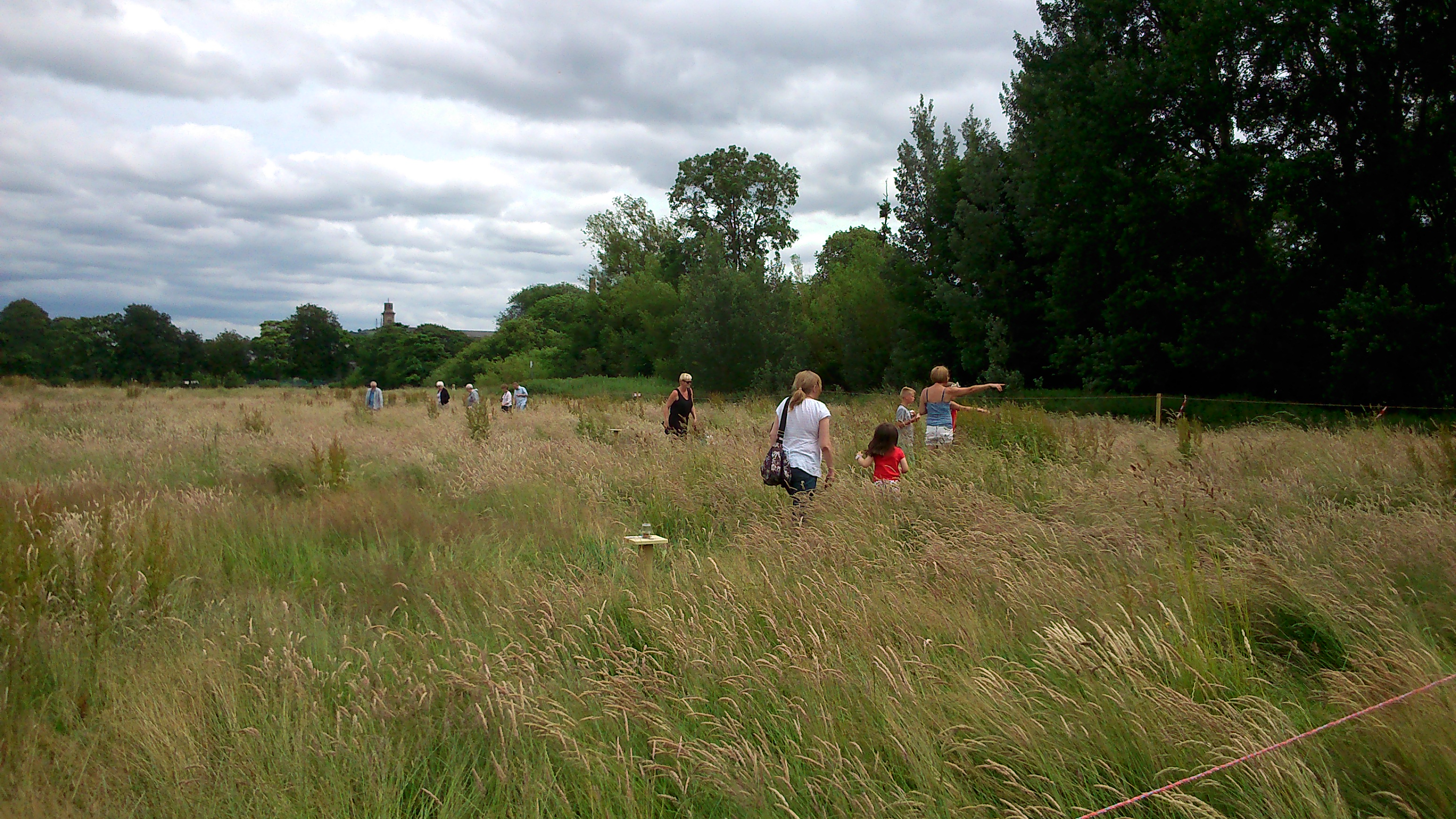 A Meadow Meander was presented both on the Saturday, along with the barbecue, and on the Sunday, when we put the entrance on the other side of the rectangle, right next to the riverside path. This meant that, where on Saturday it was mainly residents in the meander, on Sunday it was mainly passers-by — walking between Roberts Park and Hirst Wood. We wanted to get their ideas too, on the great meadow debate…