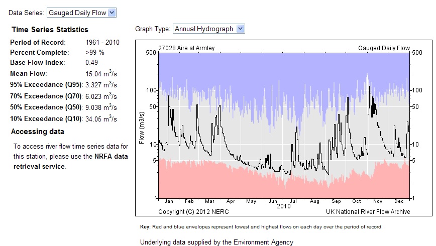 Thankfully, the Shipley area has not been directly affected by serious flooding this year in the way that some other parts of Yorkshire have been (notably in the Calder and Ouse catchments), but it’s worth noting that the River Aire has exhibited a broadly similar pattern of high water to other parts of the UK since 1998… Water levels on the Aire are gauged downstream at Armley, and this graph shows clearly how the last decade or so has seen especially high water levels…