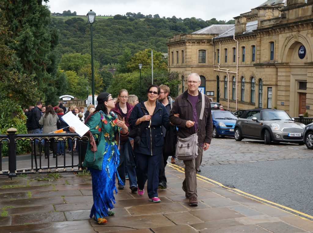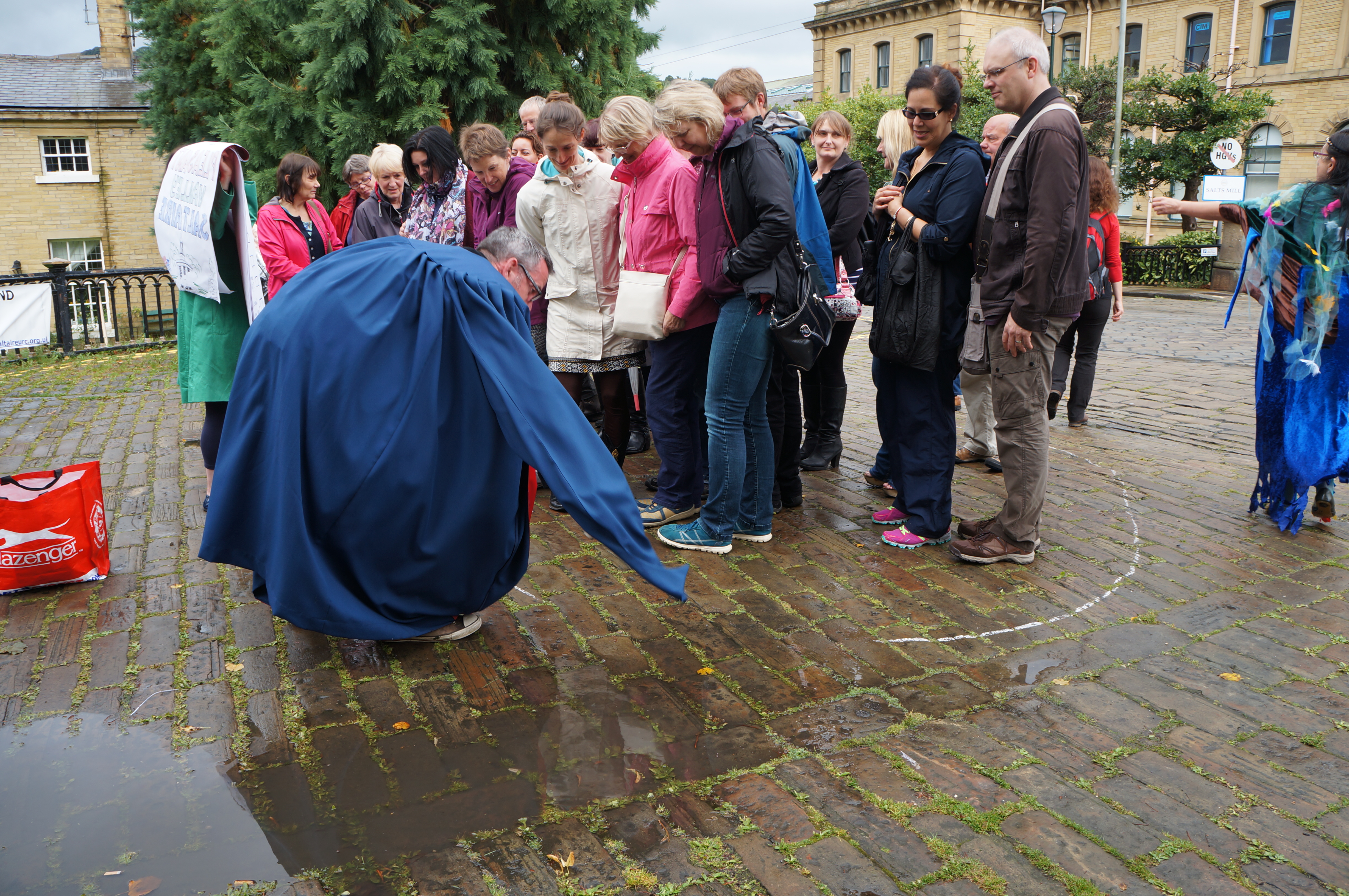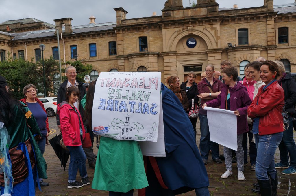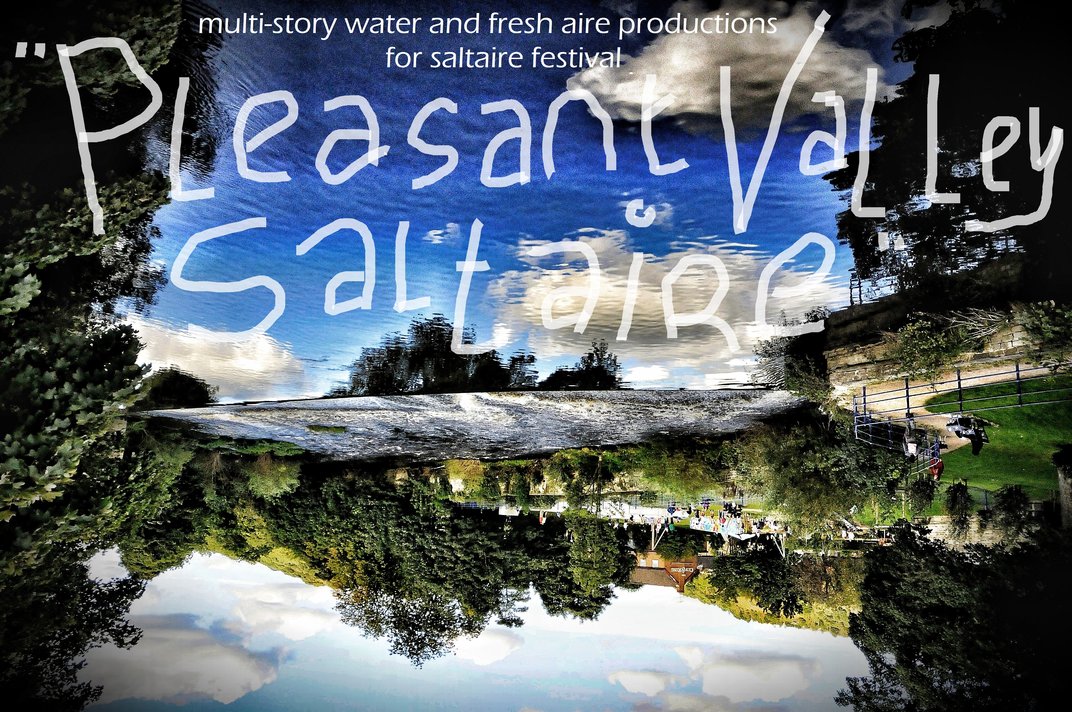 Pleasant Valley Saltaire was a theatrical walking tour commissioned for the opening weekend of the 2015 Saltaire Festival (12th-13th September). Recalling Multi-Story Water’s earlier tours of Shipley’s waterways (2012-13), festival chair Ros Garside asked for something Saltaire-specific, and suggested that MSW’s Steve Bottoms might collaborate with poet and storyteller Irene Lofthouse (Fresh Aire Productions). We both happily accepted the invitation, but stipulated that we wanted the piece to try to link up the Saltaire mill village with some less well-known, less visited neighbourhoods that sit just next to it in the Aire valley, on either side of the river. Steve and Irene shared some concerns about the way that the mill village’s UNESCO World Heritage Site status has led to these other areas and their residents being somewhat overshadowed, as well as to a degree of “gentrification” in Saltaire itself. We wanted to offer a playful challenge to the familiar, rather compartmentalised approach to the area, by emphasising shared occupancy of the Airedale landscape.