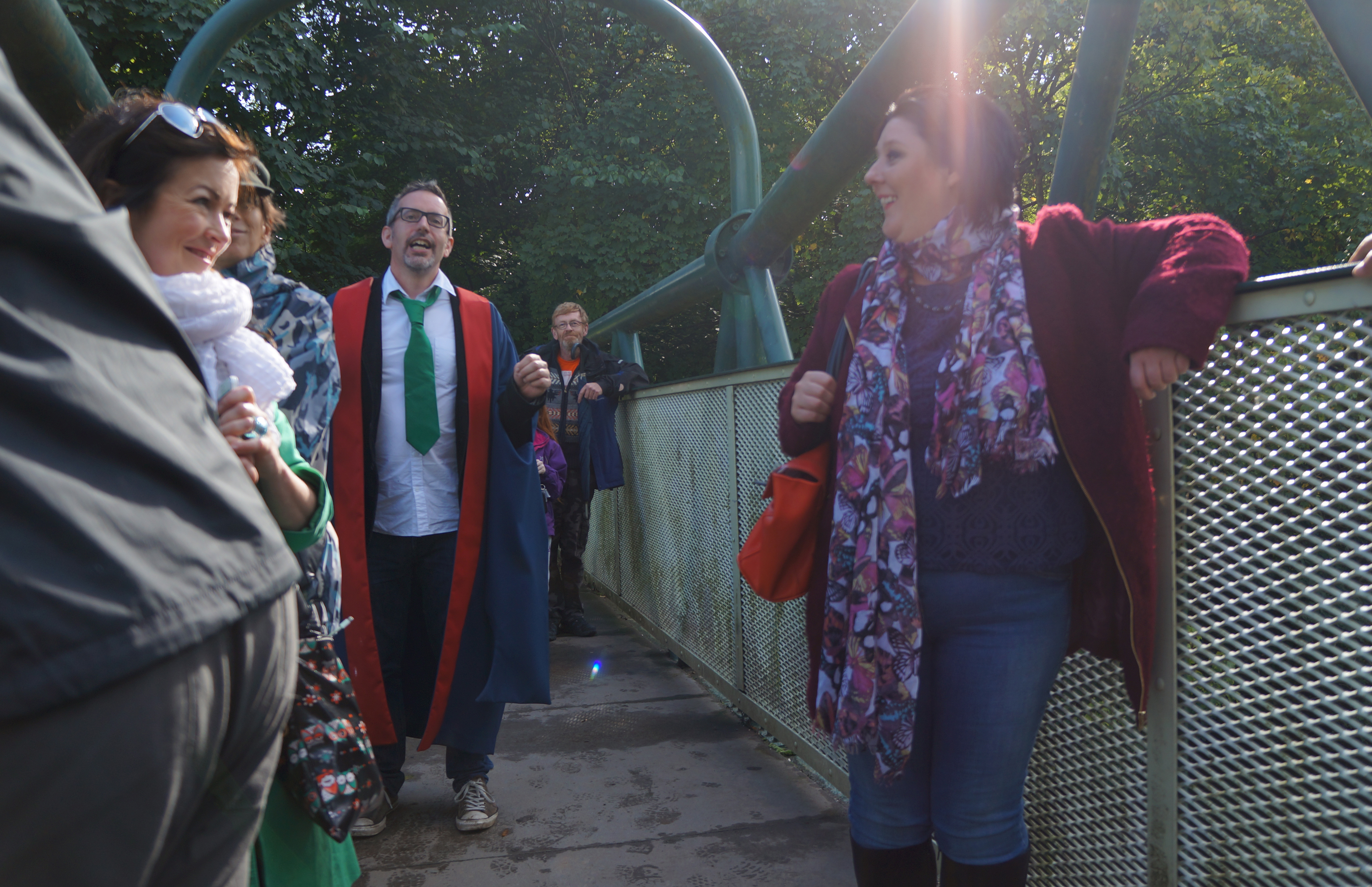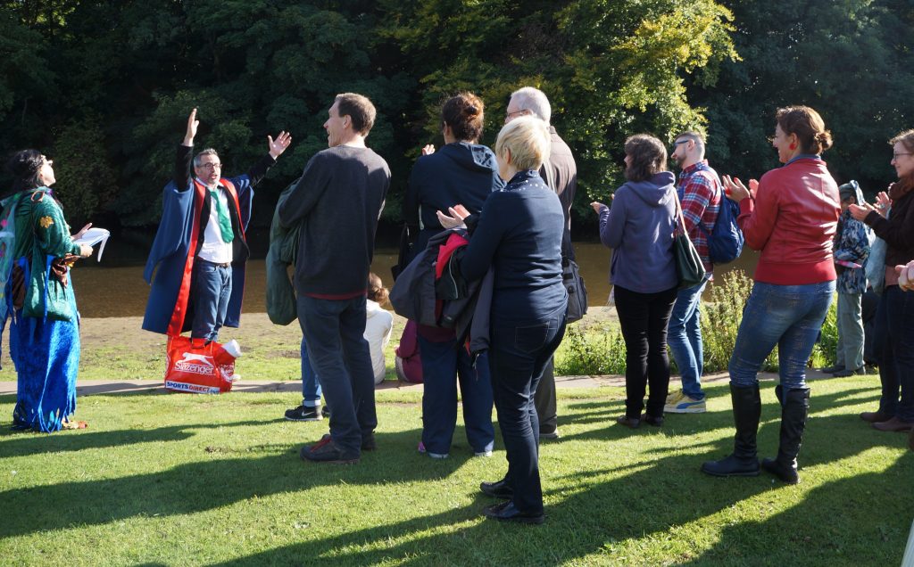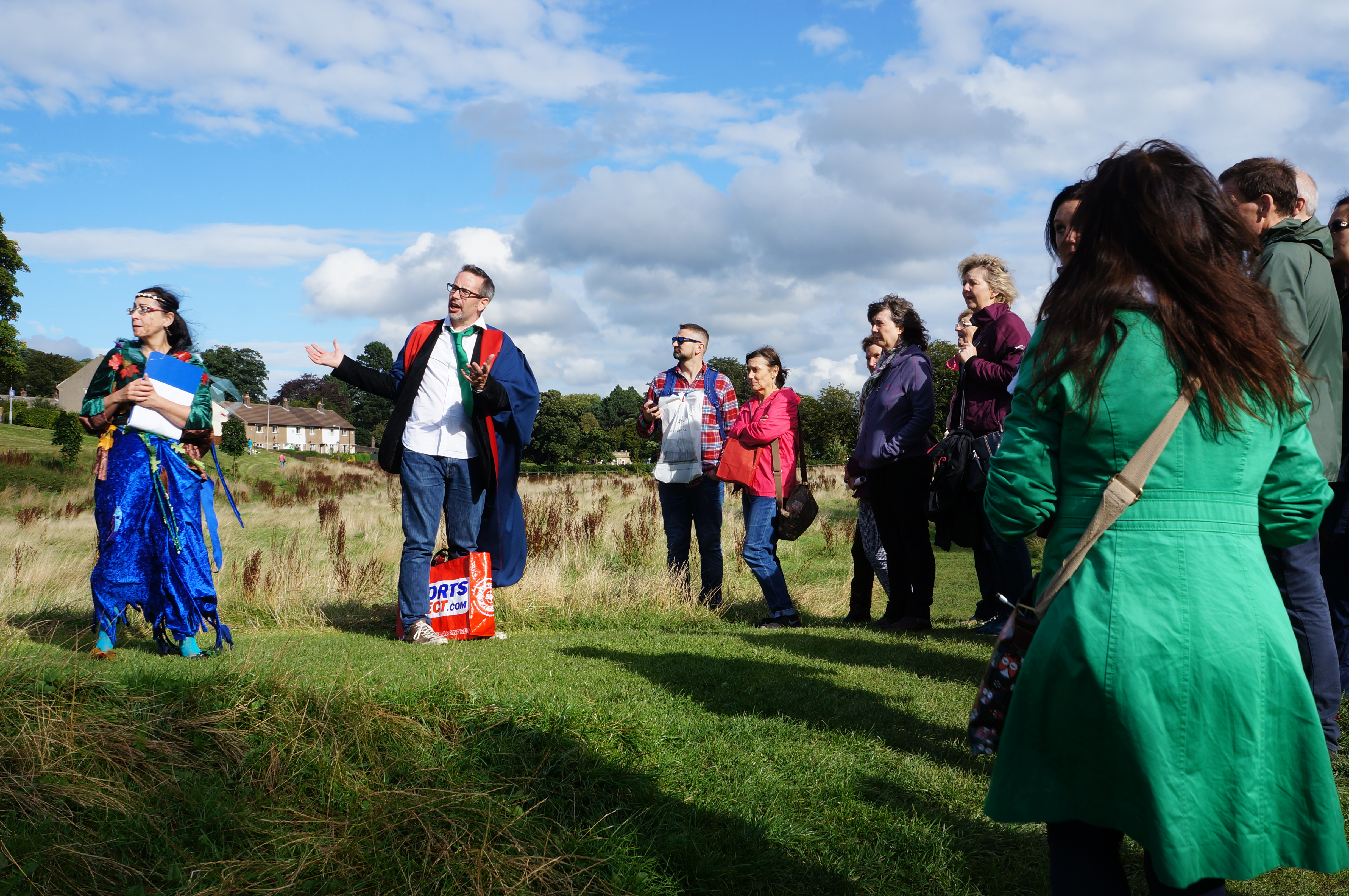 Pleasant Valley Saltaire was a theatrical walking tour commissioned for the opening weekend of the 2015 Saltaire Festival (12th-13th September). Recalling Multi-Story Water’s earlier tours of Shipley’s waterways (2012-13), festival chair Ros Garside asked for something Saltaire-specific, and suggested that MSW’s Steve Bottoms might collaborate with poet and storyteller Irene Lofthouse (Fresh Aire Productions). We both happily accepted the invitation, but stipulated that we wanted the piece to try to link up the Saltaire mill village with some less well-known, less visited neighbourhoods that sit just next to it in the Aire valley, on either side of the river. Steve and Irene shared some concerns about the way that the mill village’s UNESCO World Heritage Site status has led to these other areas and their residents being somewhat overshadowed, as well as to a degree of “gentrification” in Saltaire itself. We wanted to offer a playful challenge to the familiar, rather compartmentalised approach to the area, by emphasising shared occupancy of the Airedale landscape.