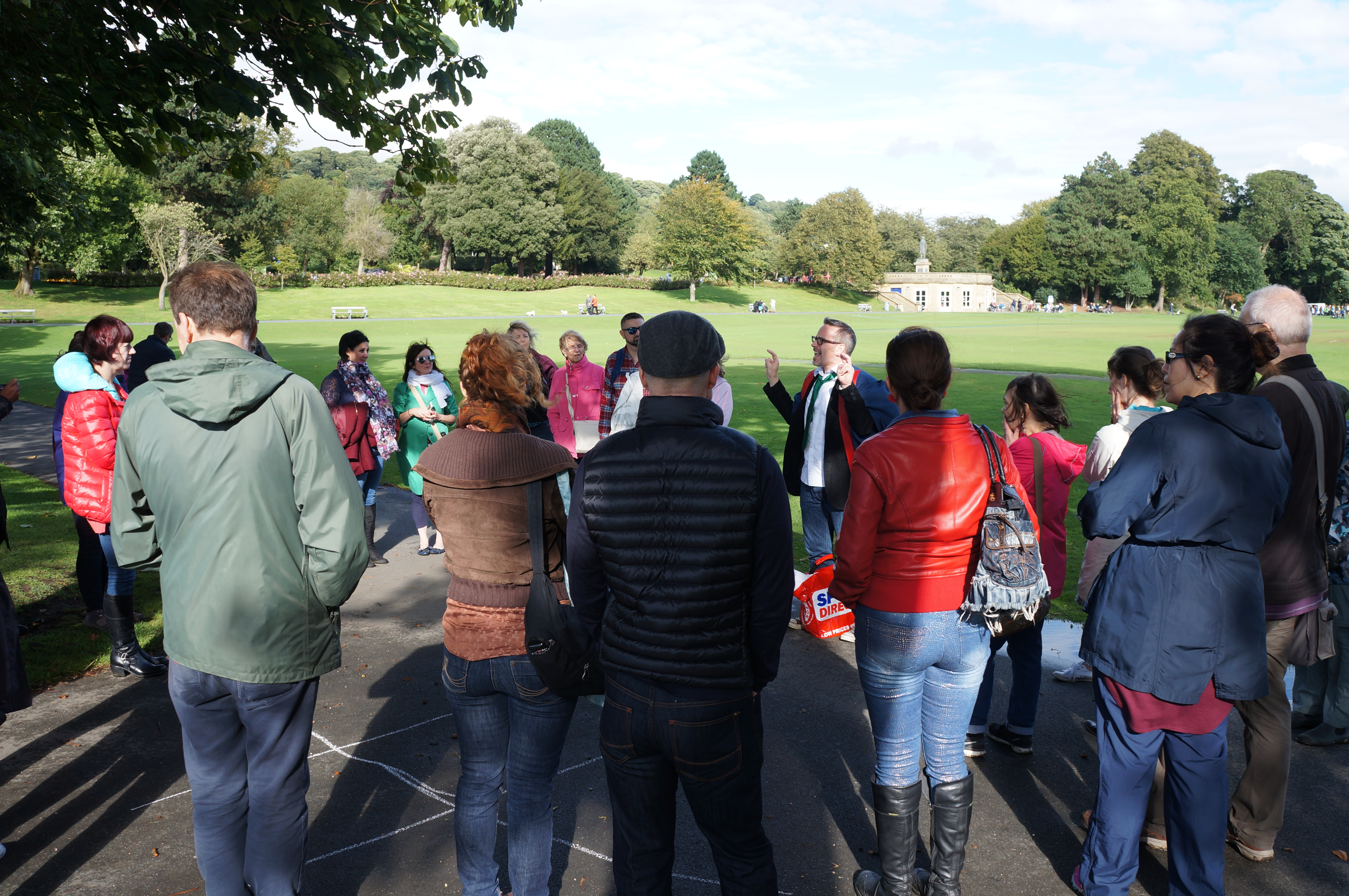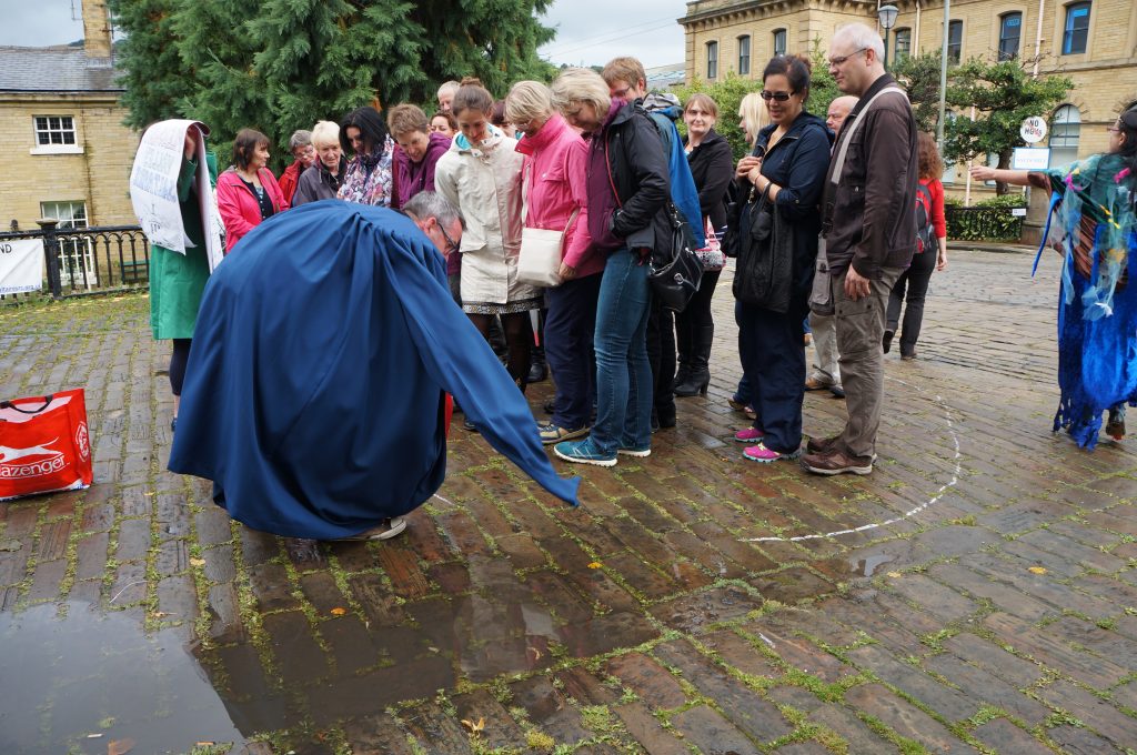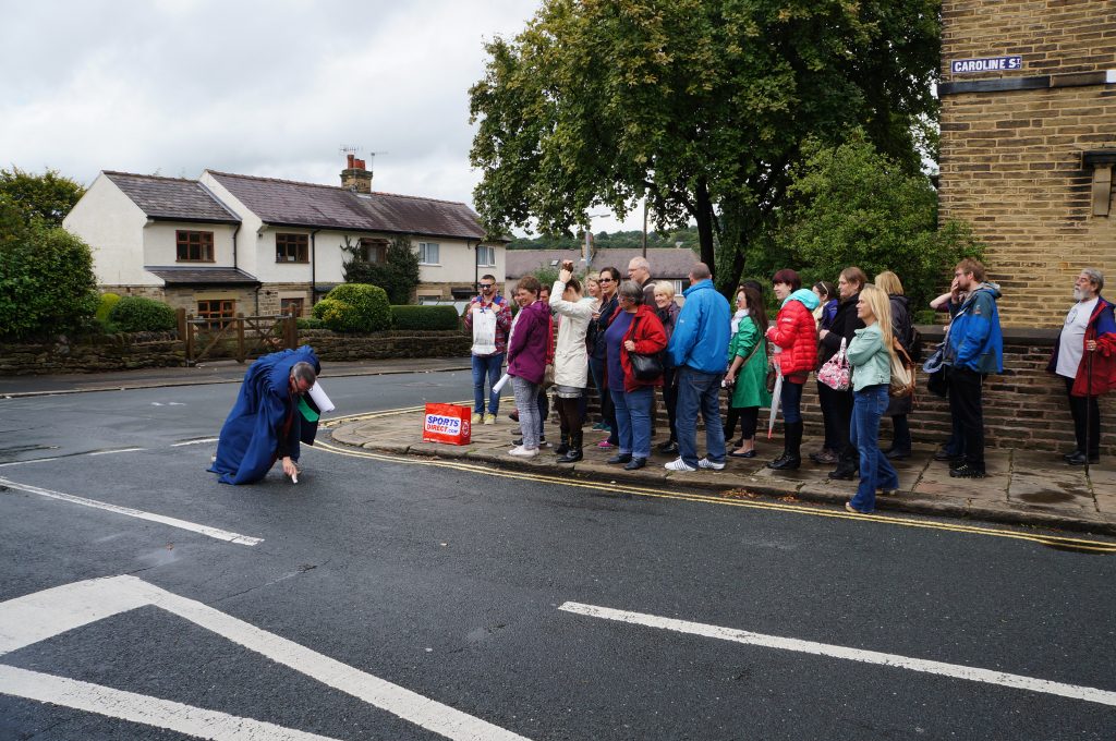 The tour’s starting point was in the very heart of Saltaire, on Victoria Road — just across from the main entrance to Salts Mill and outside the gateway for Titus Salt’s Grade 1-listed Congregational Church. As a crowd gathered, the Professor quizzed them about Saltaire, while asking for them to agree unanimously on the correct answers. Anyone who dissented from a group-agreed answer should indicate their independence by stepping outside the chalk circle he had just drawn around them…