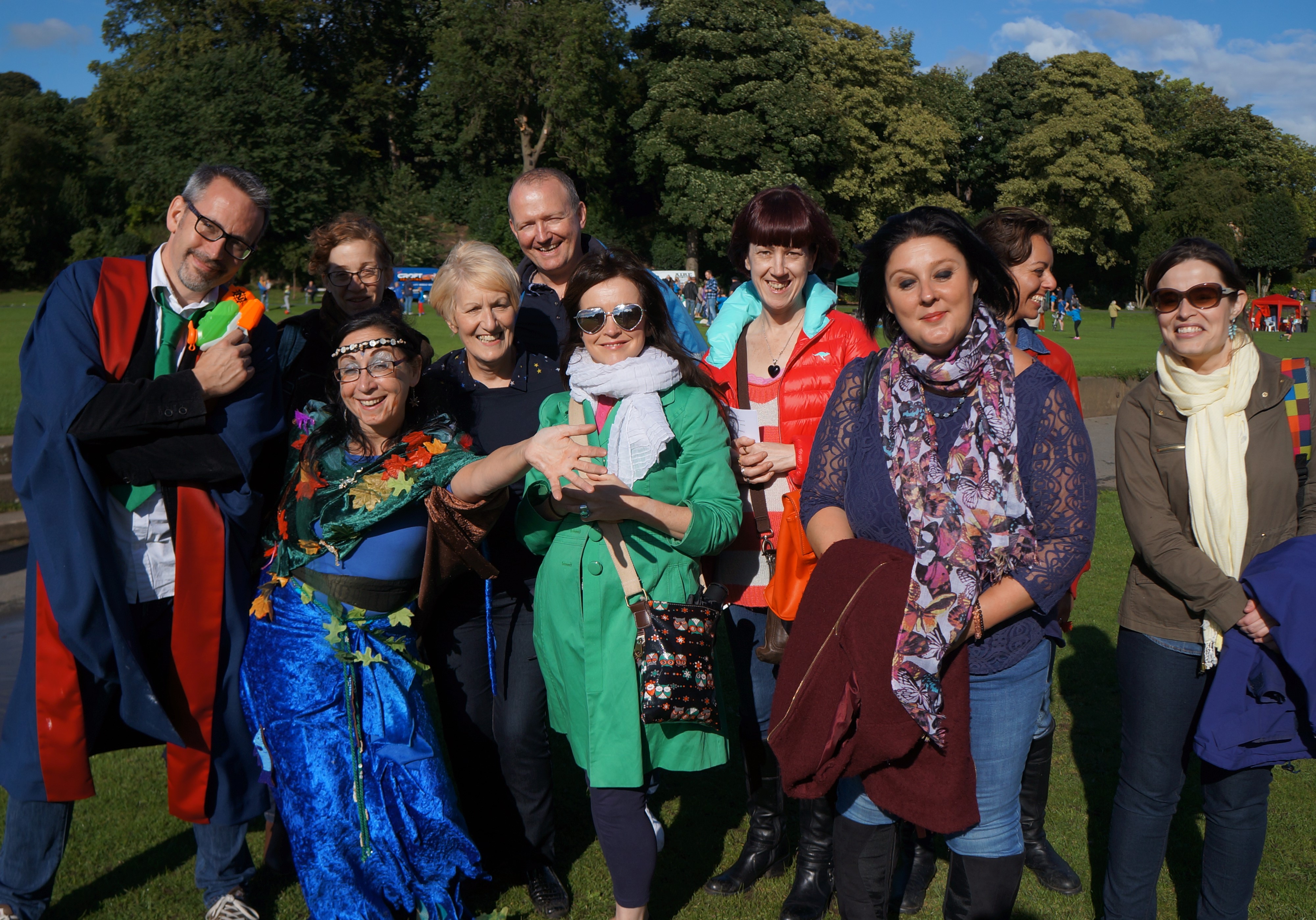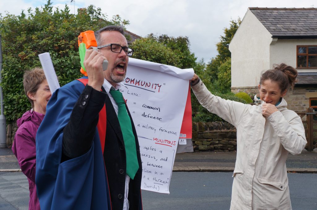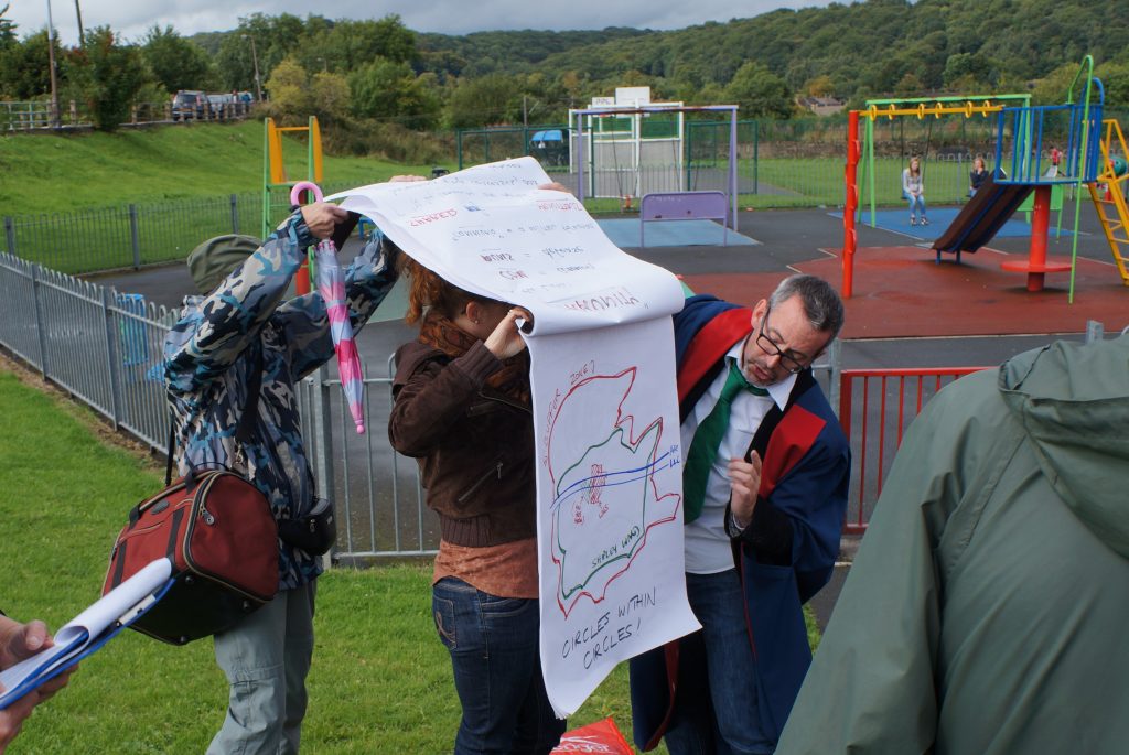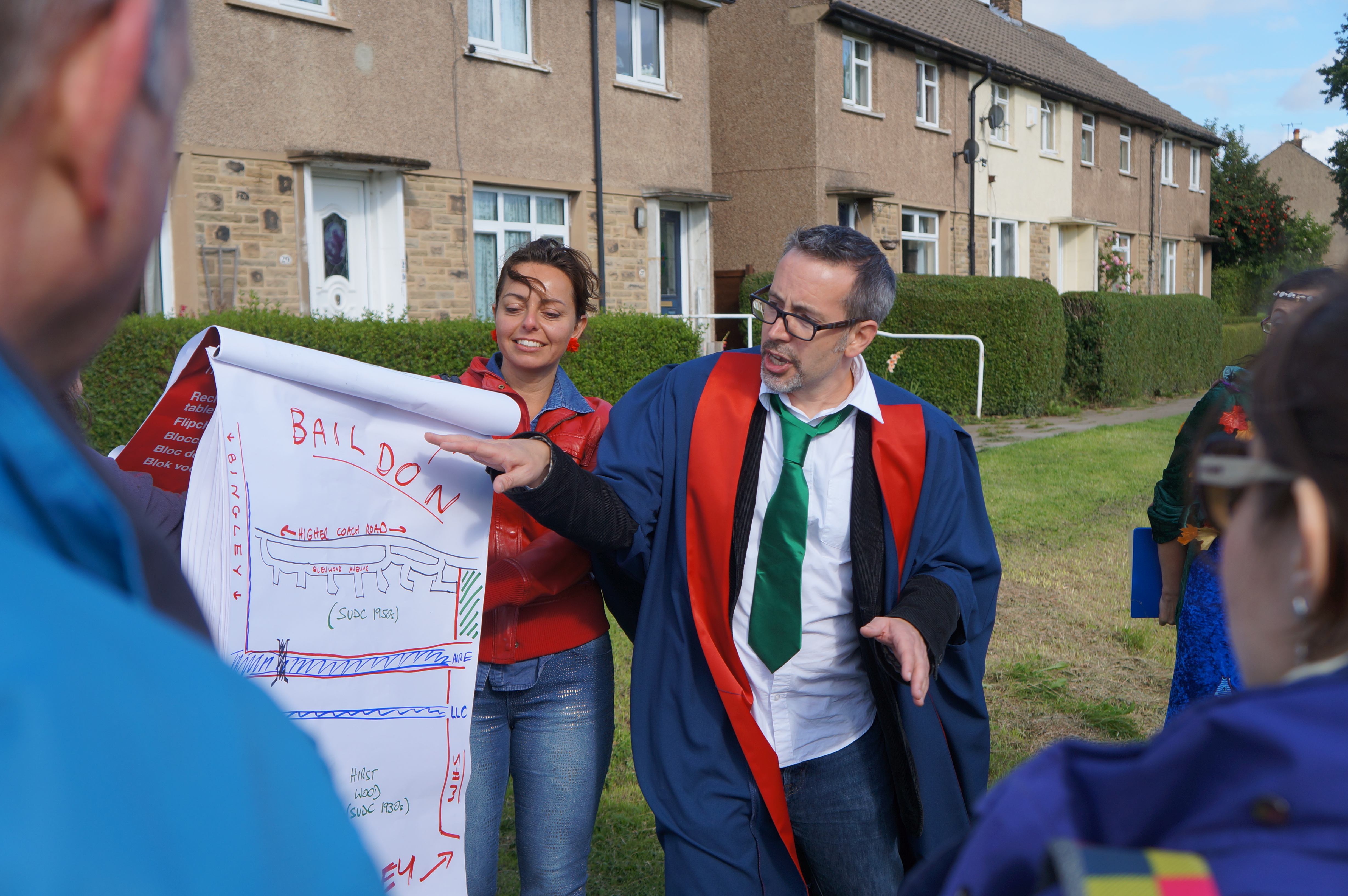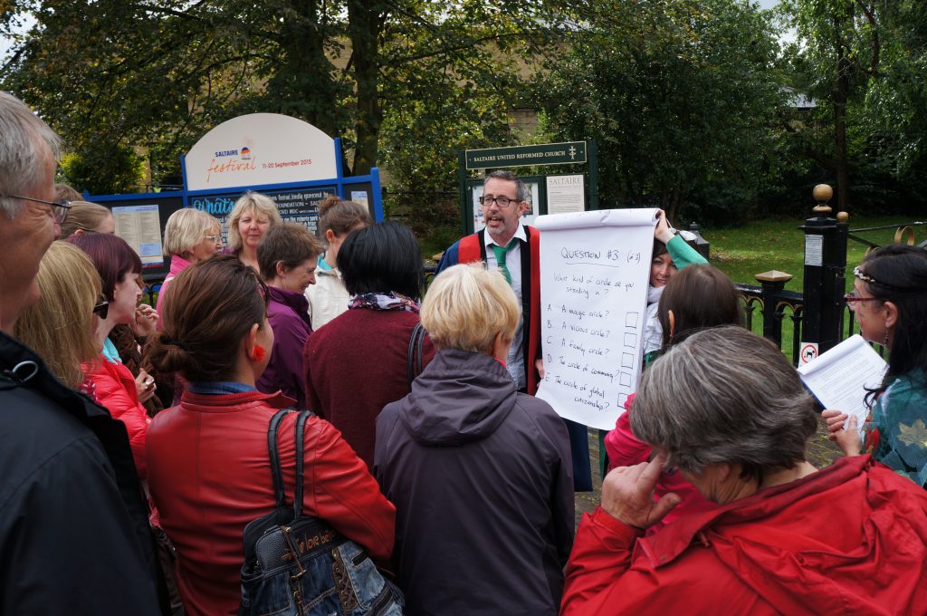 The opening weekend of Saltaire Festival is traditionally more “community” focused — meaning that it attracts a smaller, somewhat more local audience than the more commercialised second weekend (when 20,000 or so visitors typically descend on the village). We designed Pleasant Valley Saltaire to fit in with the weekend’s informal, “home-made” aesthetic (also evident in our simple flyer design, above), and took the idea of community itself as the linking thread for the tour… Appearing in academic robes and sneakers, with hand-drawn flipchart illustrations, Steve took on the role of Mad Professor, promising a roaming lecture on notions of community and group identity. To get people involved immediately in the identity of the walking group itself, the Professor enlisted a volunteer to act as makeshift flipchart stand, and asked other participants to collectively debate the answers to three multiple-choice questions…