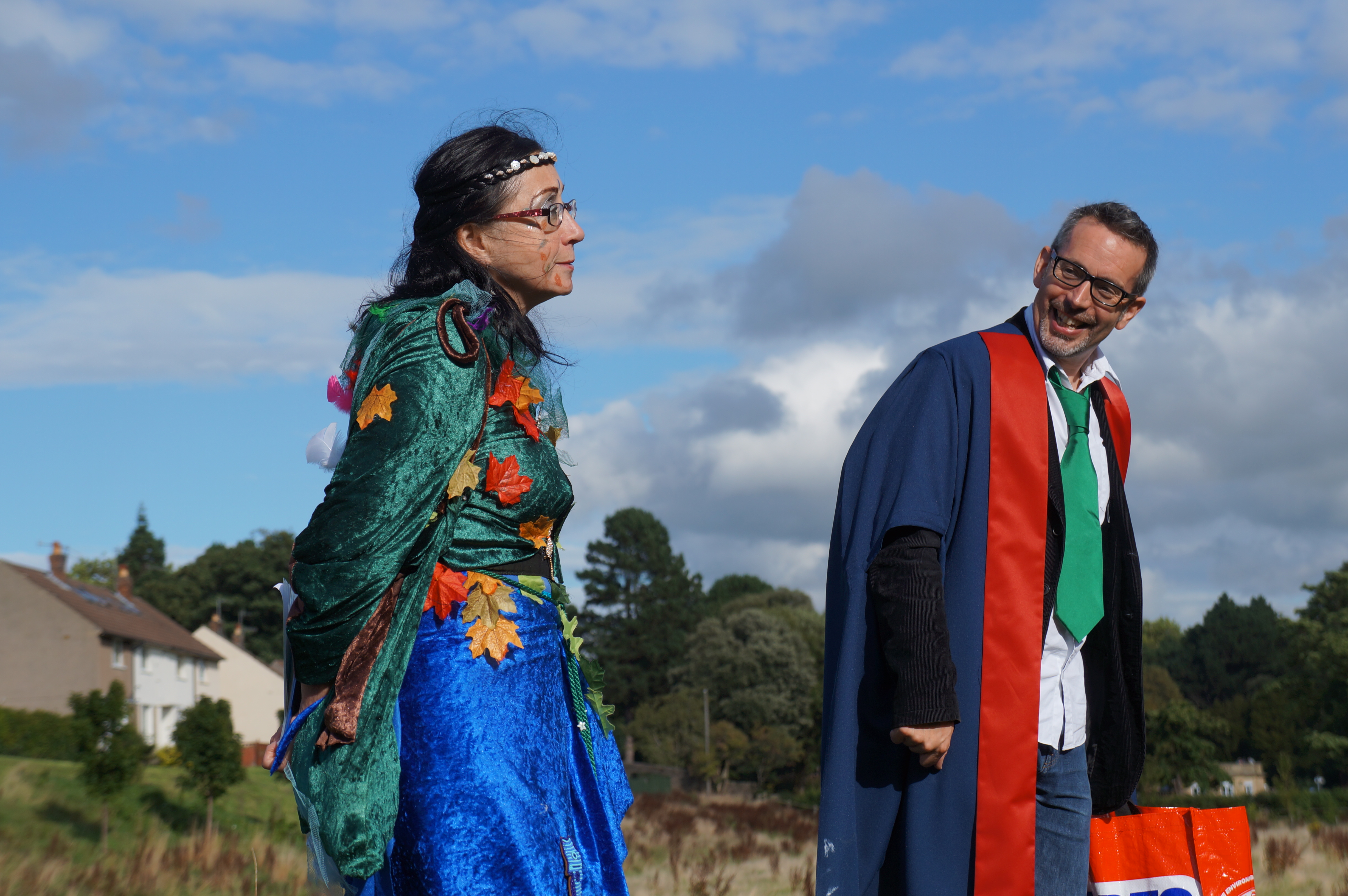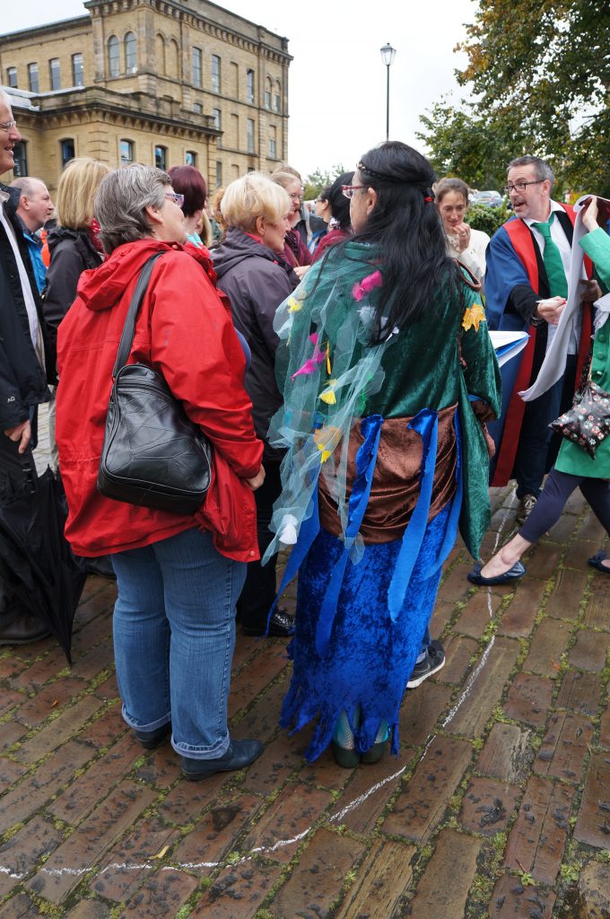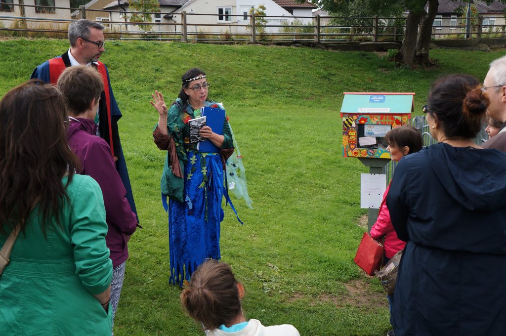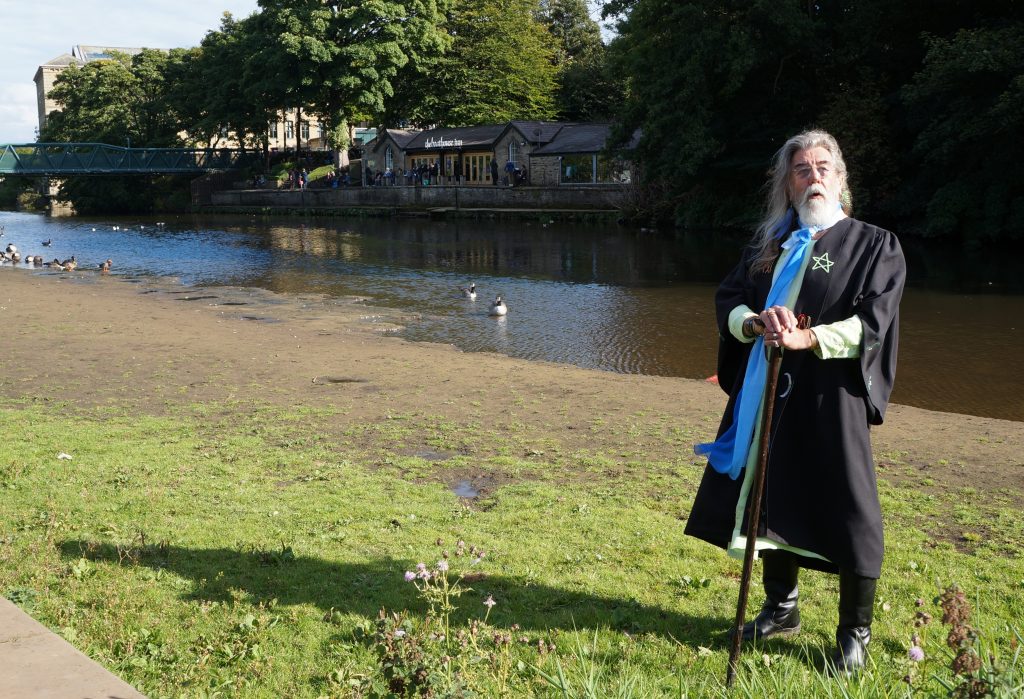 We walk on along the park’s riverside path, leaving contentious issues behind us to enjoy the sunshine… On the water’s edge, despite the very low late-summer river level, we come across a final contributor to our tour. This is Isara, the River God (played by former Saltaire Village Society chairman, Rob Martin). Our Sprite introduces him, and he shares some concluding thoughts for today’s pleasant valley journey…
