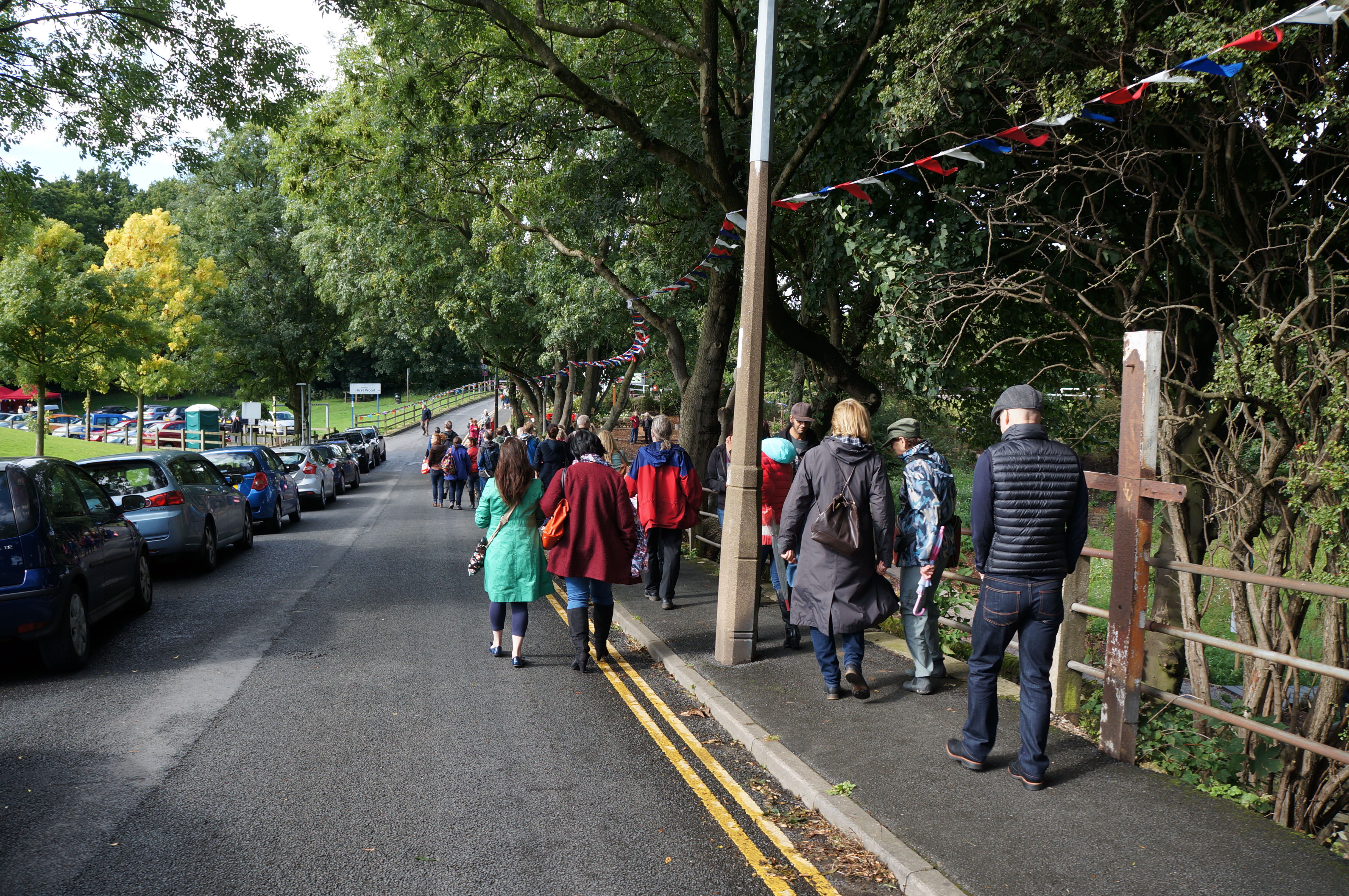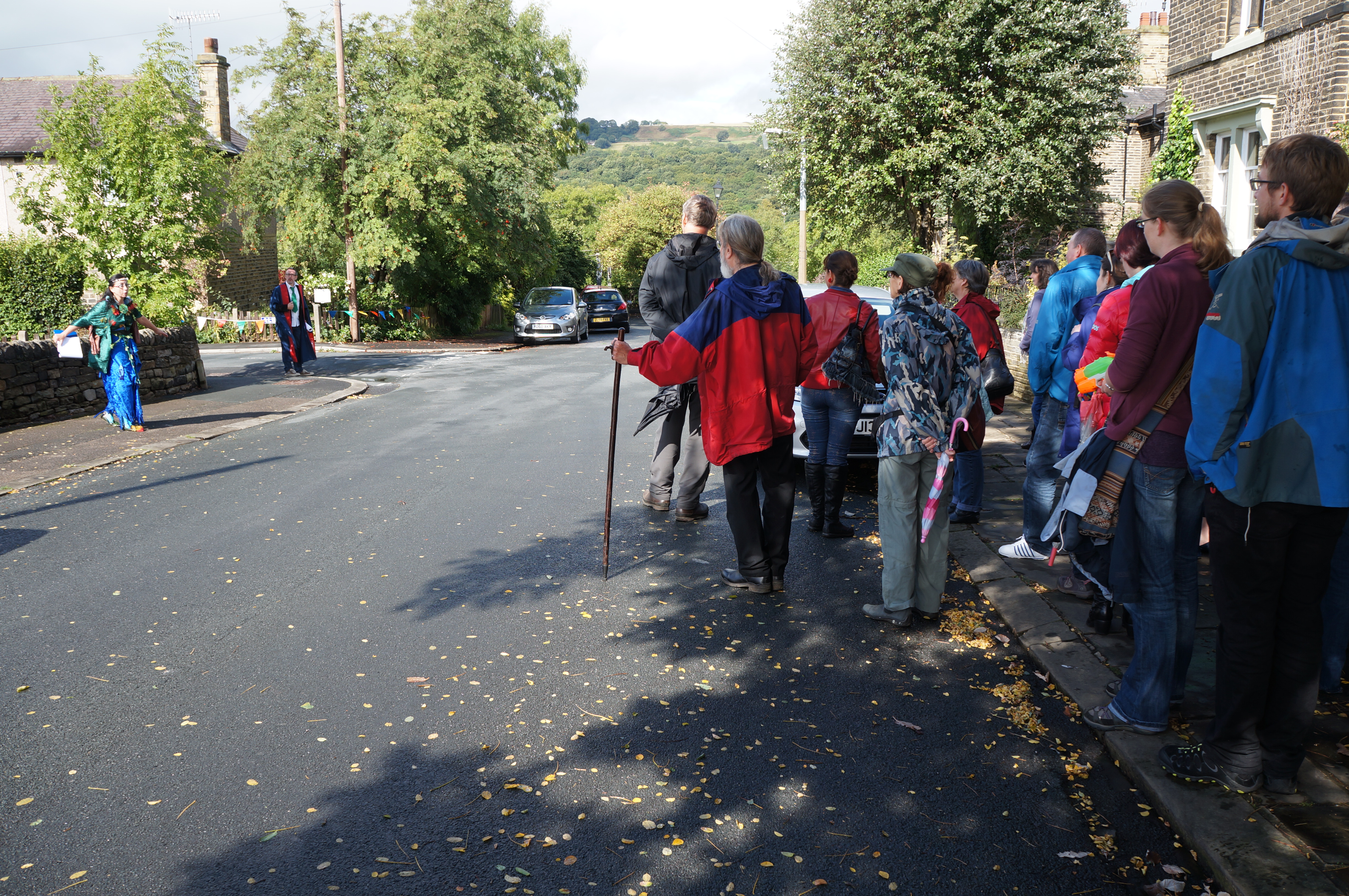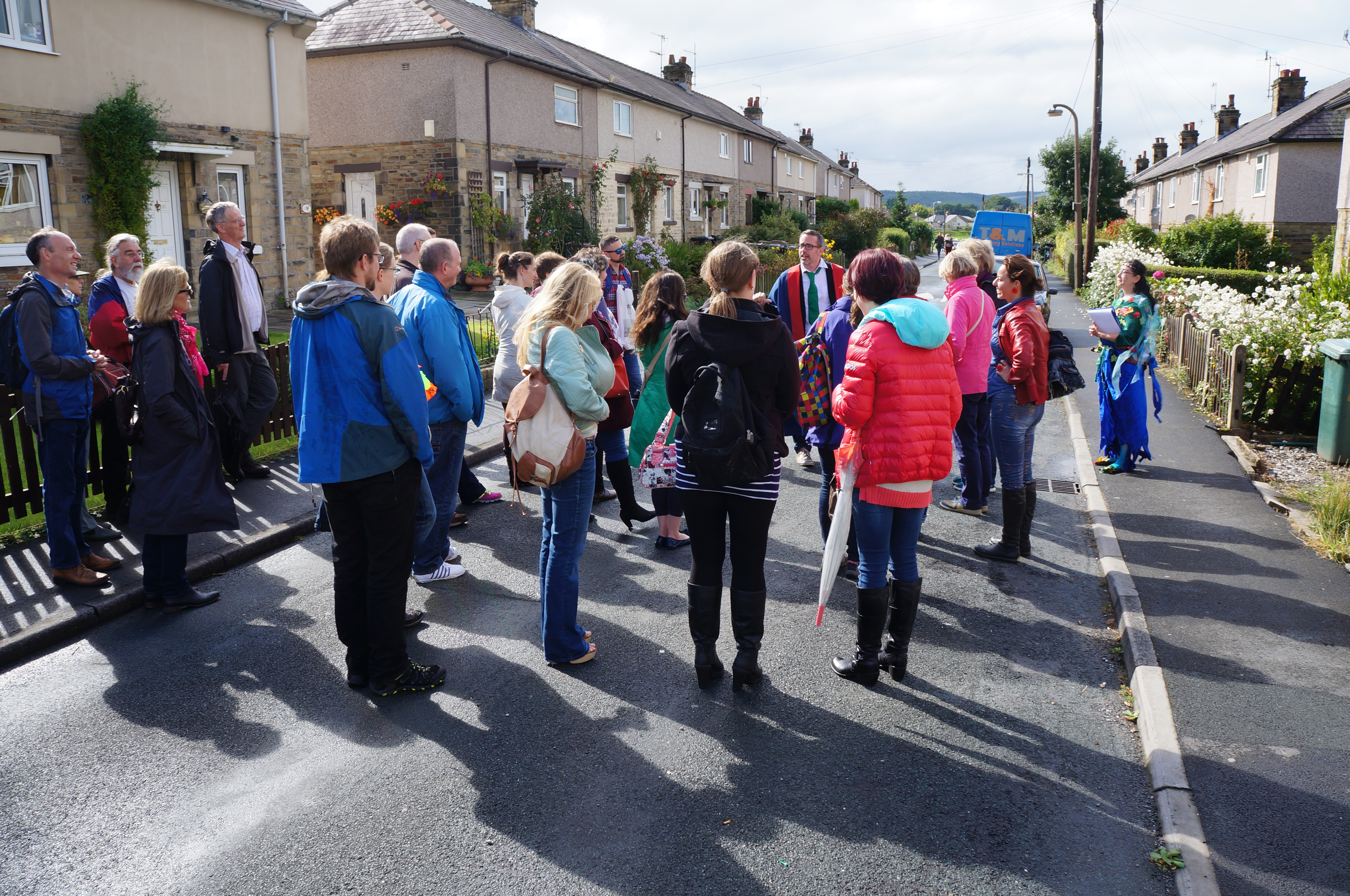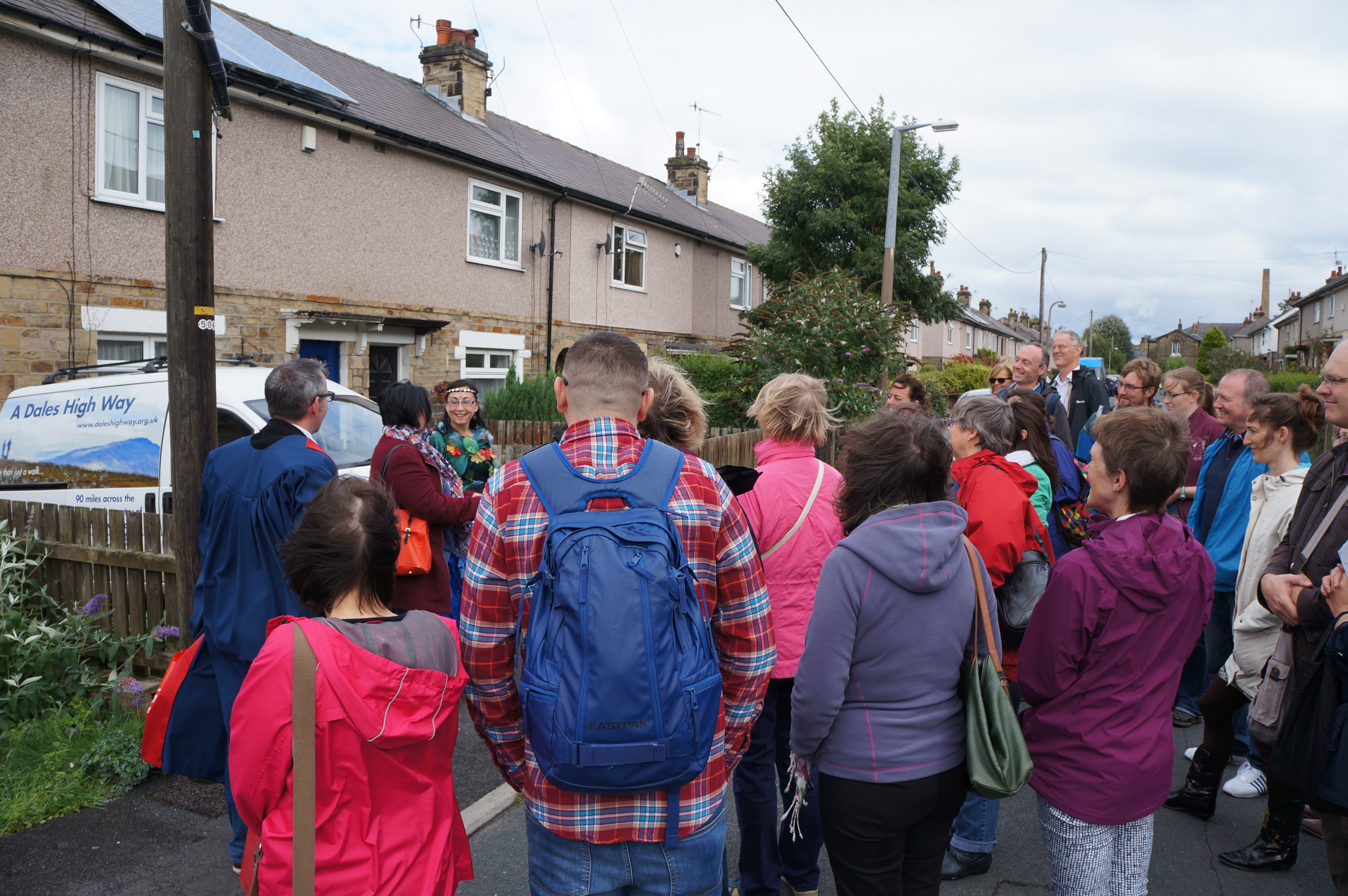 Outside one home we find a van parked, with the legend “A Dales High Way” emblazoned on its side. The creators of this popular 90 mile trek across the high Yorkshire Dales live right here on Albert Avenue, the Sprite explains, but since they’re off hiking this weekend (naturally), a volunteer is enlisted to read a written statement from them, welcoming today’s walkers to the Hirst Wood estate…