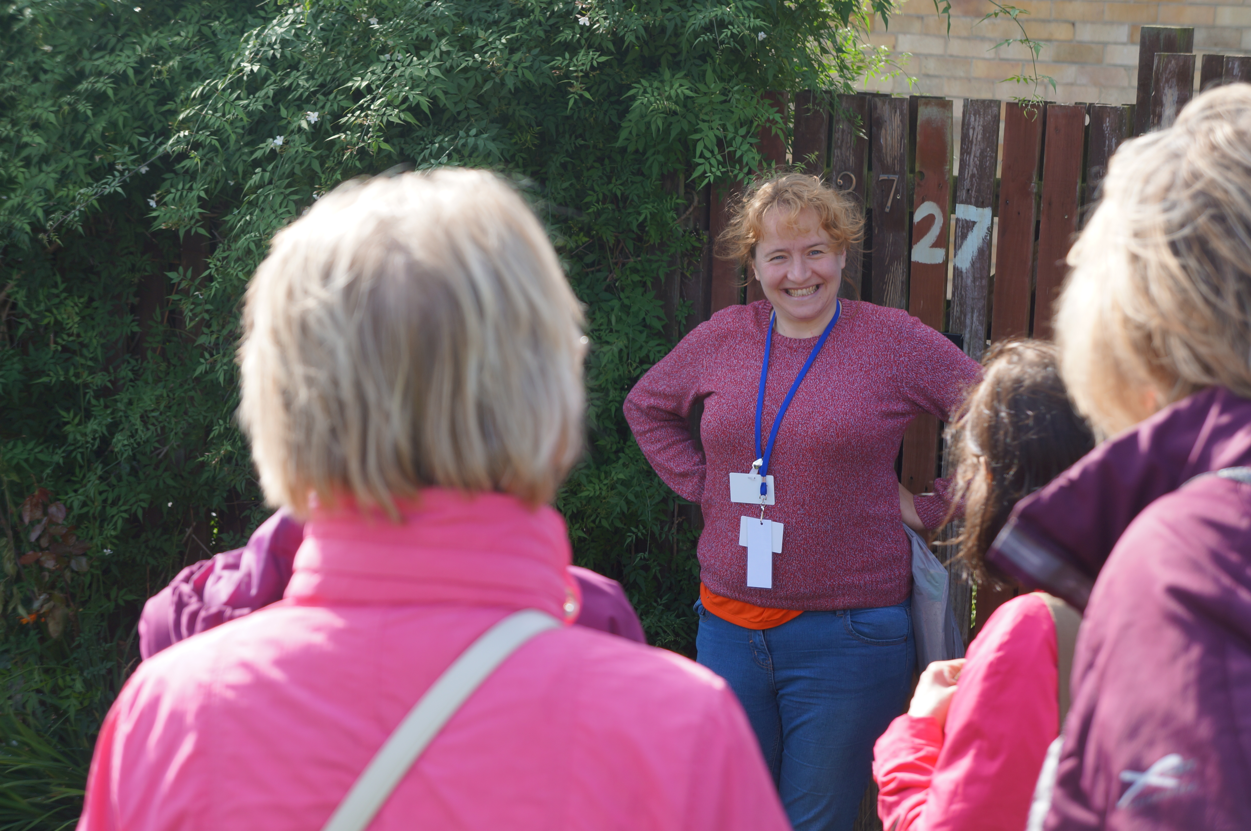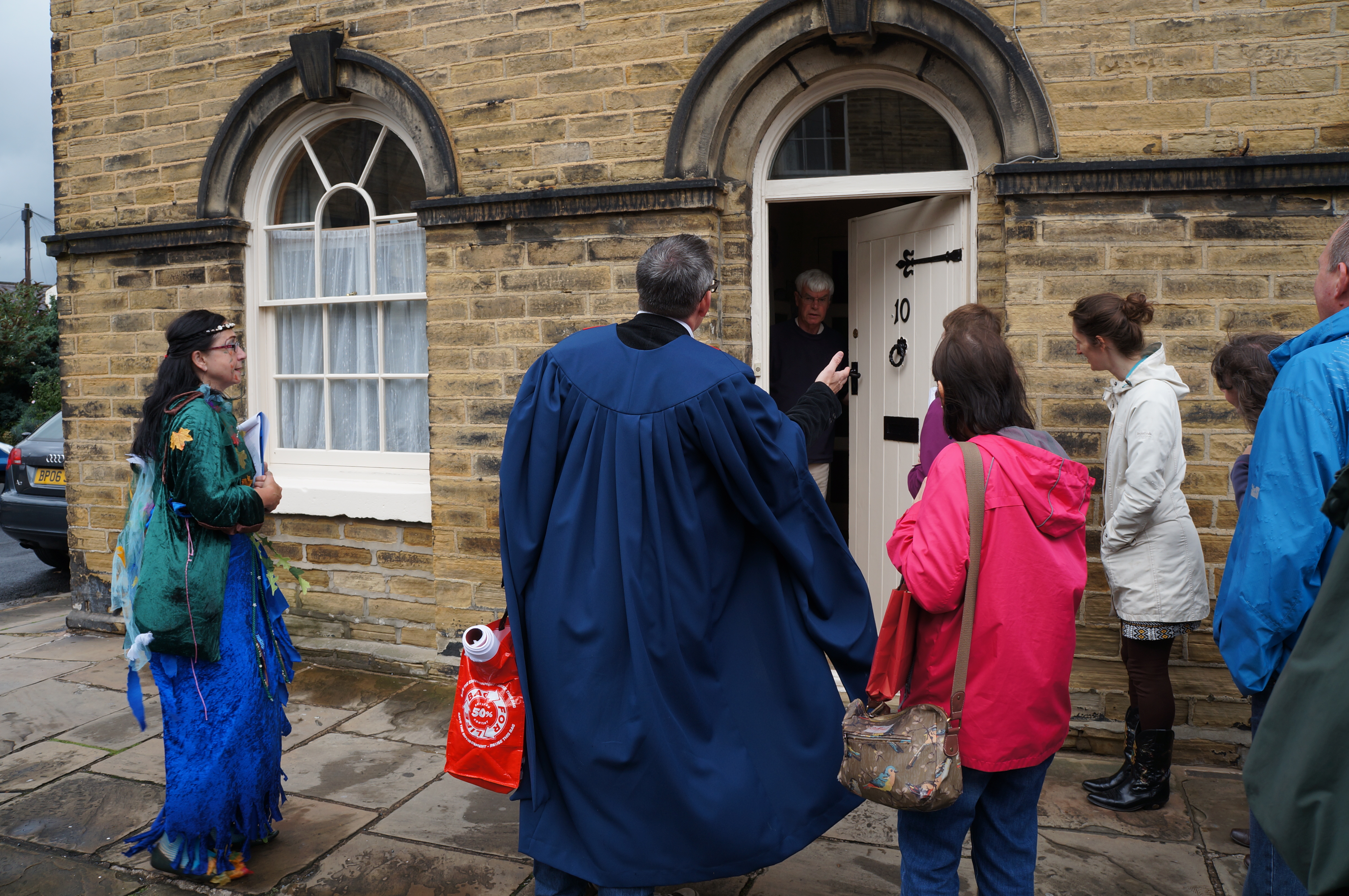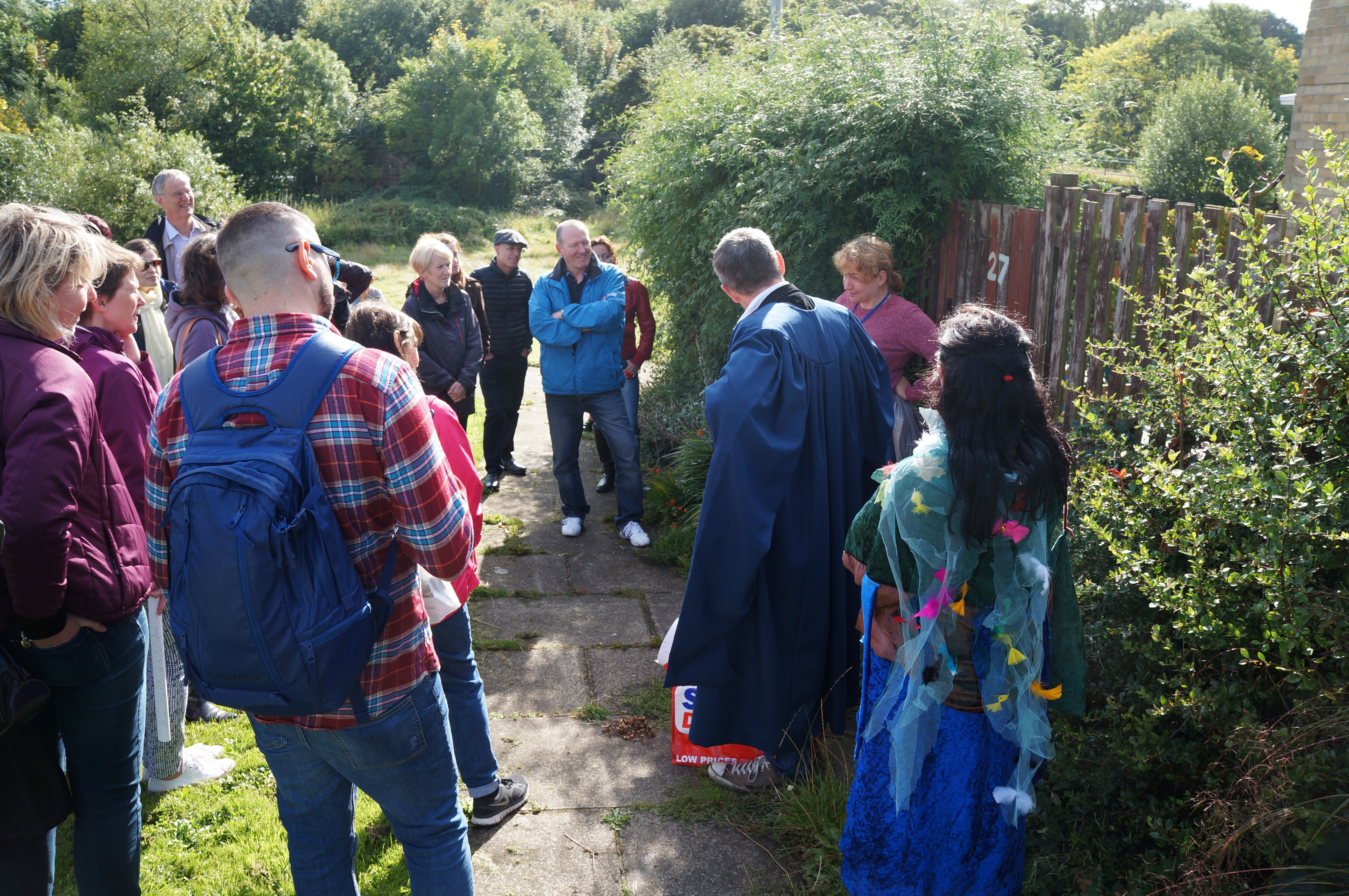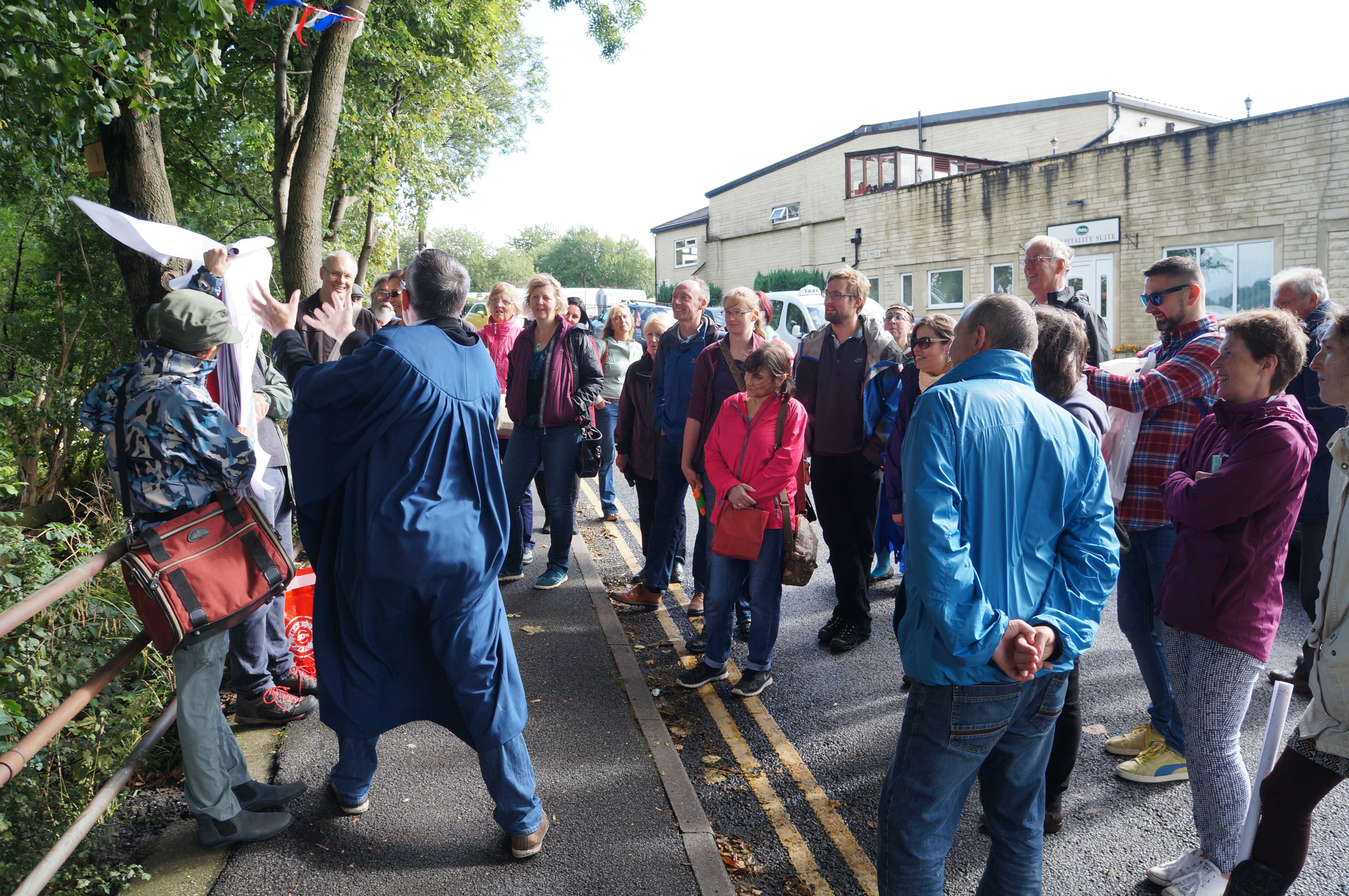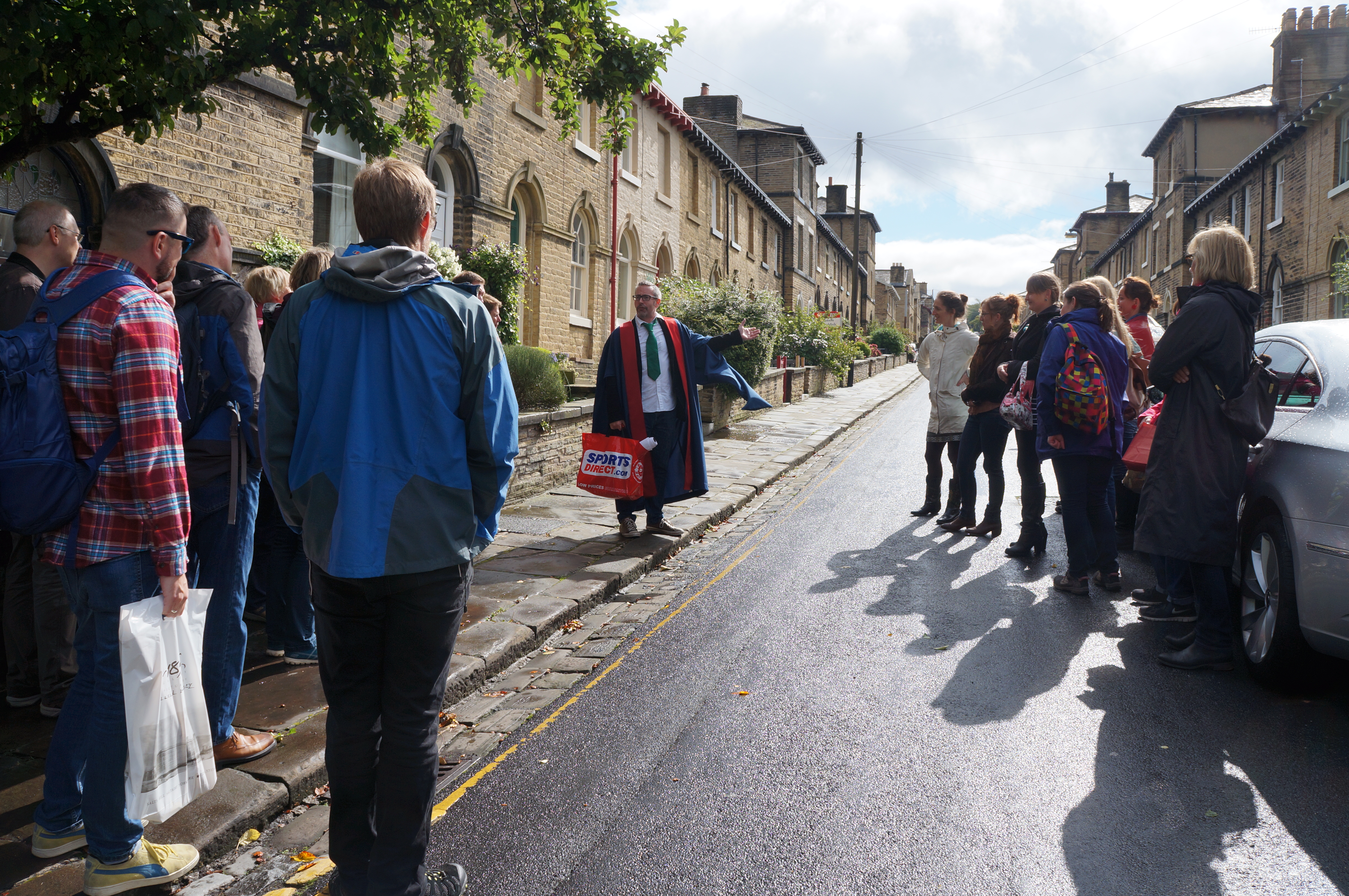 Outside one home we find a van parked, with the legend “A Dales High Way” emblazoned on its side. The creators of this popular 90 mile trek across the high Yorkshire Dales live right here on Albert Avenue, the Sprite explains, but since they’re off hiking this weekend (naturally), a volunteer is enlisted to read a written statement from them, welcoming today’s walkers to the Hirst Wood estate…