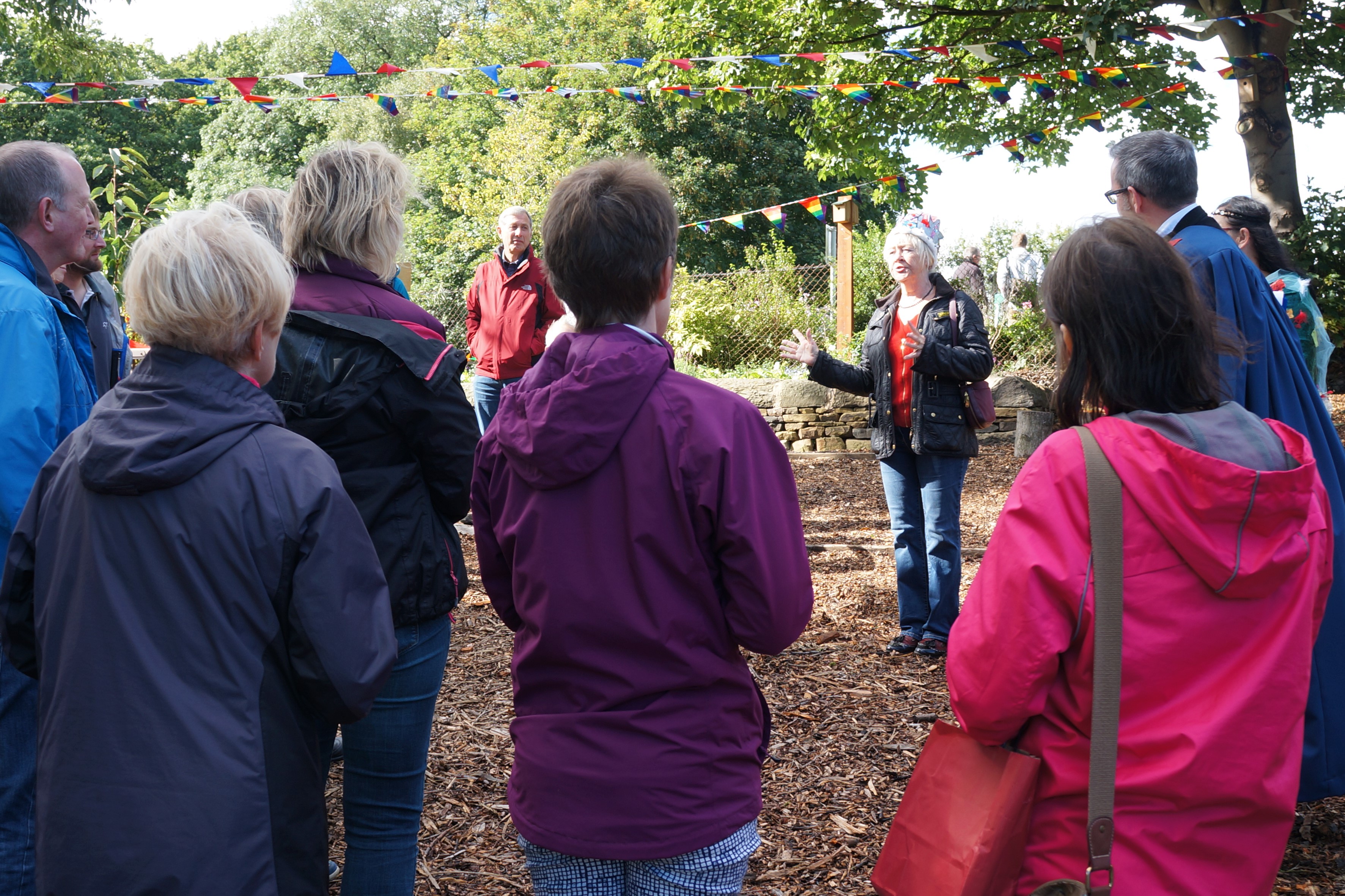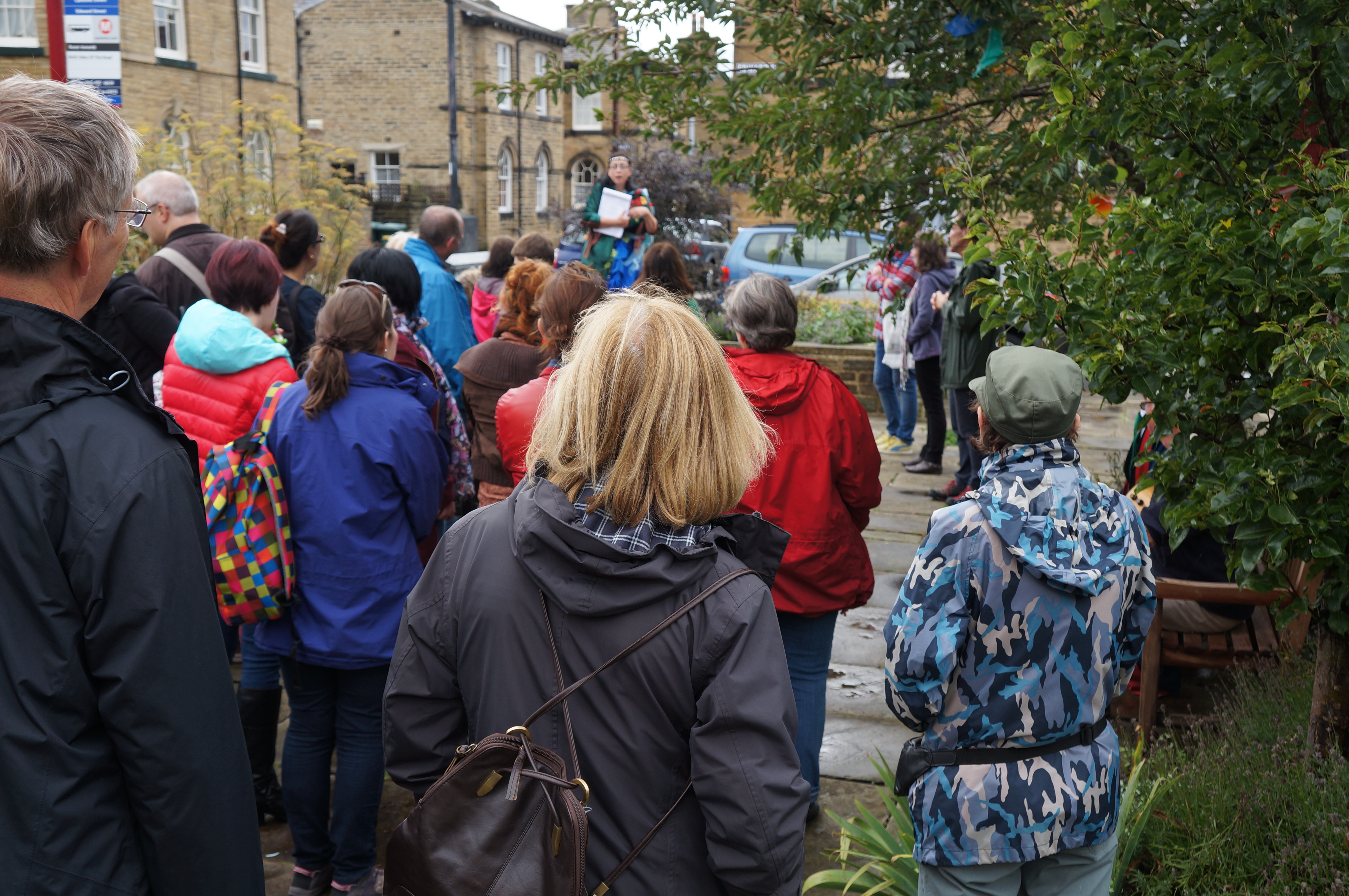 … and then turn right along Caroline Street — part of a long, straight, clear roadway that the Sprite says was once a key transport route along Airedale. A volunteer is appointed to knock at a door, and out comes home-owner Eddie Lawler, the “Bard of Saltaire”. He leads us across to the nearby Washhouse Garden, where the Professor interviews him briefly about his longstanding role in the Saltaire village community (Eddie is one of the founders of Saltaire Festival). He then plays us a theme tune for the Pleasant Valley Saltaire walk — adapted, of course, from the Monkees’ “Pleasant Valley Sunday”.