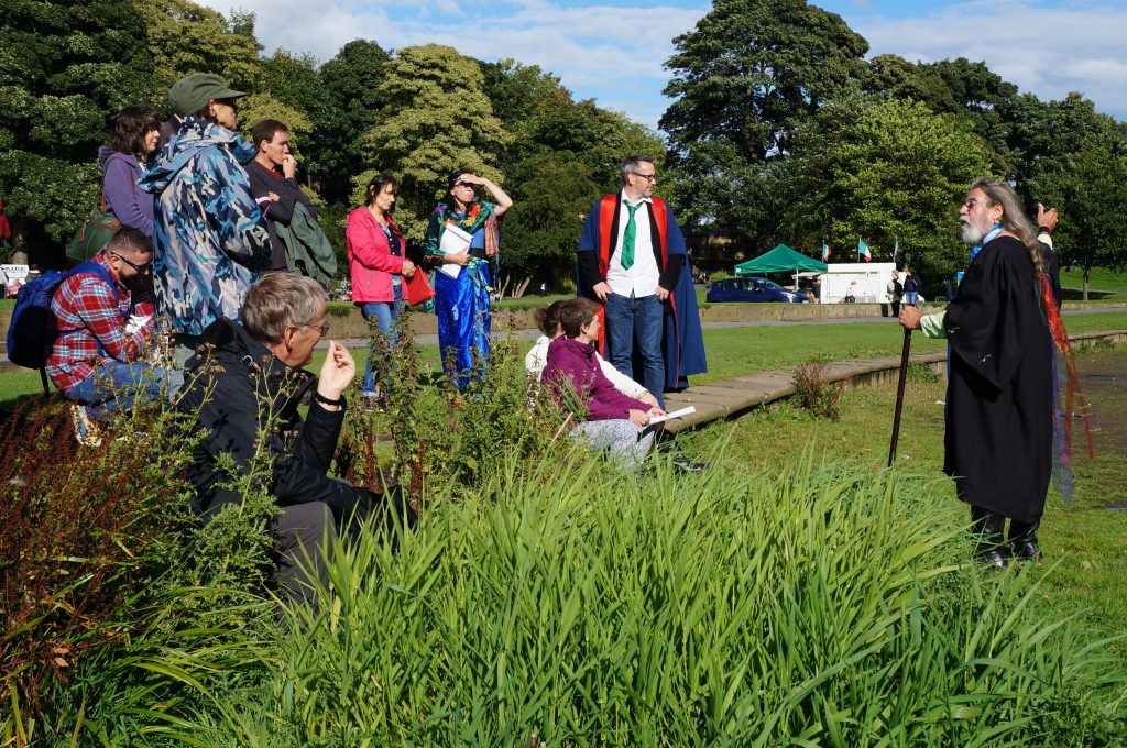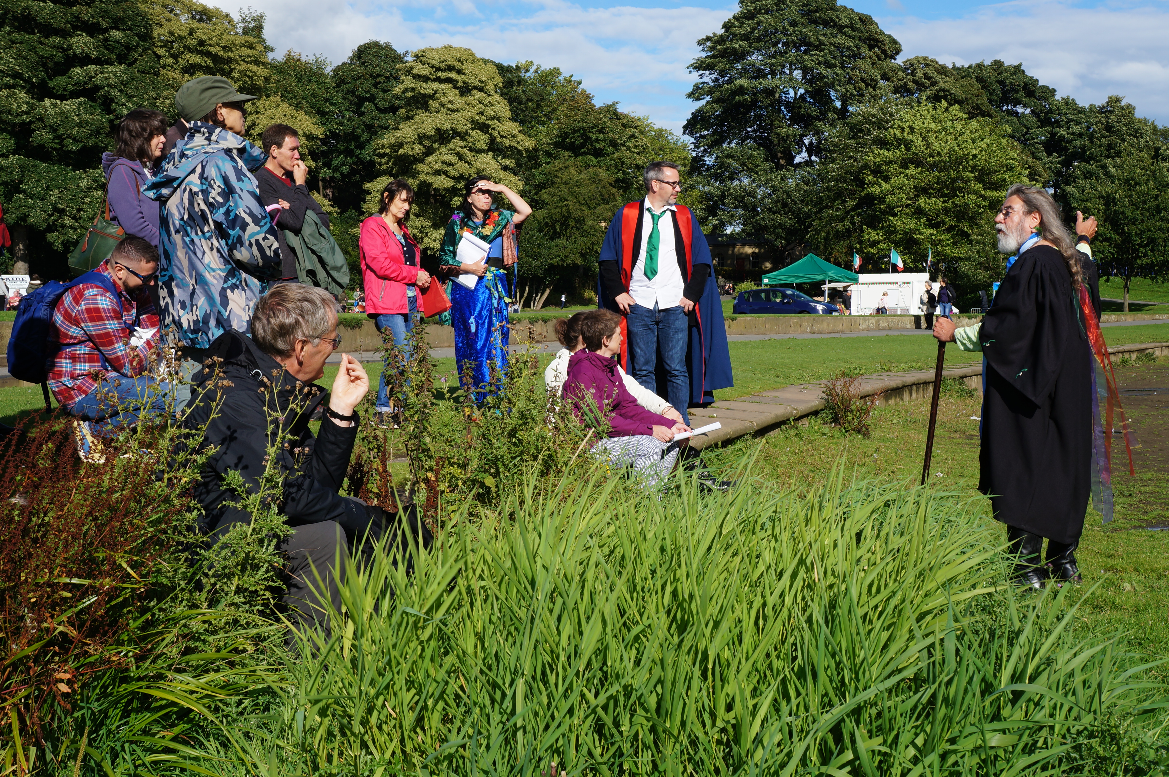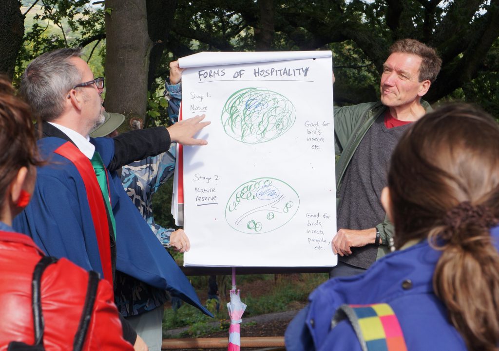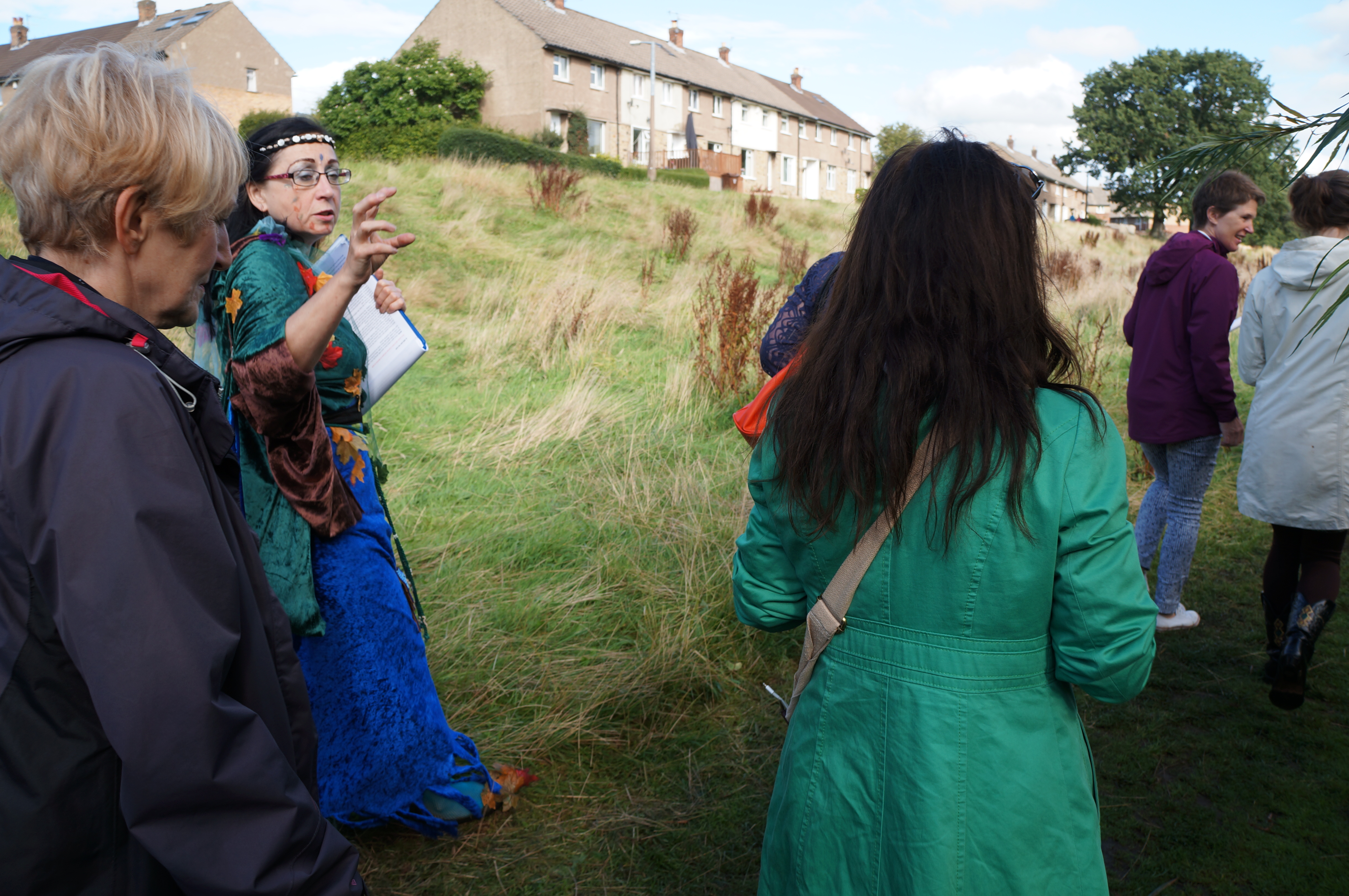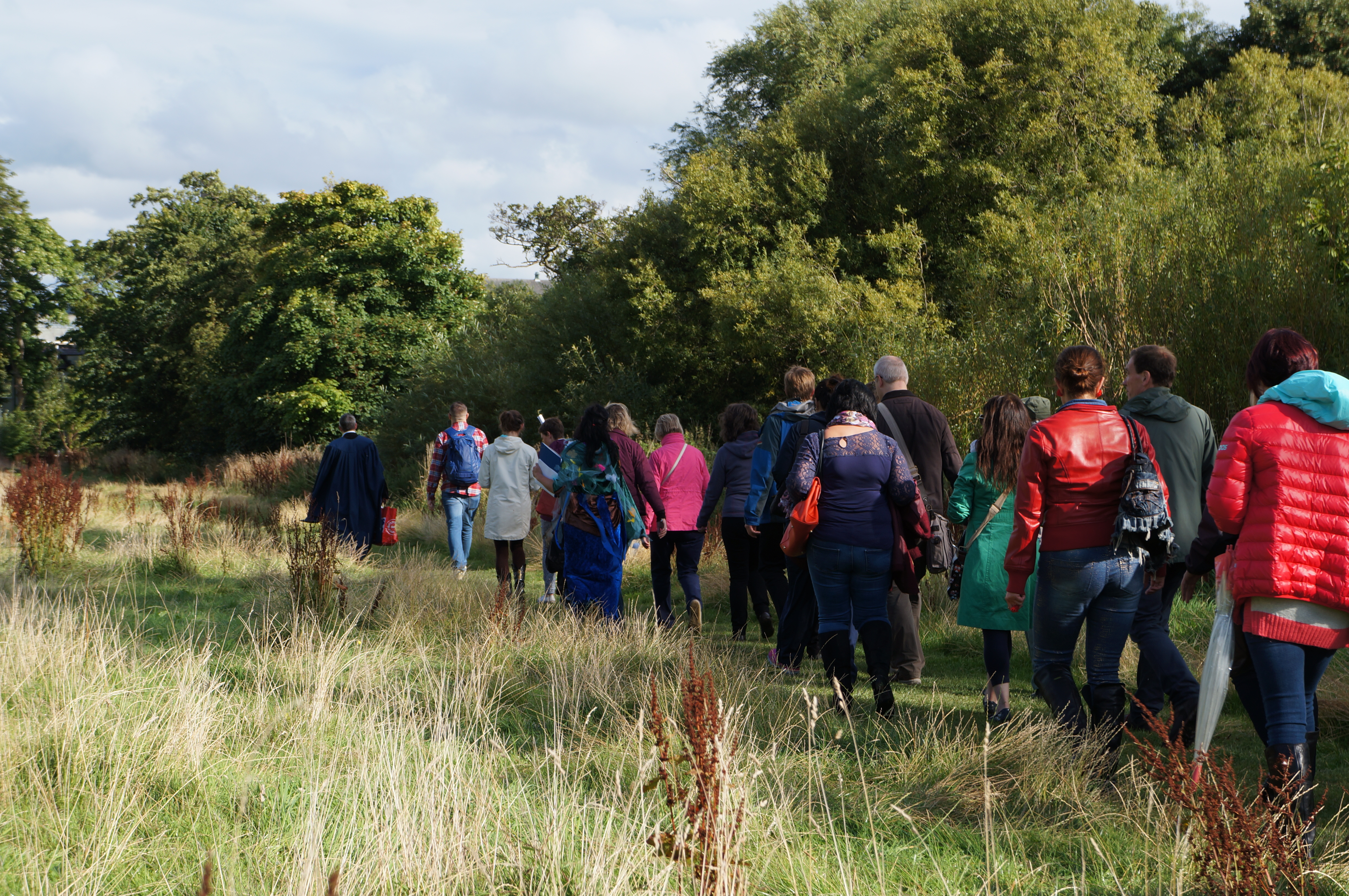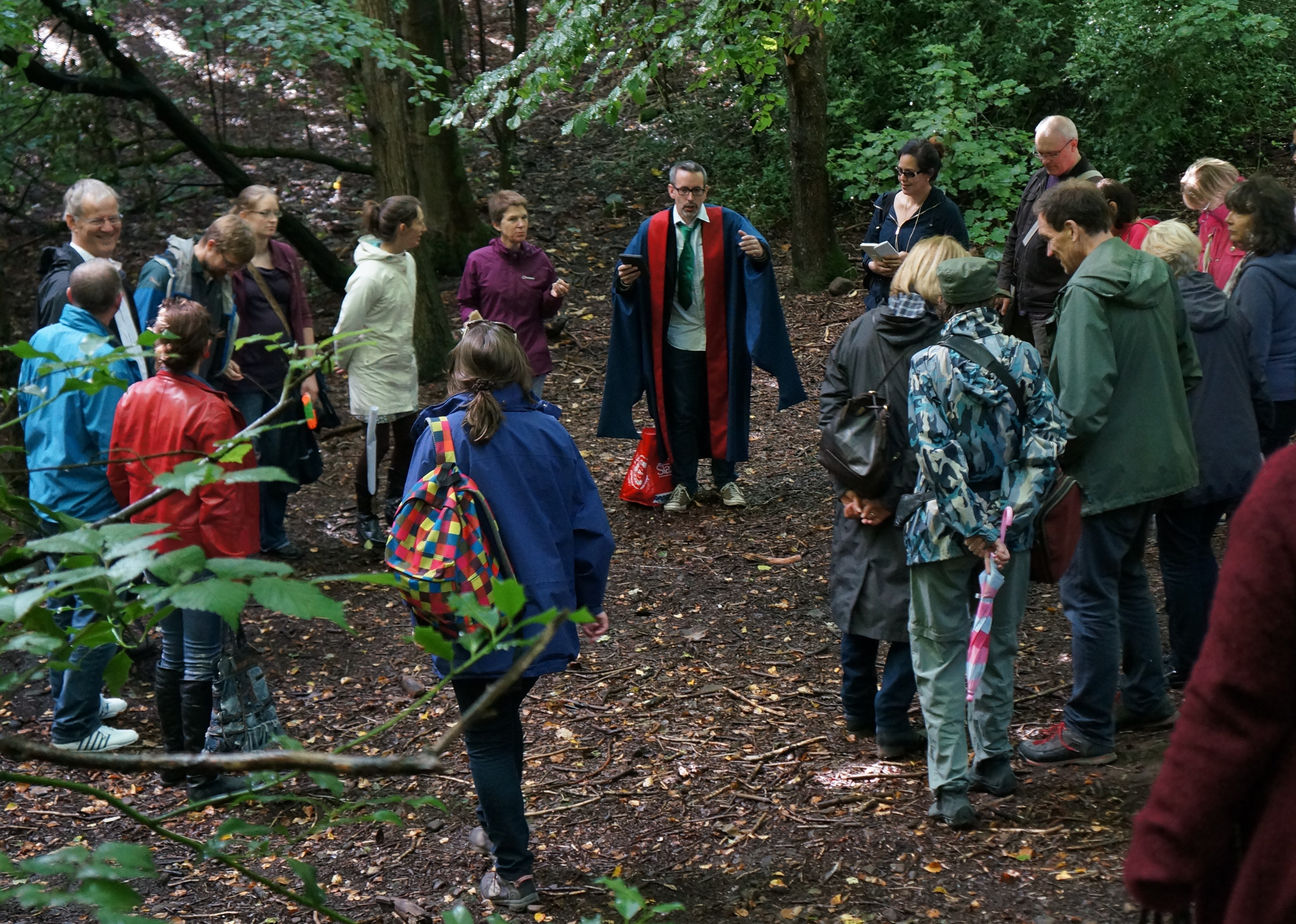 The woods, the Professor observes, are traditionally the place outside or beyond the threshold of a human community. They’re a mysterious place where dark things hide, where wolves become grandmothers, and where witches build houses of candy to ensnare children… The woods are a place where we encounter strangers — the ‘others’ who are not ‘us’ — but do those strangers bring us threats, or new opportunities? (During the Sunday walk, when Pauline Bradley-Sharp was unavailable to speak, our “substitute” guest at this point was a “stranger” to the community who spoke from amongst the circle… Professor Stephen Coleman, from Leeds University, is an expert on citizenship who shared some of his own observations on the themes of the walk…)