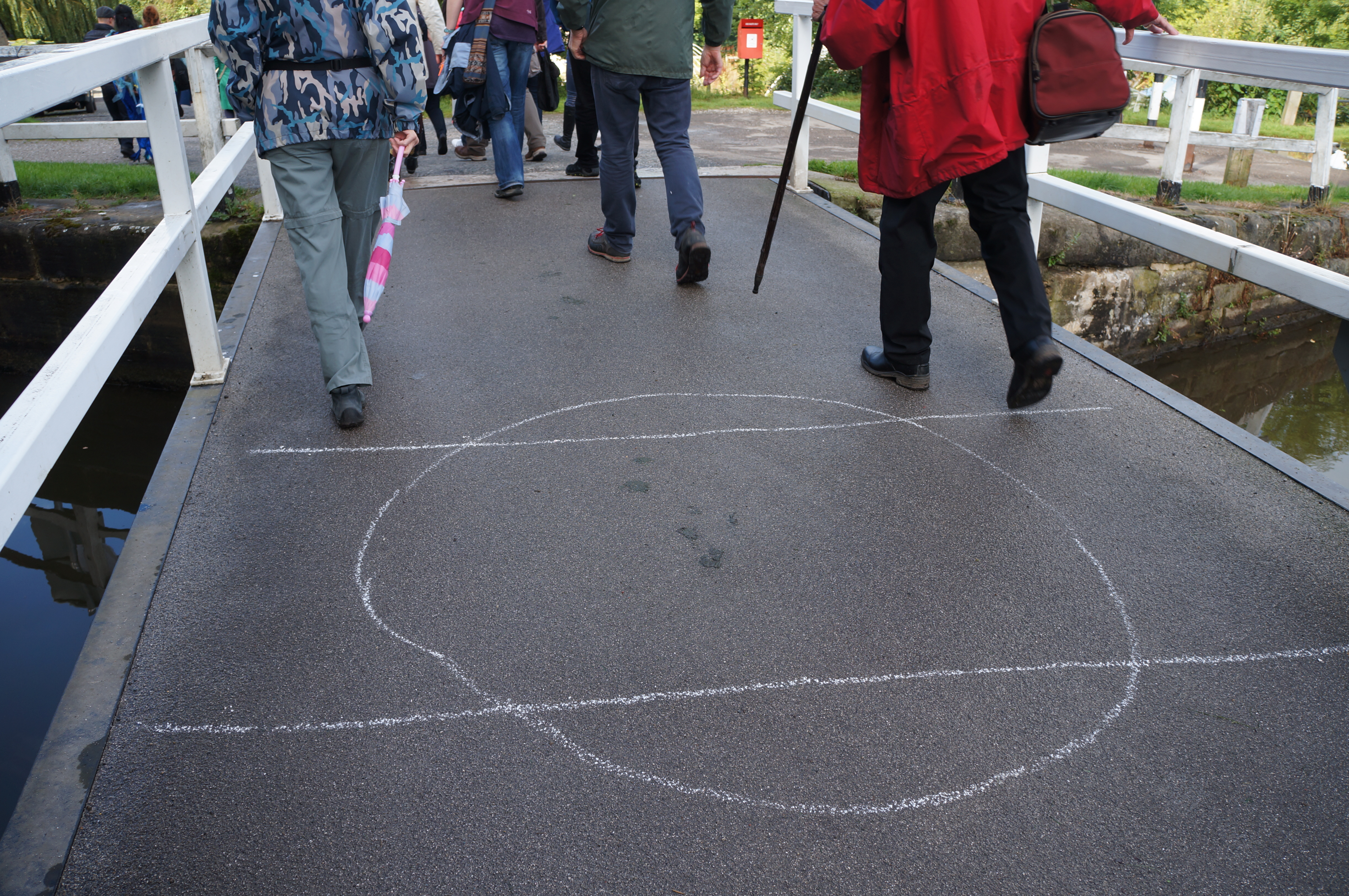 Emerging again from the woods, the group crosses the swing-bridge over the Leeds-Liverpool Canal, just beside Hirst Lock. In the photo above, the group is moving on after a brief, mid-bridge chalk-and-talk from the Professor… The parallel lines again represent a continuing transit route — in this case the 126 miles of the Leeds-Liverpool. The circle over the line represents the fixed communities through which barges traditionally travelled, bringing goods and gossip. Or perhaps it represents the micro-communities of men, women and children who lived permanently on the barges themselves…
