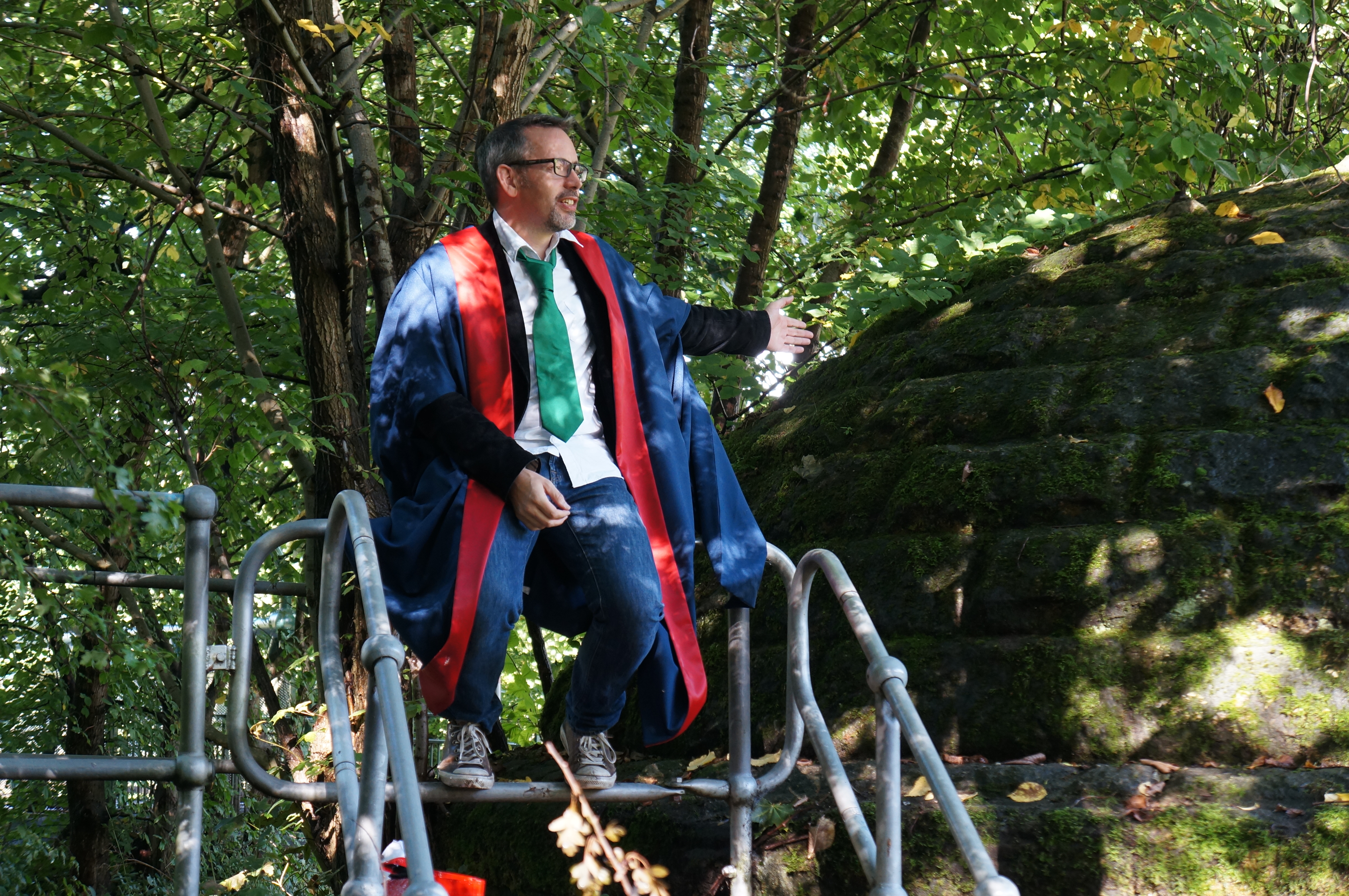 … And yet Hirst Wood estate, with its pretty front gardens (no space for that in Saltaire!), is far from being an “unpleasant” part of the valley! Moving West along Albert Avenue, the Professor explains that this estate has a distinct heritage of its own — stretching back to the prehistoric cup and ring stone that was found here. Was it perhaps a way-marker for Airedale travellers…?