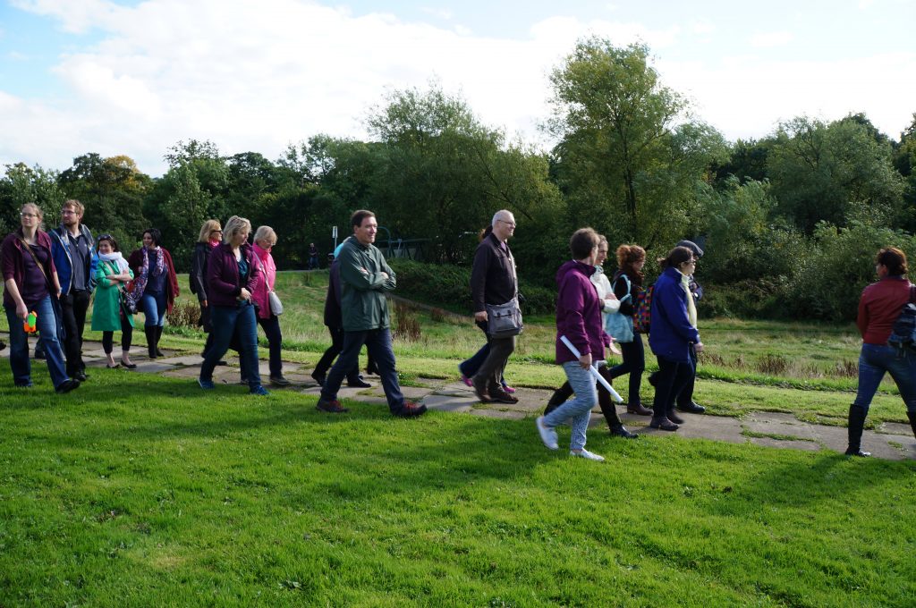 Here, we are greeted by our second special guest on the tour (although technically, we are guests in her nature reserve!). Pauline Bradley-Sharp is one of the chief movers and shakers in Hirst Wood Regeneration Group, and she who describes something of the enormous community effort that has gone into making the nature reserve (see this blog post for details). Walkers are encouraged to make donations in a bucket towards HWRG’s ongoing work, and then we head off across the adjacent, canalside car park and into Hirst Wood itself… stopping to consider items of interest along the way…
