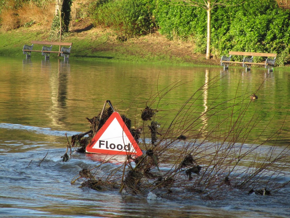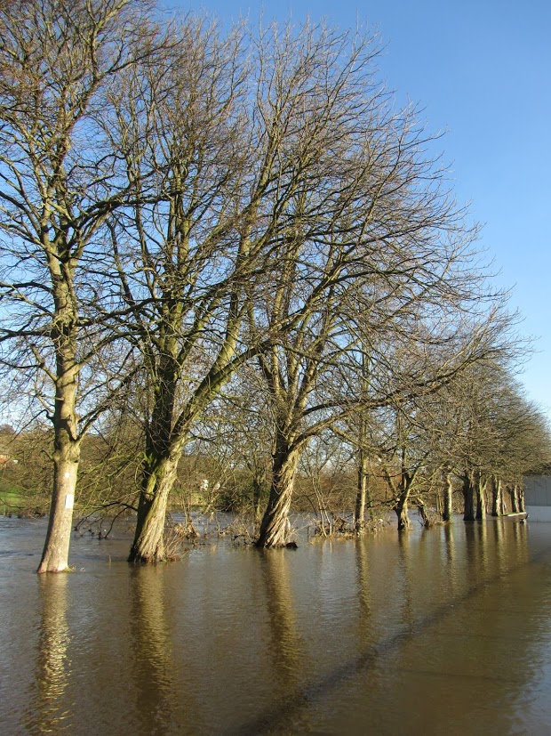 As in the shot of the trees, the blue sky, sunshine and reflections in the now-calm water make for quite a beautiful picture. Discussions about the flood have – quite rightly, focused on the miserable conditions in the days and weeks leading up to it – but it is worth remembering, too, that on December 27th the weather was stunning. I’m reminded of a lyric in U2’s song “Beautiful Day” (with its glancing reference to the story of Noah’s Ark): “See the bird with the leaf in her mouth / After the flood, all the colours came out…”