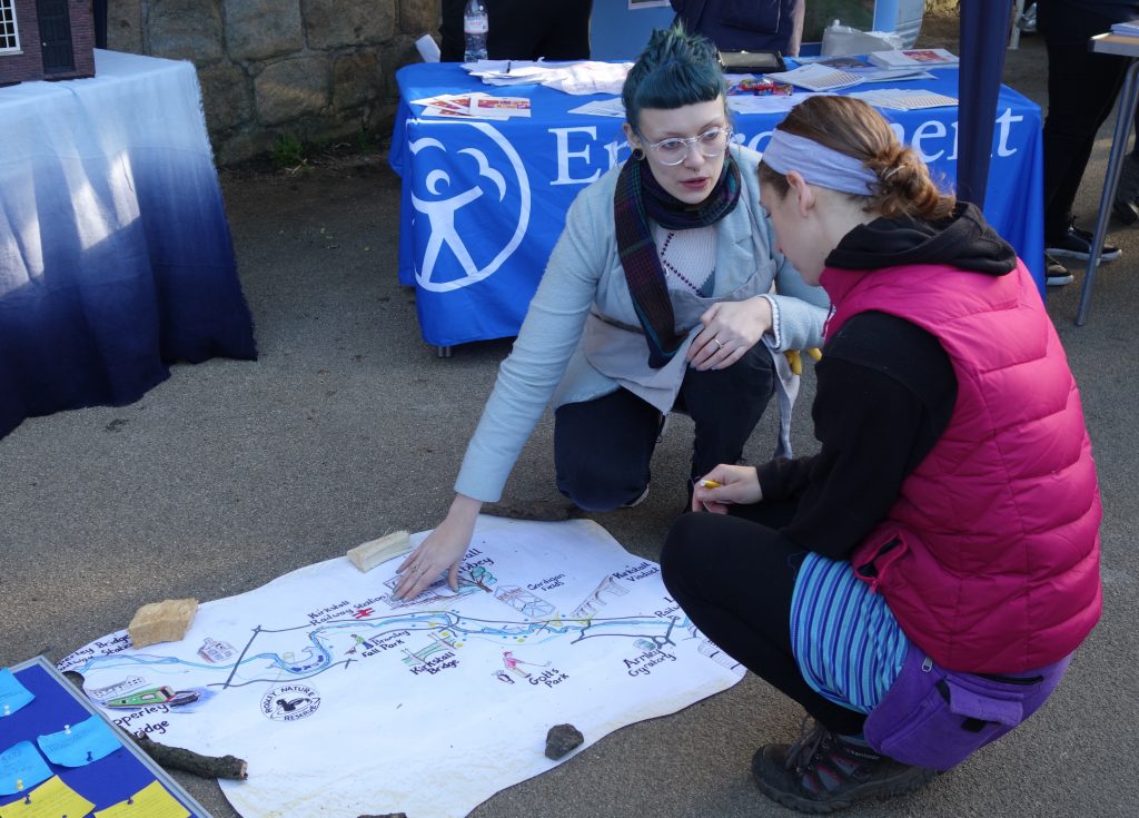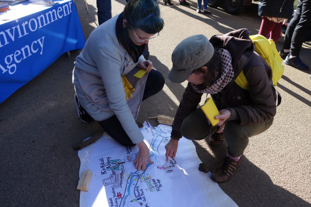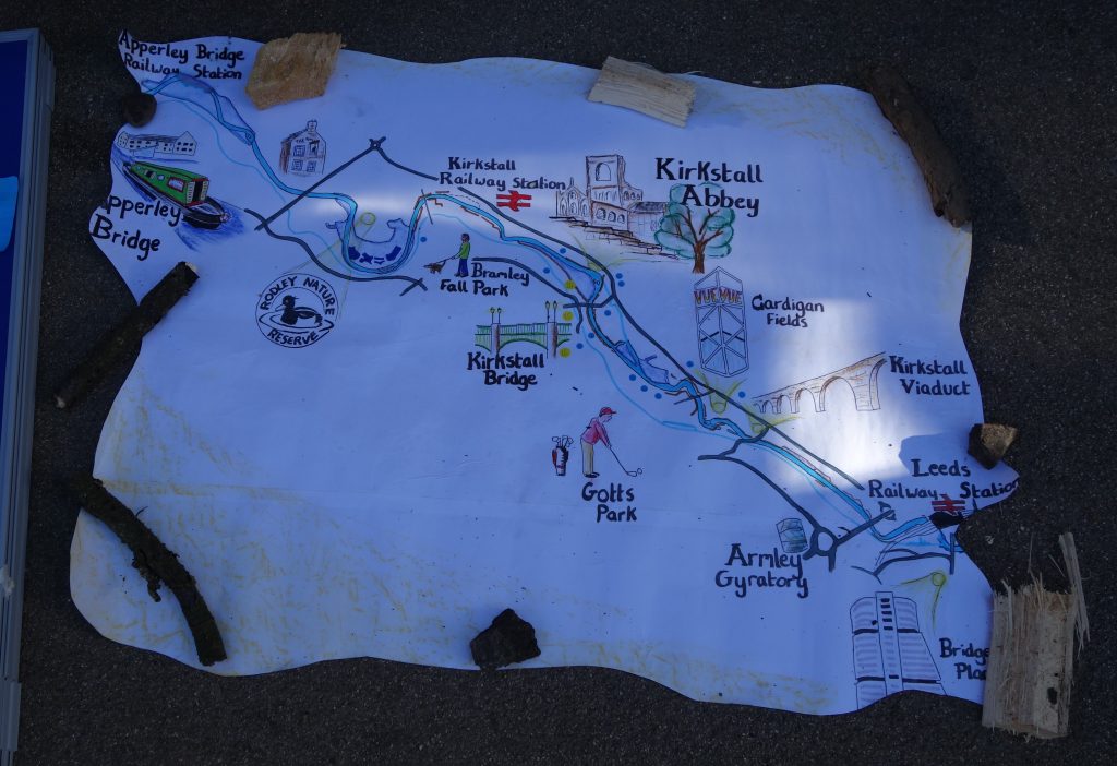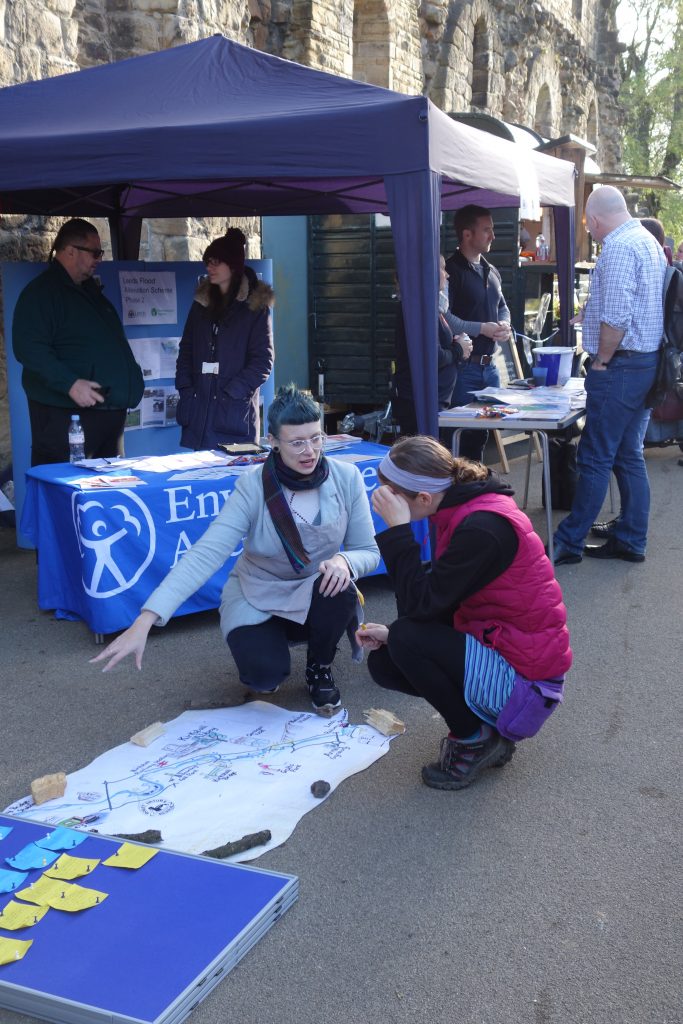 Jon Dorsett’s appealingly drawn map, which ties familiar landmarks to their (perhaps less familiar) places along the River Aire east of the city centre, had become slightly dog-eared by the time of this last consultation event at Kirkstall Abbey (not least after being rained on a lot in Rodley: we had to cut off the soggy corners…). But in a way, the ‘old treasure map’ feel that it acquired — combined with the “flood debris” used to hold it down — added to its deliberately informal, “home made” feel. This was in conscious contrast to the more “official” map appearing in the consultation document…