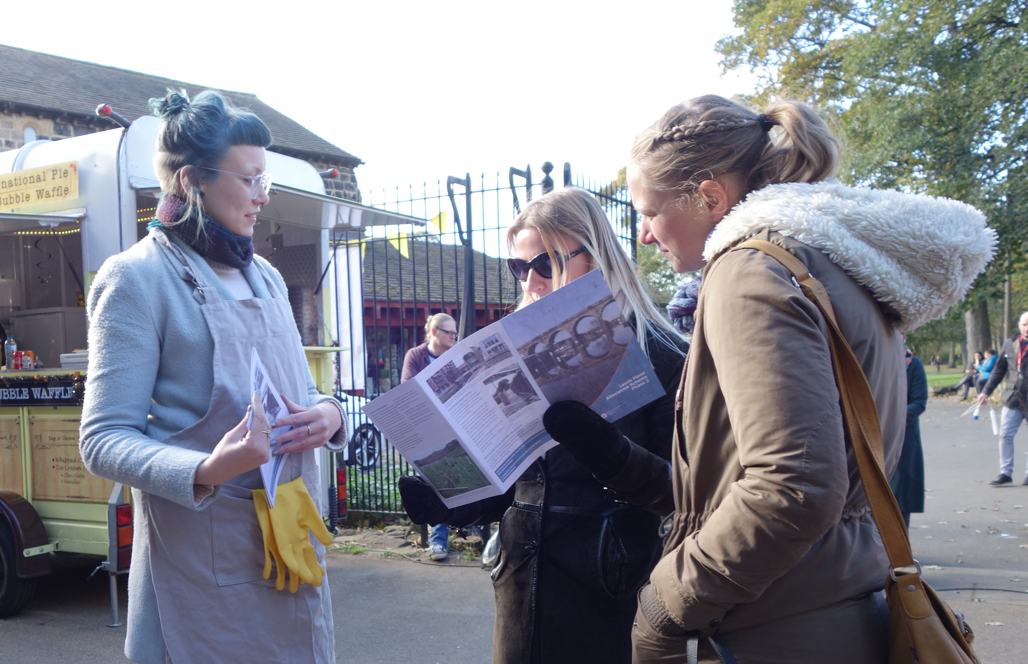 For the FAS2 consultations, however, Multi-Story Water had been invited to provide a complementary component rooted in participatory arts practices. For us, a big part of this was making sure we came out from behind the table and tried to engage passers-by more pro-actively. Below, on the left, is Alice Boulton-Breeze — in apron and Marigolds (symbolising the flood clean-up after Boxing Day 2015) — discussing the document with members of the public.
