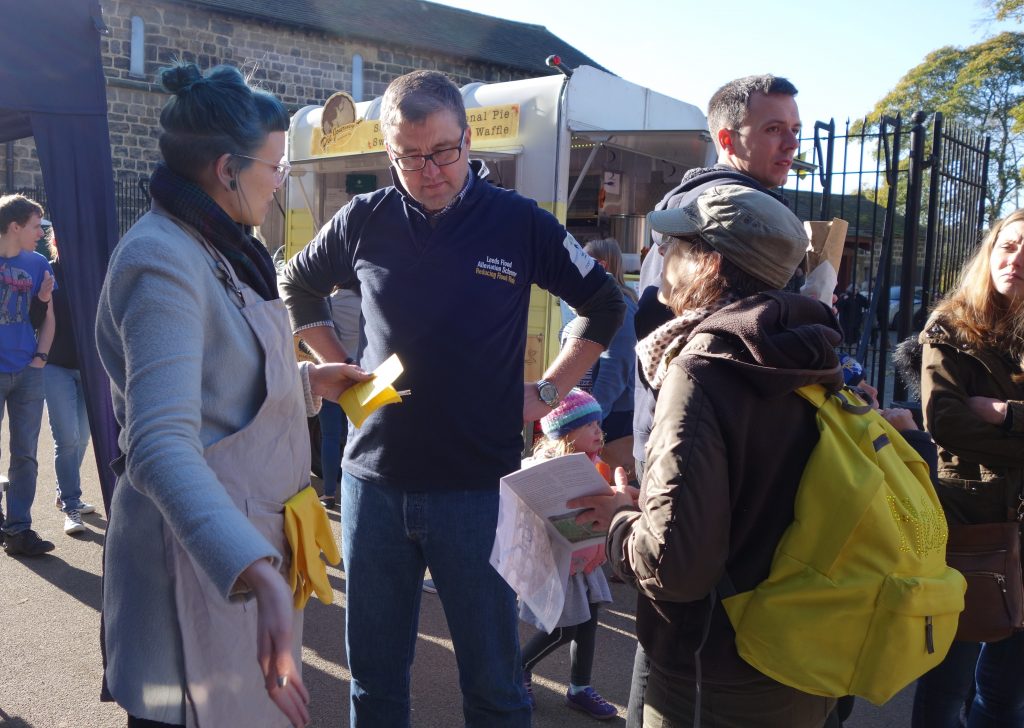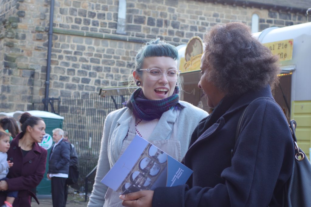 We had been asked to contribute to the consultation following the success of Weir Science, a performance event we devised for this year’s Leeds Waterfront Festival that highlighted parts of the now-completed FAS1. A consultation is not a festival, though (and the Deli Market context was the nearest we came to “festive” in October, after other events in libraries, pub car parks, etc.), and there was no finished installation (or even a definite plan for one) to “demonstrate”. So we adopted a less “theatrical” approach here, opting instead for improvised conversations around visual elements.