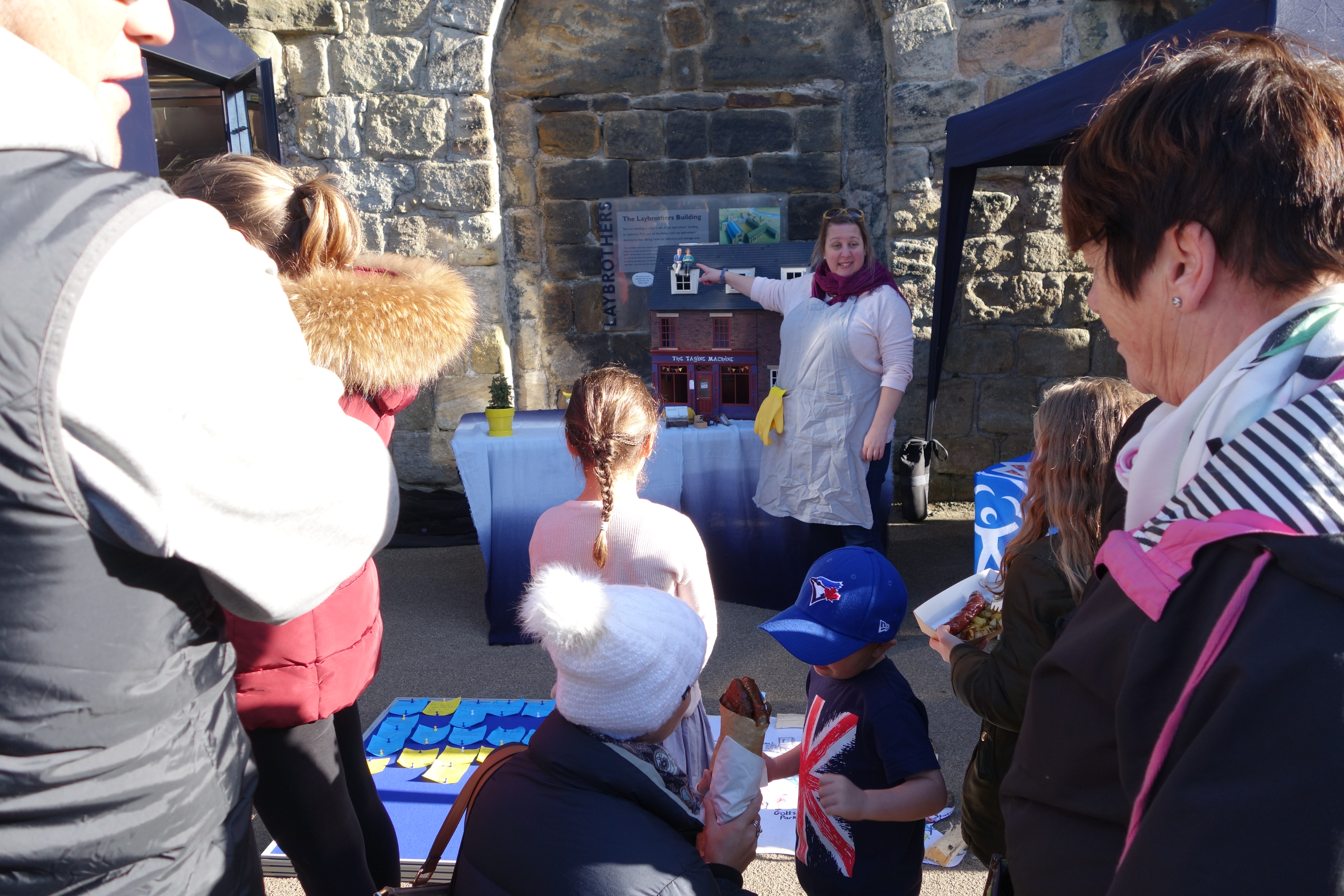 Here is Jaye Kearney (who worked in partnership with Alice at most of these October events: Phil Marken also stood in on a couple of occasions) pointing out the figures on the roof of our flooded doll’s house (a prop redeployed from 2016’s After the Flood).