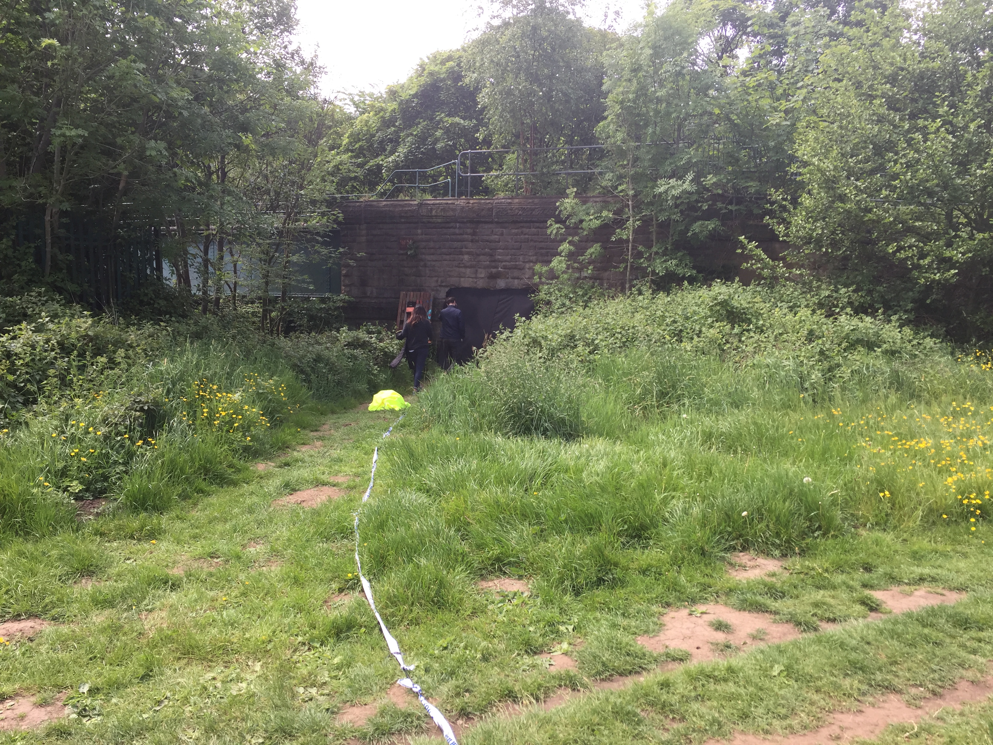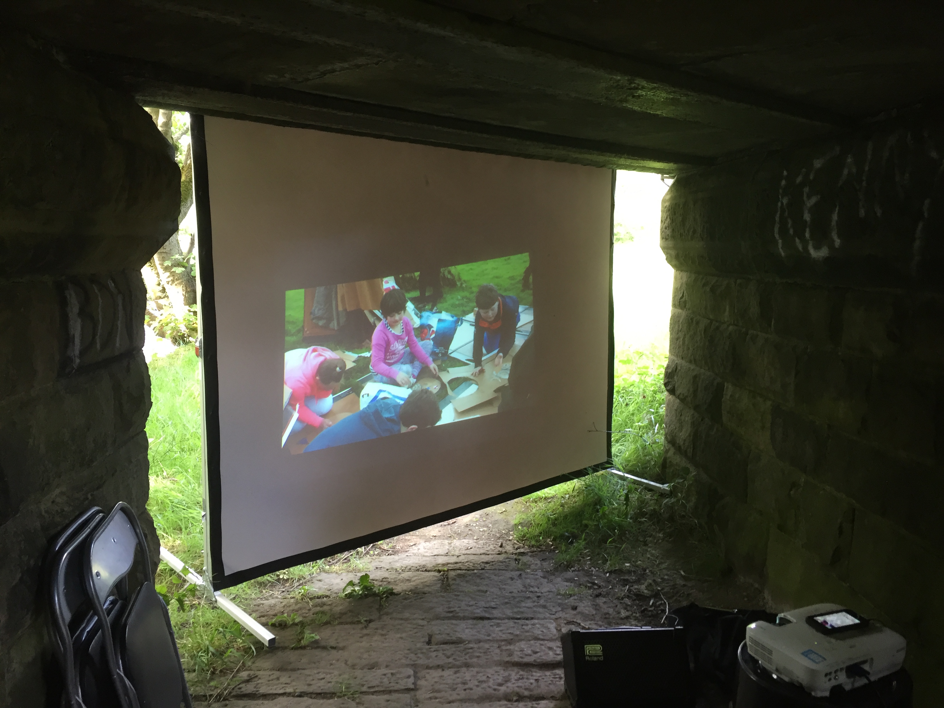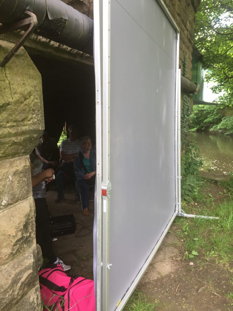 We made a little pop-up cinema in the small passageway that runs underneath the Barden Aqueduct — the stone ‘beehive’ structure at the end of the Higher Coach Road flood plain — to screen the world premiere of Floody, a 9 minute movie masterpiece made with the Young Artists of Higher Coach Road…