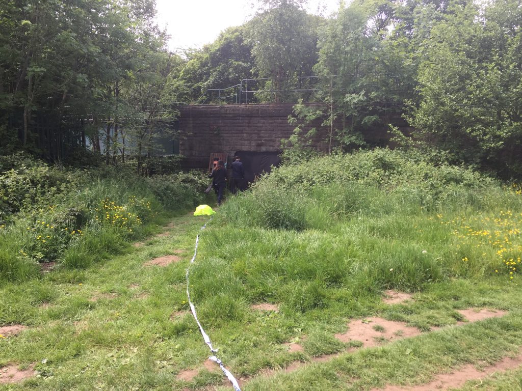 This was the view from ‘backstage’ area, looking towards the river and the rest of the aqueduct — which for 150+ years has carried water supplies to Bradford, en route from the Yorkshire Dales. This passage under the pipe bridge was itself completely submerged during the major flood on Boxing Day 2015 — another reason why we dubbed this pop-up space “The Underwater Cinema”…