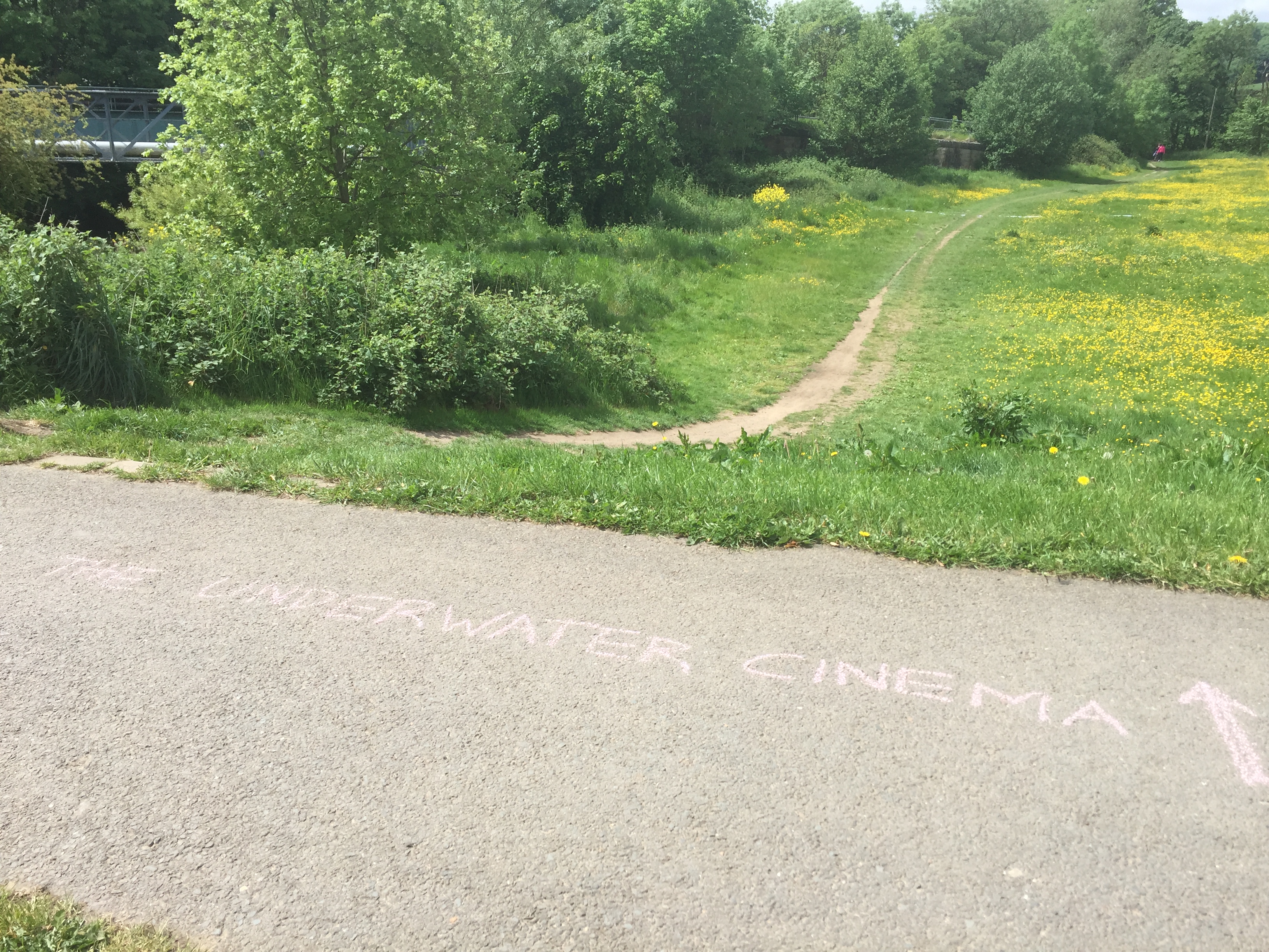 Here’s the entrance to the cinema (with a couple of lucky punters just entering!). It was identifiable mainly by the bit of black cloth hung across the entrance, to block out light, and the tell-tale sign of the hazard-taped extension cable carrying power to the projector from the nearest house… Audience capacity was limited, but at 9 minutes long we could restart the film regularly for the next group of passers-by, and we had a pretty steady stream of visitors, coming off the riverside path near the footbridge across the Aire…
