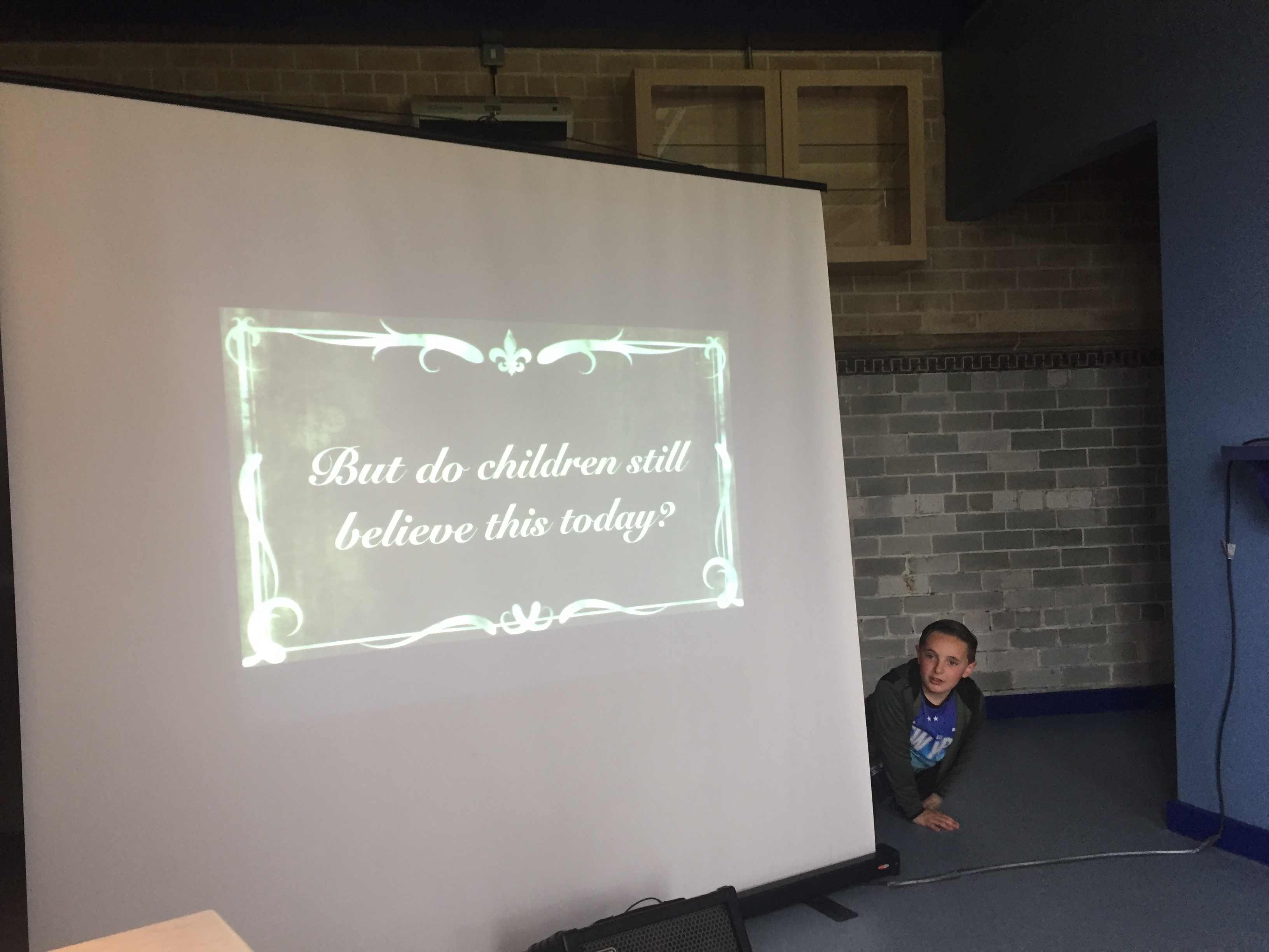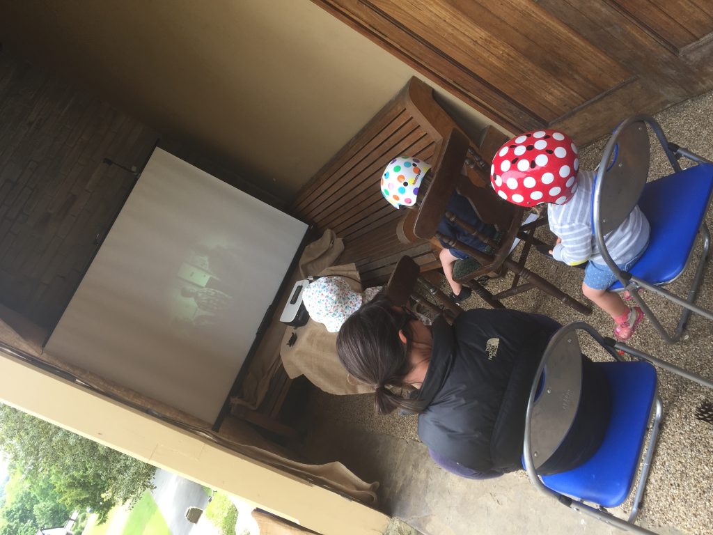 Having opted for a single location, we alternated screening both films for a few hours to customers coming into the cafe. I have to say that the atmosphere wasn’t quite the same: both films had worked particularly well in their sited settings (monster movie in the dark under the bridge; sepia cinema on the park promenade…) and the more neutral cafe setting didn’t have quite the same charge. But The Salt Lions could at least be seen better… Meanwhile, the kids themselves became the show, hiding behind the screen and popping out at the end (as if breaking out of the film!) to bow for applause and even take questions…