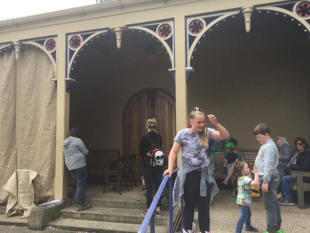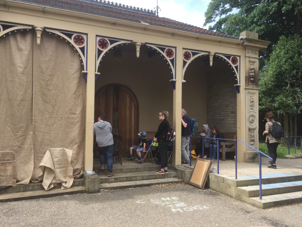 Despite our best efforts with hessian hangings, it was difficult to mask the light out as much in the park shelter as under the aqueduct, so the film image was fainter and smaller (as the projector had to be placed fairly close to the screen). In a weird way, though, this complemented the silent movie “look” of the film, making it feel very old school indeed, like an old fairground cinematograph… And certainly audiences did not complain (kids of all ages, used to hi-tech digital gadgetry, watched this flickering image with rapt attention!). There was something about the film that just worked in this setting at the end of a Victorian park promenade… which of course was part of the intention.