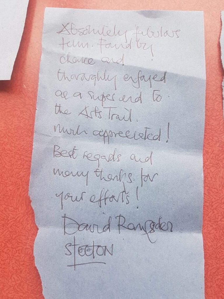 This is Hannah, who features prominently in both our films – as she’s one a hard-core group of “young artists” who were ever present during the making of them. (Many more tended to come and go, depending on weather and mood…) Among the other stalwarts were Leo and Oliver – pictured below. These three not only hung out supporting the screenings at park and pipe bridge all day Sunday, they also showed up bright and early on the morning of bank holiday Monday having overnight prepared a new advertising hoarding for the park screening. Not only that… they had hand-signed whole fistfuls of autograph slips to hand out to their adoring public… (in their hands below)
