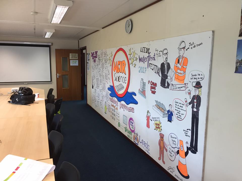 We’re also hoping that our conversations will also generate some interesting feedback “data” for the FAS team. In particular, it’s hoped that a hand-drawn map of the Aire between Apperley Bridge and Leeds city centre – which we’ve commissioned from Jon Dorsett, who also did the Weir Science mural pictured above – will provide a usefully interactive way to visualise the proposed FAS2 innovations, and to encourage public responses…