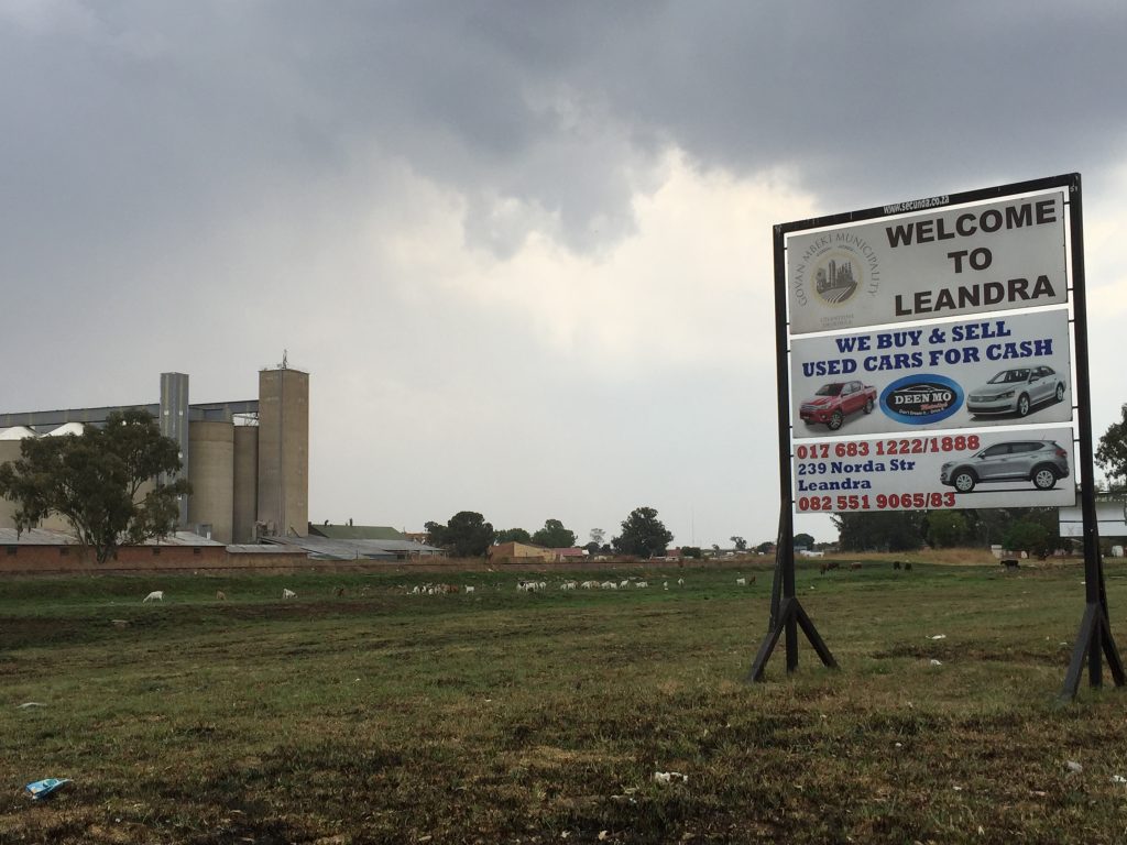 The location for this research has been Leandra, a township in the Govan Mbeki region (a couple of hours from Pretoria and Johannesburg). As you drive into town, passing this welcome sign, you come immediately to another hoarding warning residents and visitors to save water.