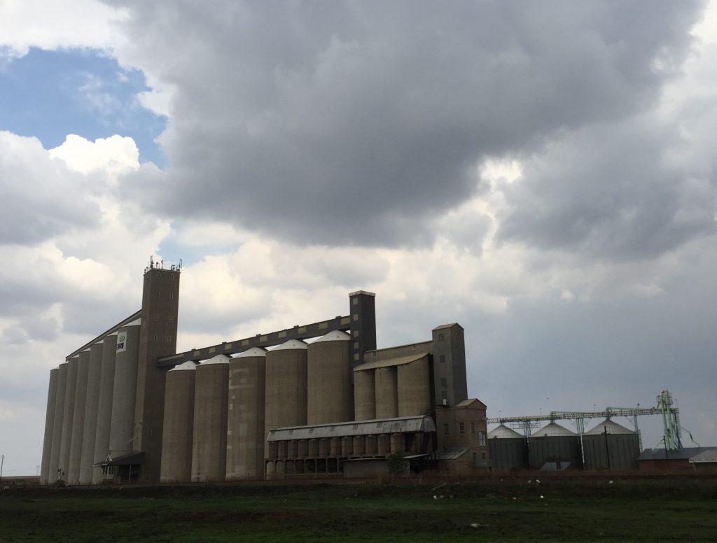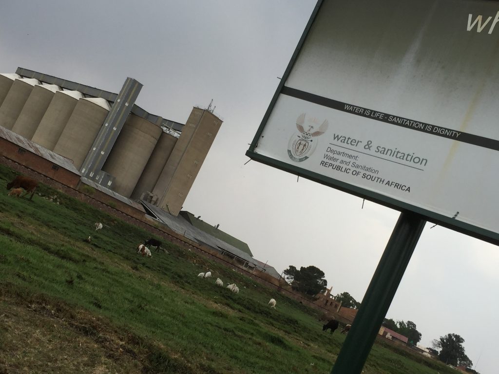 “Water is life – sanitation is dignity”, reads the small print on the poster. But life and dignity are impacted by more than just water shortage when water is short here. This is a predominantly rural area, whose residents traditionally survived through subsistence farming. Nowadays, what with industrialisation and globalisation, the farms have become big commercial enterprises – with giant maize silos like the ones you see here. In drought conditions, workers on the farms and at the silos simply get laid off because there is not enough work for them to do. And that leaves them unable to buy the food supplies that they would once have grown for themselves…