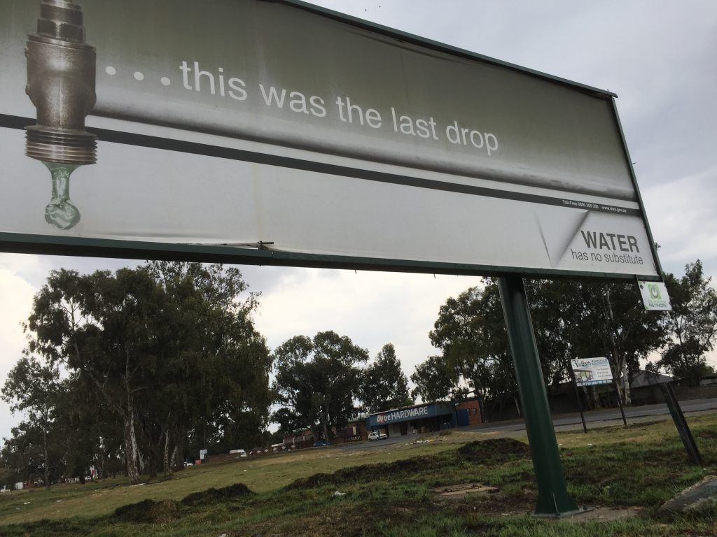 In South Africa, they call it “informal housing”. Shacks built of corrugated metal — or anything else lying to hand — get put up without consent or planning permission on land that has simply been appropriated by people too poor to aspire to anything else. Such homes, as you would expect, do not have proper plumbing or sewerage, of the sort we simply take for granted in the UK. Most people have to walk to get water, and the distances they walk get exponentially longer in times of drought. Little wonder, then, that people here are regularly lectured about saving water by the authorities — via billboard messaging of the sort pictured above, as well as by lessons in school, and so forth.