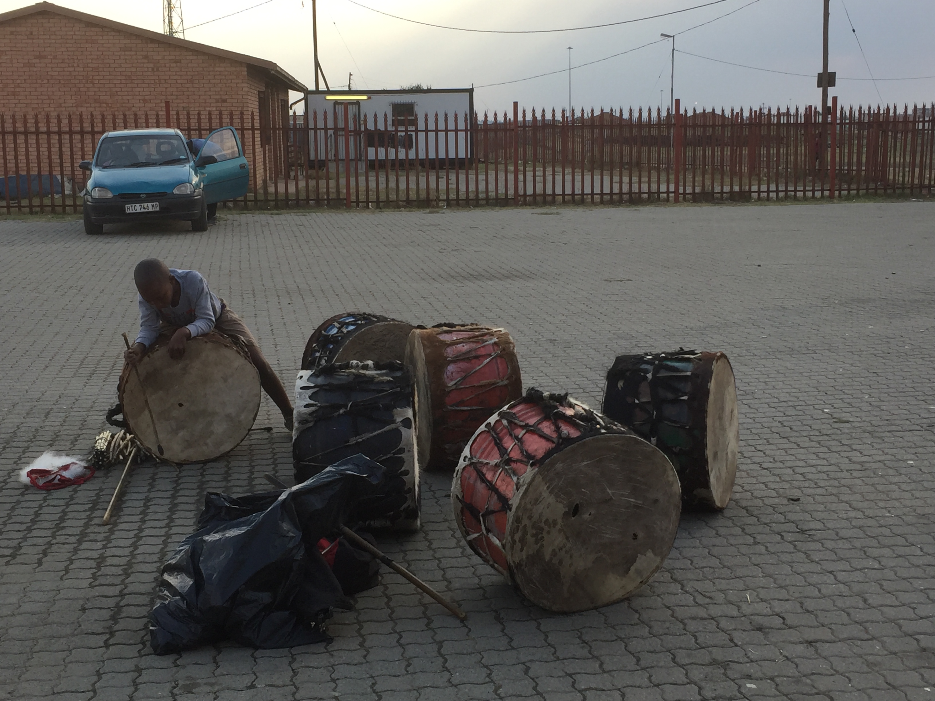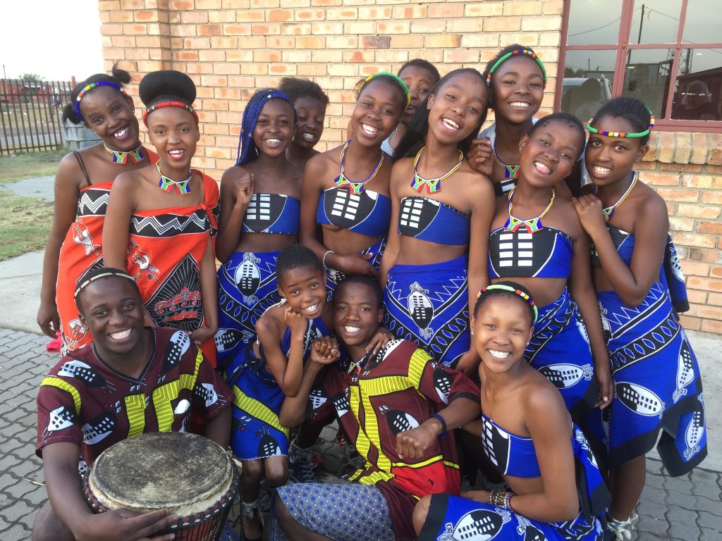 This is a “selfie” of me with Thato — one of the young people from Leandra who has been particularly involved with the “Patterns of Resilience” project. We’re comparing our Converse Chuck Taylor’s, but beyond that, she’s actually much more stylishly dressed than I would know how to be! (And check out the Chanel logo on the person next to her…) I’m told Thato is also a talented artist in her own right — an amazing drummer and percussionist — and while I didn’t get to see her perform, the project event we attended at the local community centre did conclude with an extraordinary demonstration of collective, local talent by the Umdzabu Cultural Group — some of them pictured here in their more traditional performing costumes…