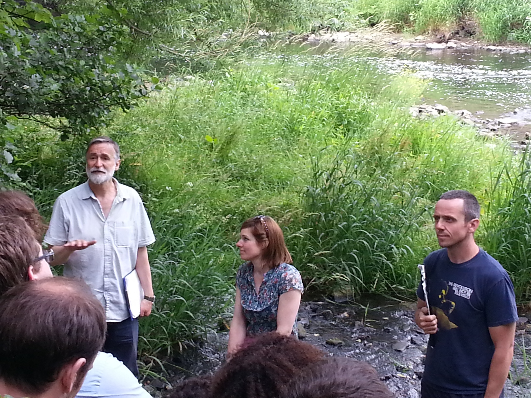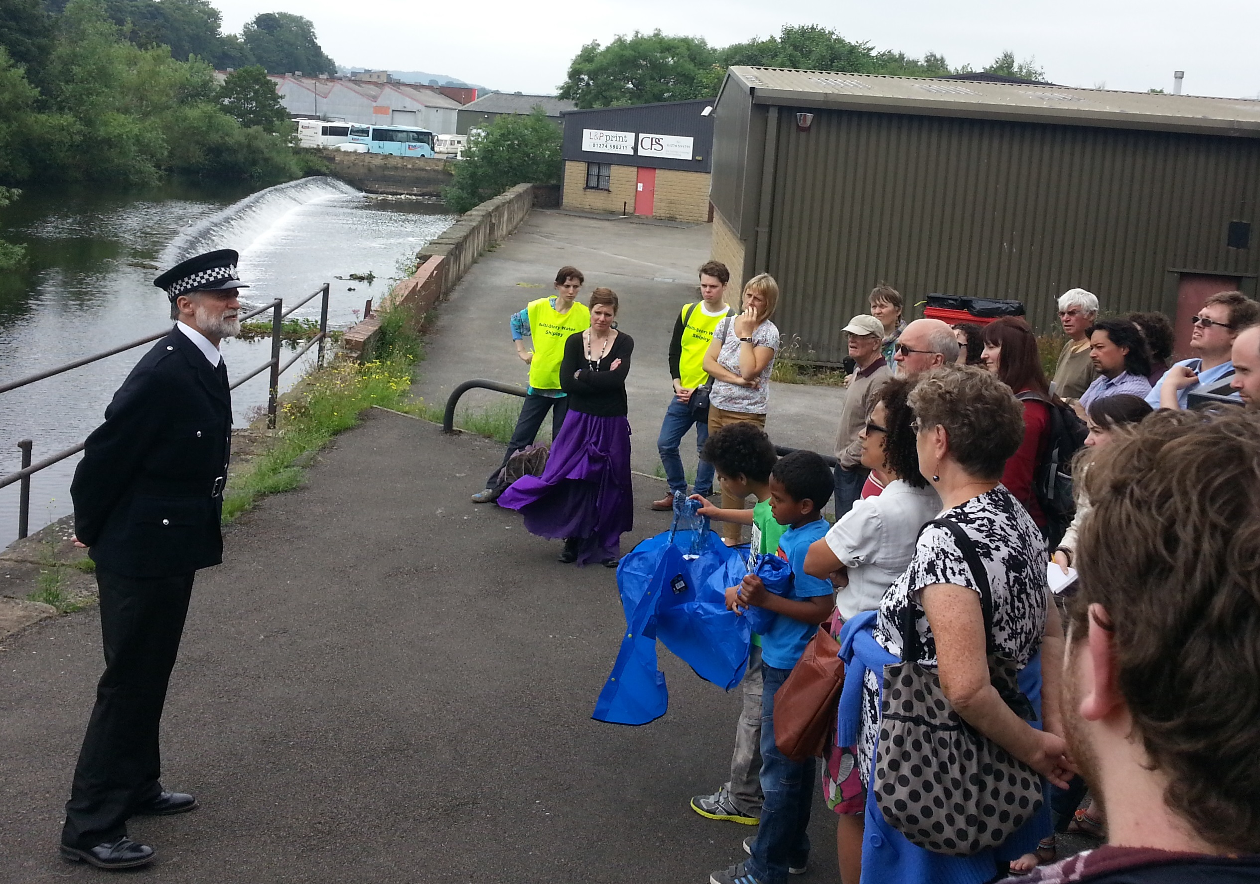 One of the hardy audience members who undertook all three legs of the tour on the Friday night, and then e-mailed a response to us, described the experience as “really unexpectedly special and magical, with a (good) increasing sense of unreality towards the end, particularly when the free beers appeared!” You can’t do much better than that for feedback, but I can also say without big-headedness that know exactly what he means… That’s because, even as one of the people who did most to devise this event, I found that it continually took me by surprise, as the light and weather conditions interacted differently with the acting and narratives to create different moods and conditions. And Friday night’s Red Route, in particular (i.e. “towards the end” for the respondent above), was just glorious… It had been a scorching hot week, but the cool of the evening was great for walking even as we benefited from the last of the golden sunshine. We had a great turn-out for the walk that evening, and sights I’d never seen before – as when, walking through Victoria Mills with “Andrew Mason”, we were confronted with a courtyard full of residents basking in the sunshine (when 9 times out of 10 that whole intererior area of the Mill complex seems deserted). Actor Rob Pickavance took this brilliantly in his stride, hailing the residents and even briefly name-checking one of them he’d previously met. It looked, for all the world, like he really did own the place (and indeed, another e-mail respondent who had not seen Green Route before Red – and thus not encountered Rob before – admits to having briefly thought this was Andrew Mason…). The journey onward from there that evening did indeed seem to become “increasingly unreal” as we journeyed across Baildon Bridge to hear stories of the flood chaos in 2000 (on this balmy summer evening with the river at minimum flow!), and then along that broken riverside path towards Lower Holme, to hear the bleak story of the residents there… Cutting our way along that path, through all the overgrown summer riverbank foliage (I keep seeing purple amongst green!) was just amazing… And in a sense all we’d done was to “frame” this pre-existing space as an “event” in this particular moment in time… Of course on other runs of Red Route during the weekend, as solid cloud cover set in, the whole atmosphere was much less golden — a cool wind started whipping at us (visible in the play of Lynsey’s skirt in the shot below, again taken by Milan on Sunday afternoon), and that too seemed eerily appropriate to the tales of mill demolition and lost community that come towards the end of the tour… Yet it made for a very different audience experience!