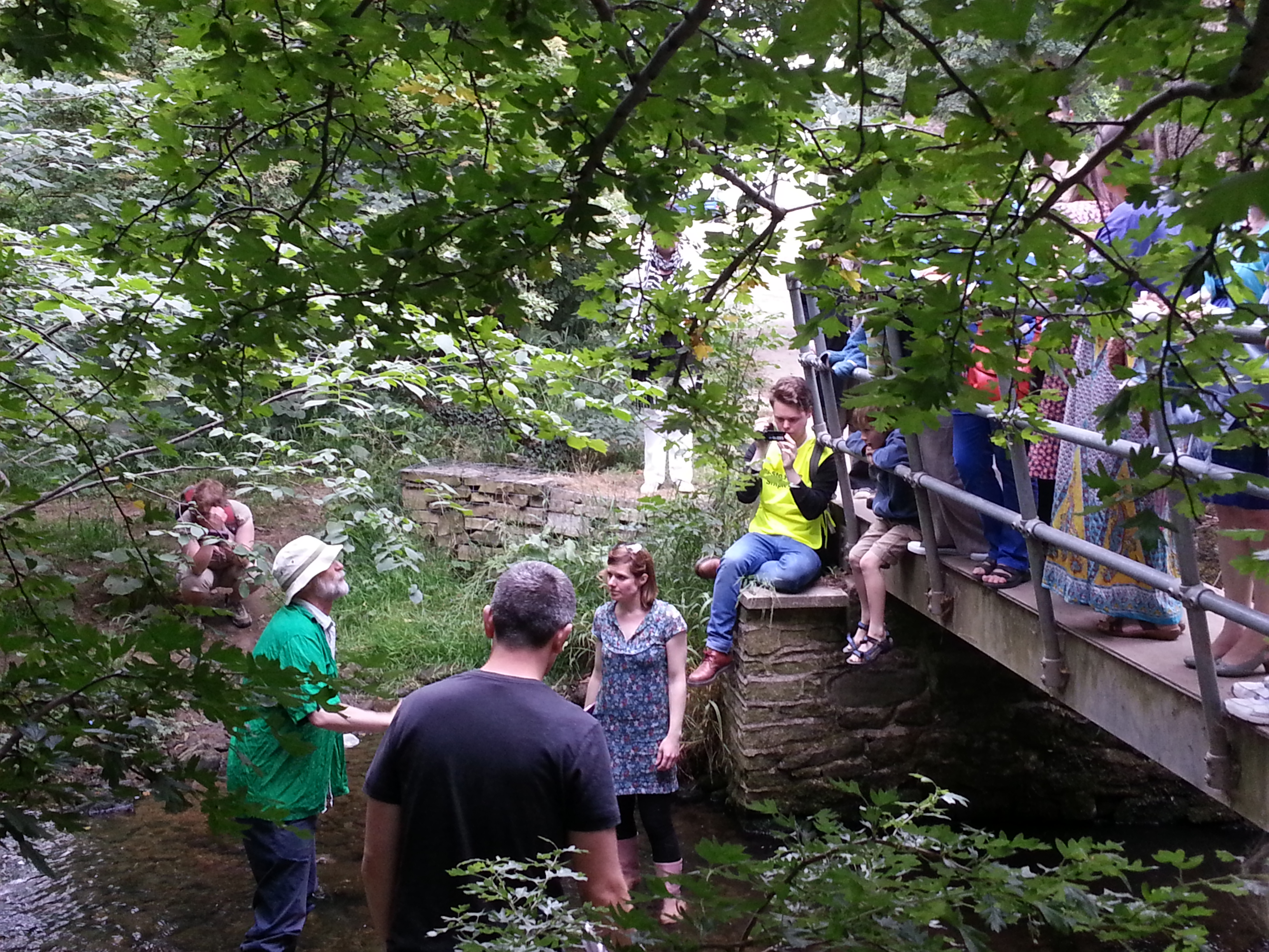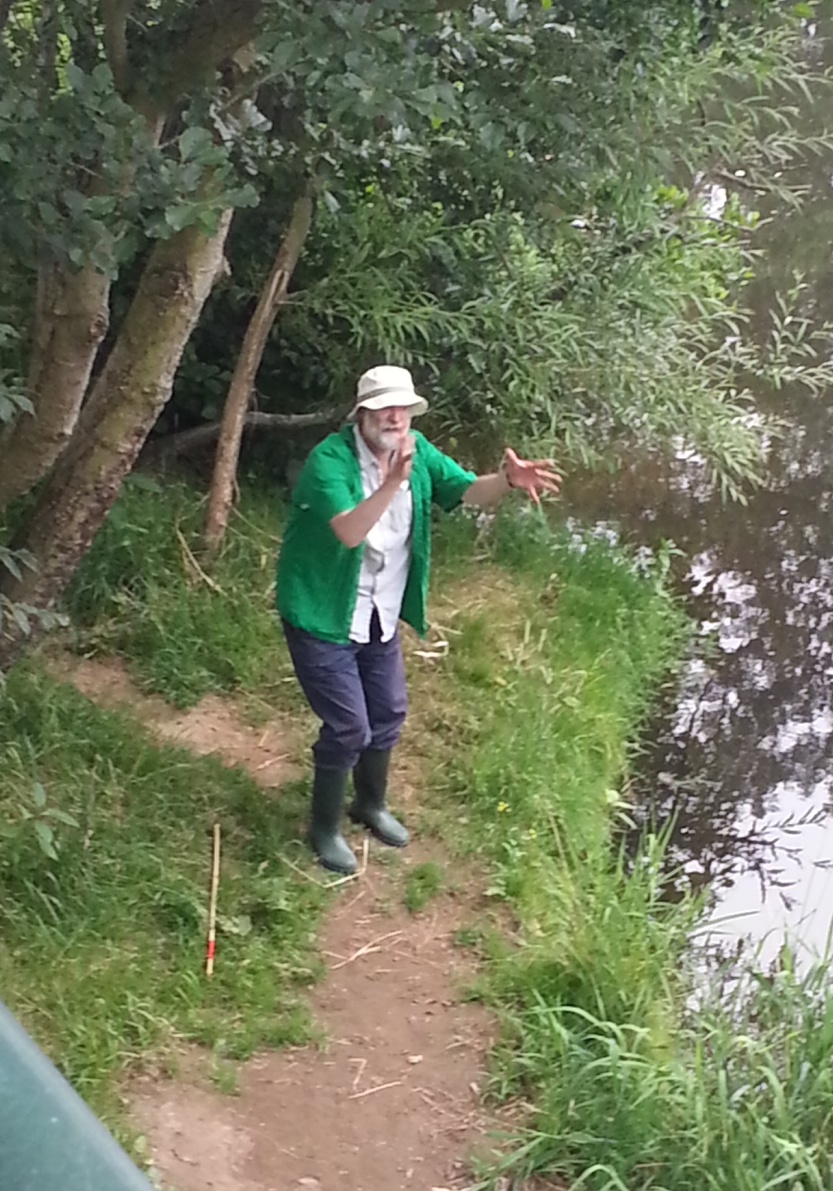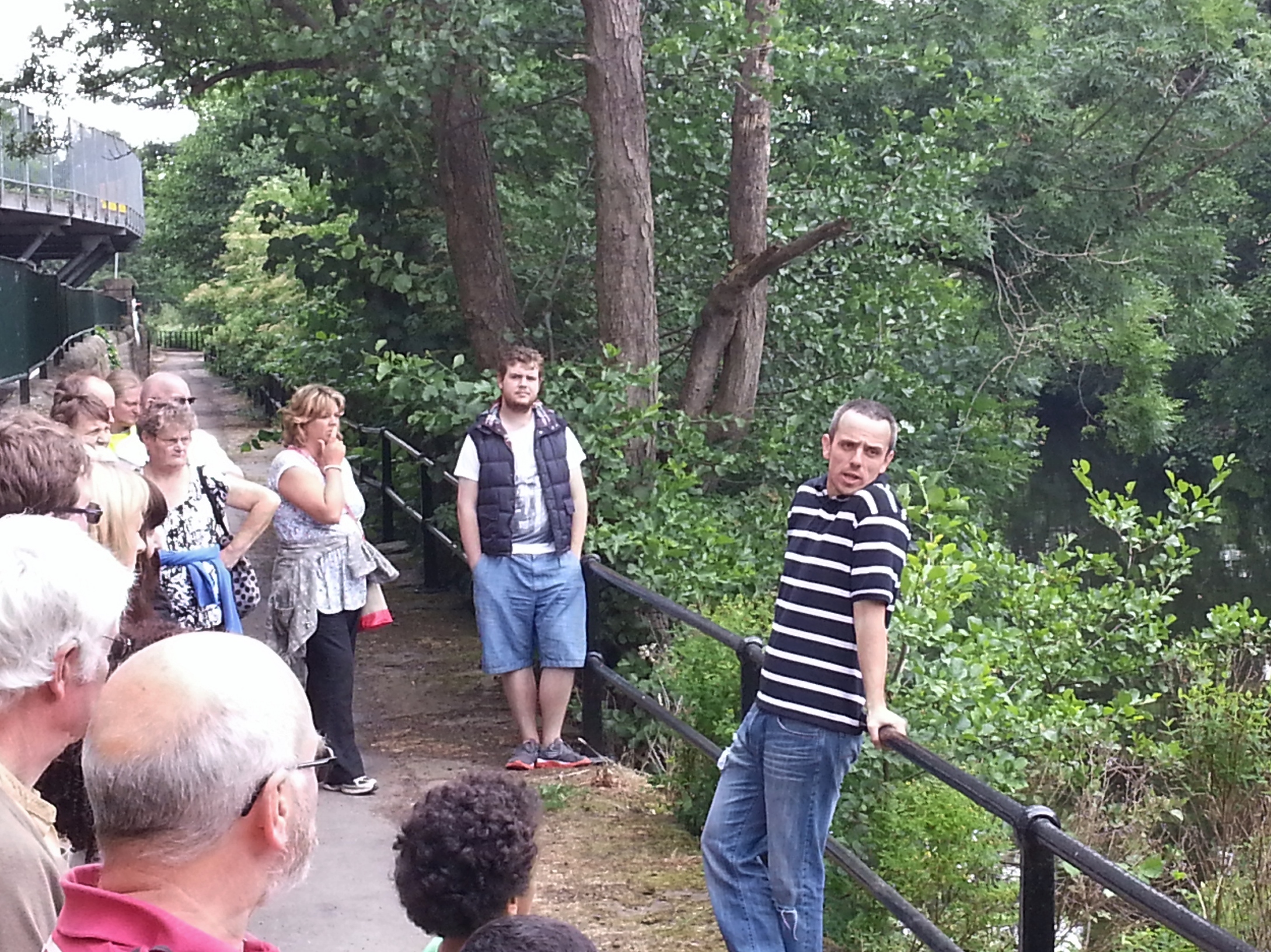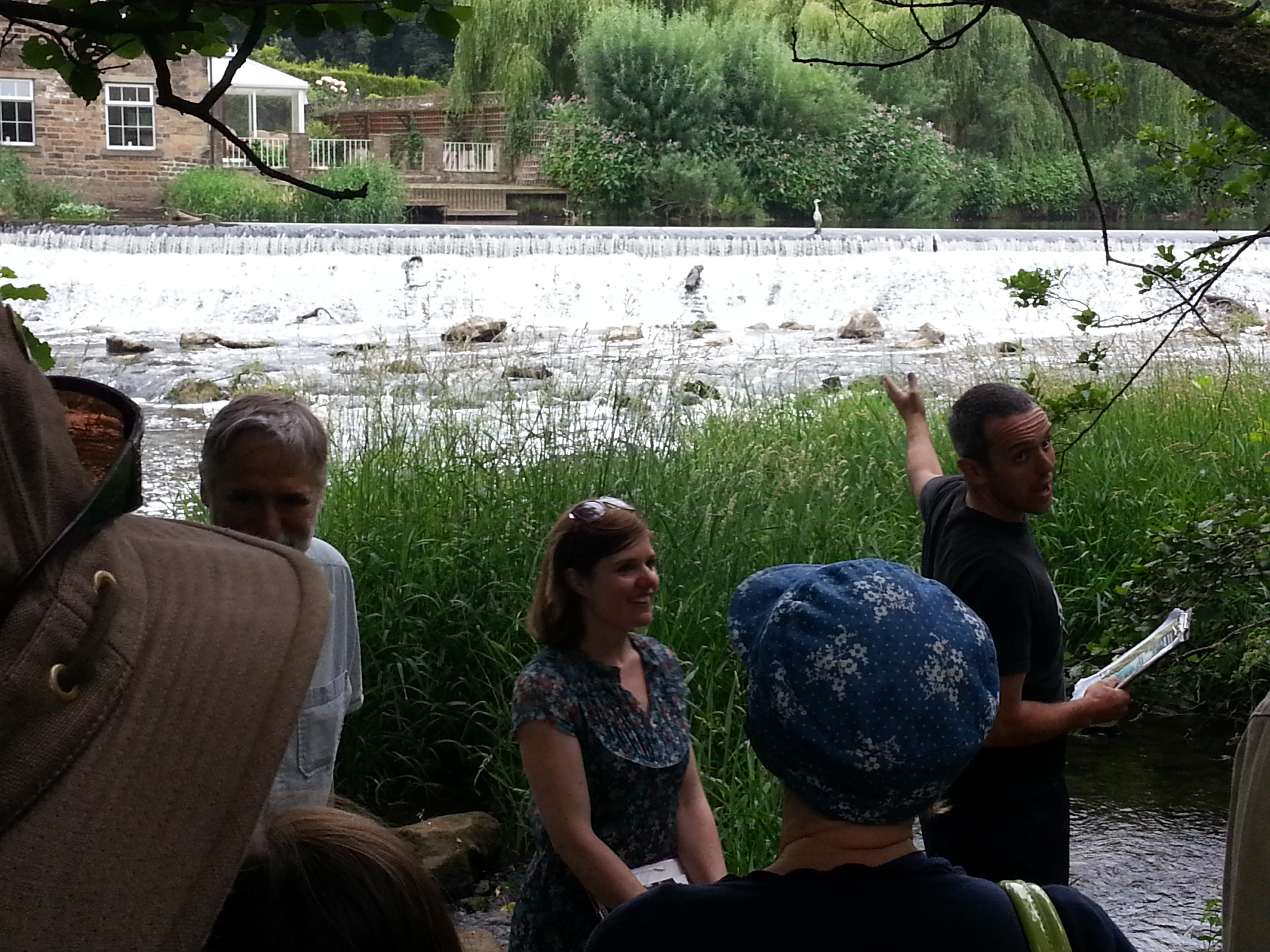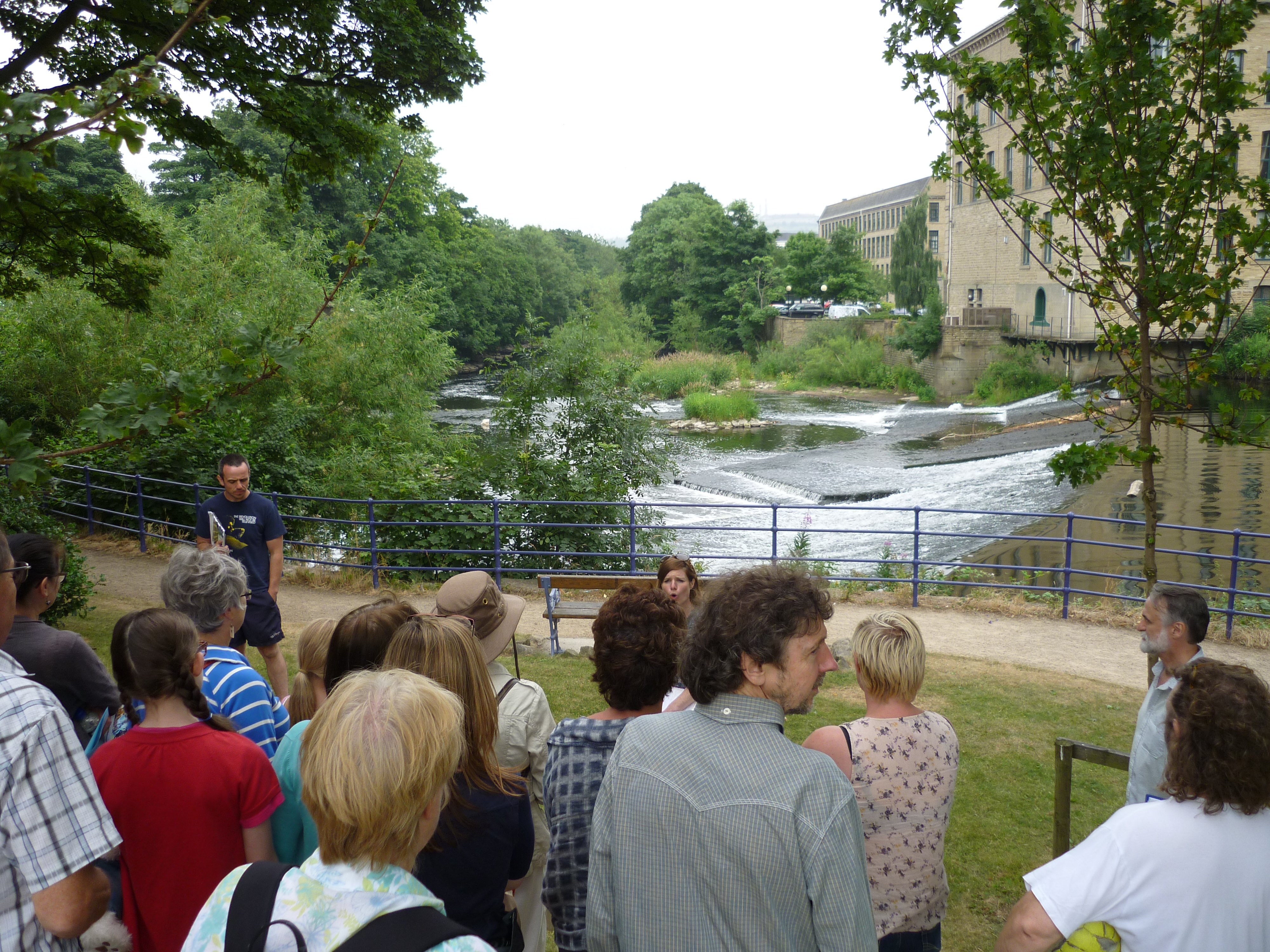 Completing a little trilogy of weir pictures, here’s Saltaire weir at the start of Green Route, showing clear the very low water flow (including a whole central chunk where there’s hardly anything going across it at all). This was another strange thing about reviving the show this July… Last year, which turned out to be the wettest on record in the UK, the conditions were generally soggy and green, and the stories of flooding seemed quite immediate (indeed, there was major flooding elsewhere in Yorkshire, on the Ouse, within two days of our last performance!). This year, July had mostly consisted of a heatwave up to the point of us performing… the ground was parched, grass barely green at all in places, but you could see this as the other hydrological extreme that “Bradford Council” warns us (in the “hydro” scene at this weir) may occur more frequently with a changing climate… Indeed, playing “Neill Morrison” in this section, Paul was able to throw in a reference to something I’d heard on the radio — that this July was on track to be the driest since 1825! (Of course that probably all changed with the thunderstorms we’ve had in the week since the performances — but even these are arguably indicative of a change towards more “tropical” weather…)
