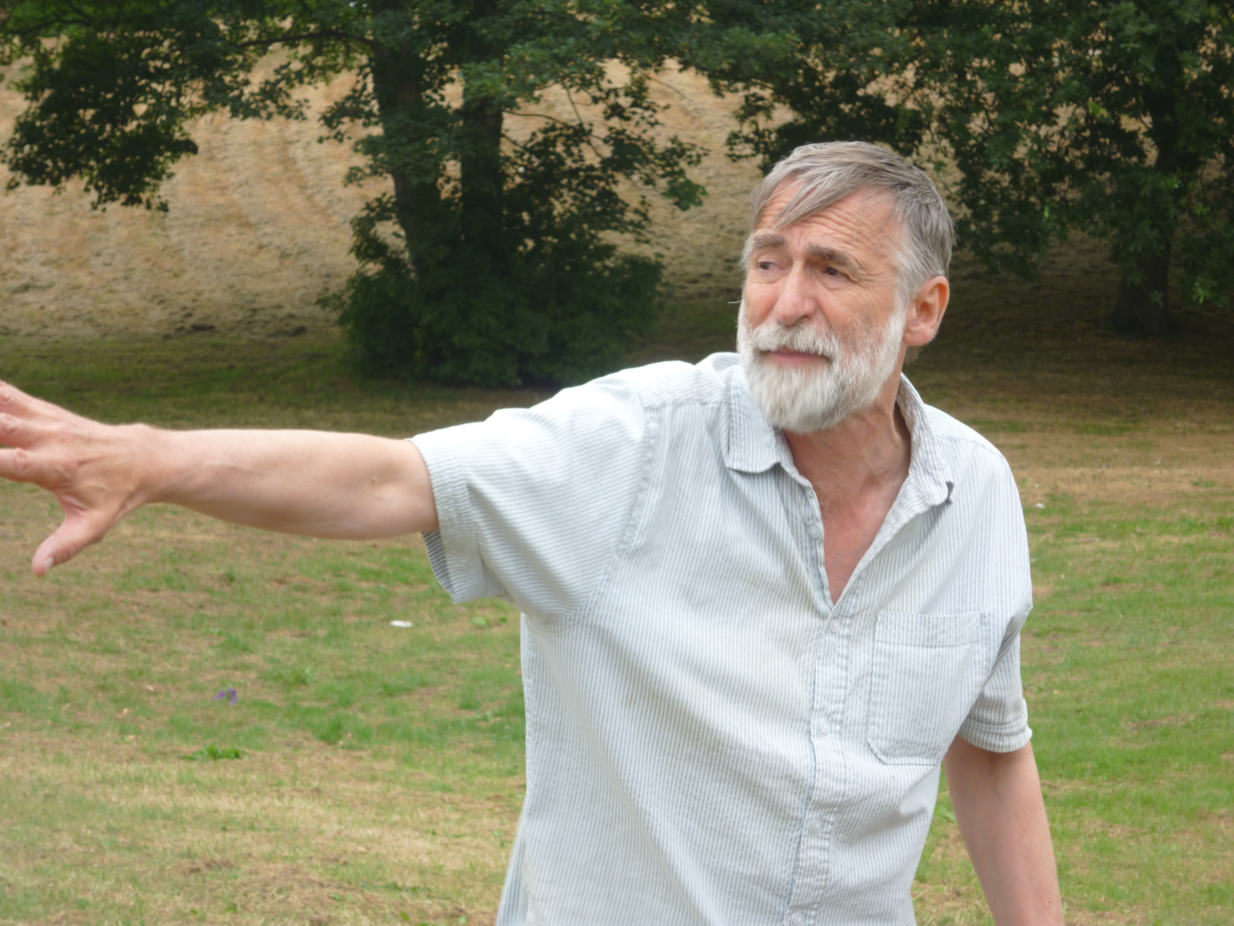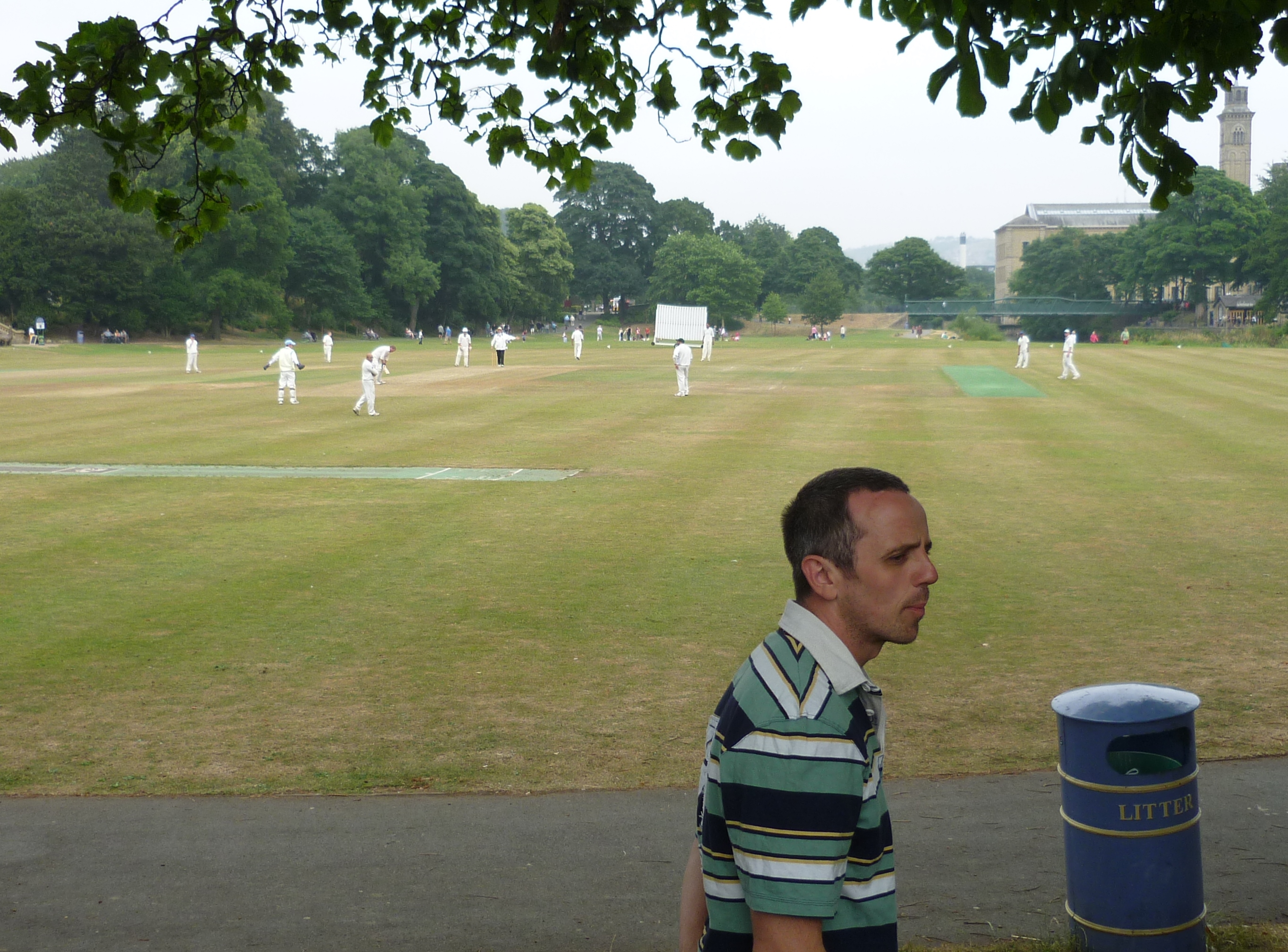 Leaving aside the scary stuff, there’s also the fact that – it being July – there was a lot more cricket on than when we staged the piece in September. In Roberts Park, we several times had to move the “Billy Wizz” moment from where it had been rehearsed – on the bench outside the cricket pavilion – because the benches were full of cricketers! This minor inconvenience was more than offset, however, by the presence of Billy Wizz himself (groundsman Billy Ricketts), who was invariably present watching the games, and would interact briefly with “himself” as Paul came past in role… “Eh up Billy Wizz!” Billy really could be an actor himself, becuase these interventions were always perfectly judged… just enough to “authenticate” the actor as playing a real person who was supportive of what we were doing (Simon’s word – thanks Simon!)… and still more important, Billy’s comic timing was invariably perfect! Miraculous moments all…