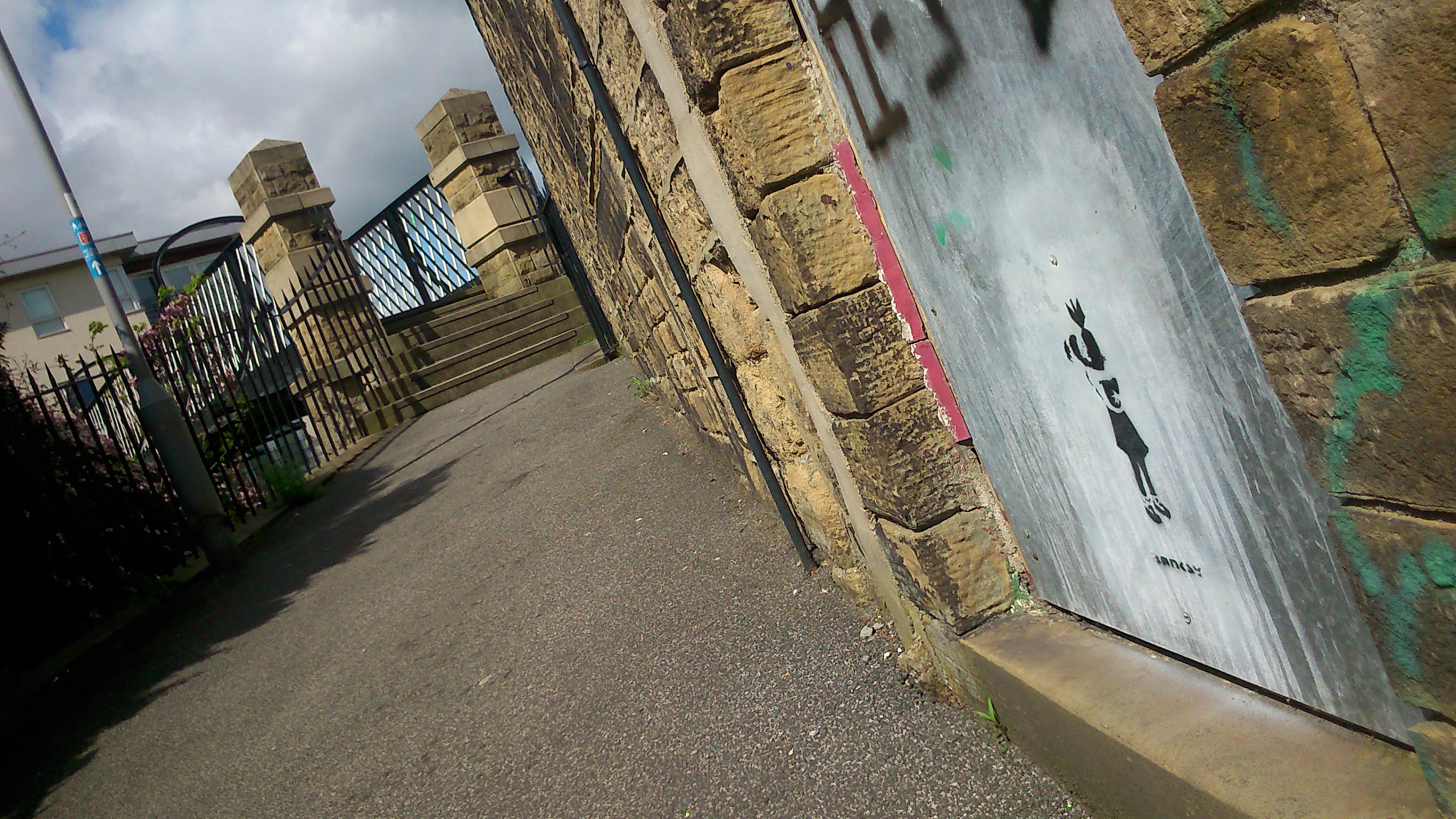 Meanwhile, this impromptu canalbank gallery has been lent celebrity glitter by the appearance of other images apparently stencilled by Banksy – the world’s most famous graffiti artist. A single image recurs three times in the vicinity of Shipley Wharf and Gallows Bridge – the image of a young girl clutching a black flying bomb as if it is a beloved teddy bear. She is waiting for the future to blow up in her face.