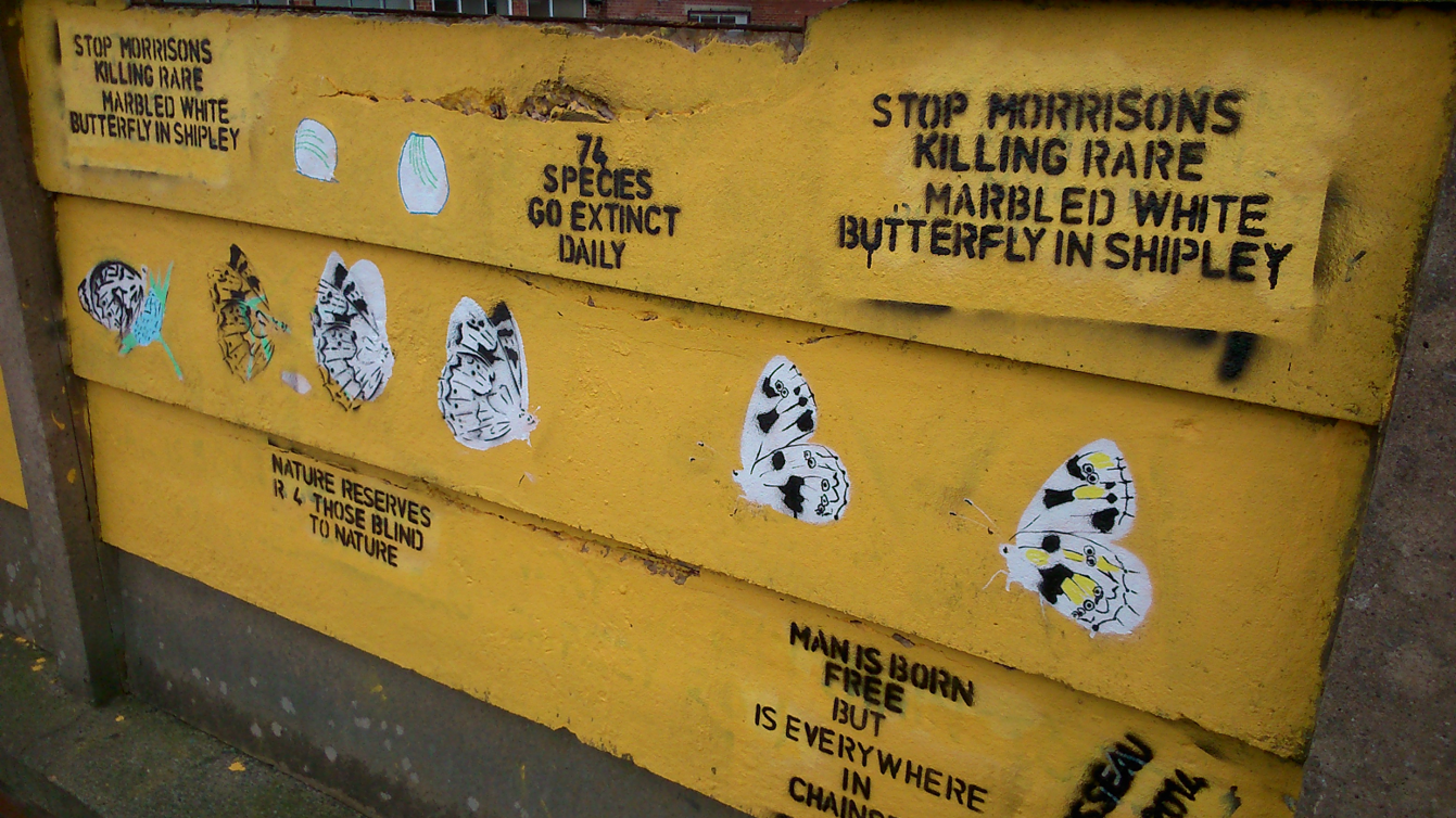 These legends are stencilled in black onto patches of vivid, Morrisons-yellow paint, alongside images of the threatened butterflies. If you look carefully, you can see that somebody – perhaps Bradford Council – has attempted to paint over the offending text in a slightly different yellow, while leaving the decorative butterflies to beautify the dull grey walls. Not to be silenced, the protestors have returned to reapply the stencils.