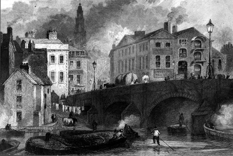 In the fifteenth century, when Bradford barely existed as a concept, Leeds – twelve miles downstream along the Aire — was already the centre of Yorkshire’s woollen trade. Leeds Bridge, a mighty stone bridge that had spanned the Aire at the bottom of Briggate since the mid-14th Century, was the site of the Leeds Cloth Market. For a matter of centuries, every Tuesday and Saturday, cloth merchants would come from south and north of the river to display their wares on the bridge’s stone parapets…
